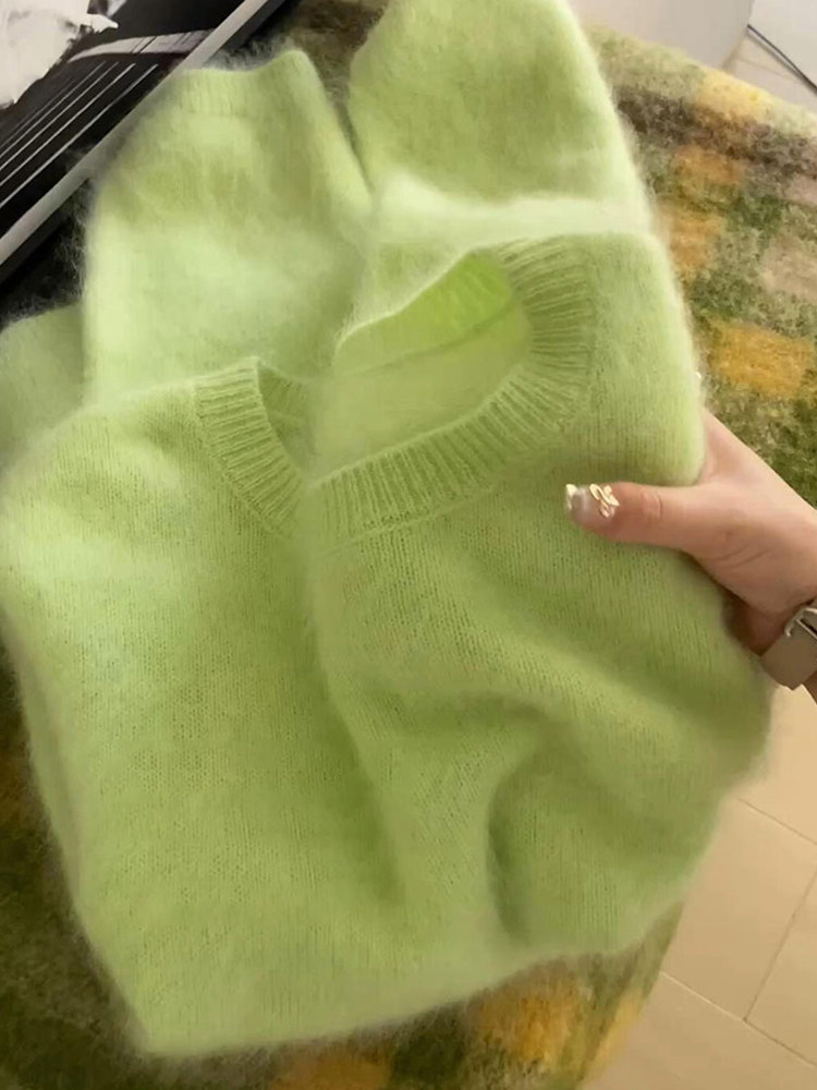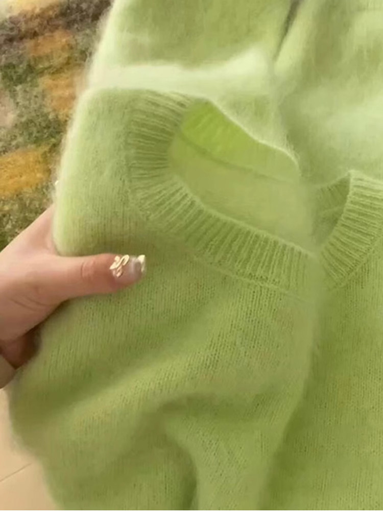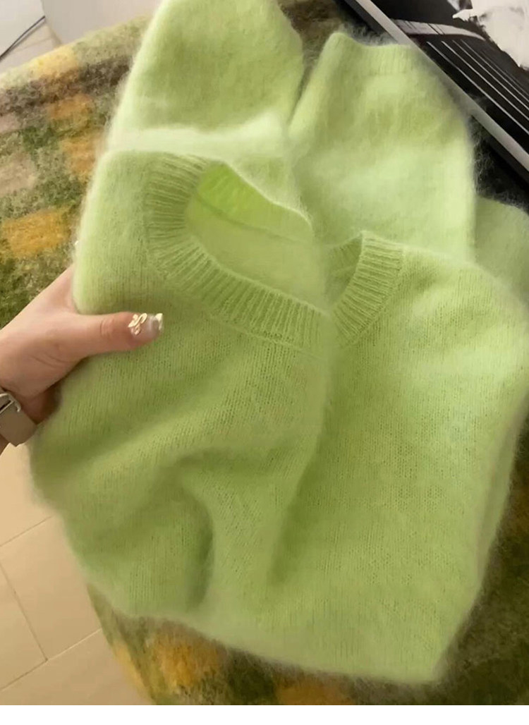Lazy Style Green Mohair Round Neck Sweater for Women, Autumn and Winter Soft and Loose Knitwear with a High-End Feel, Outerwear Top