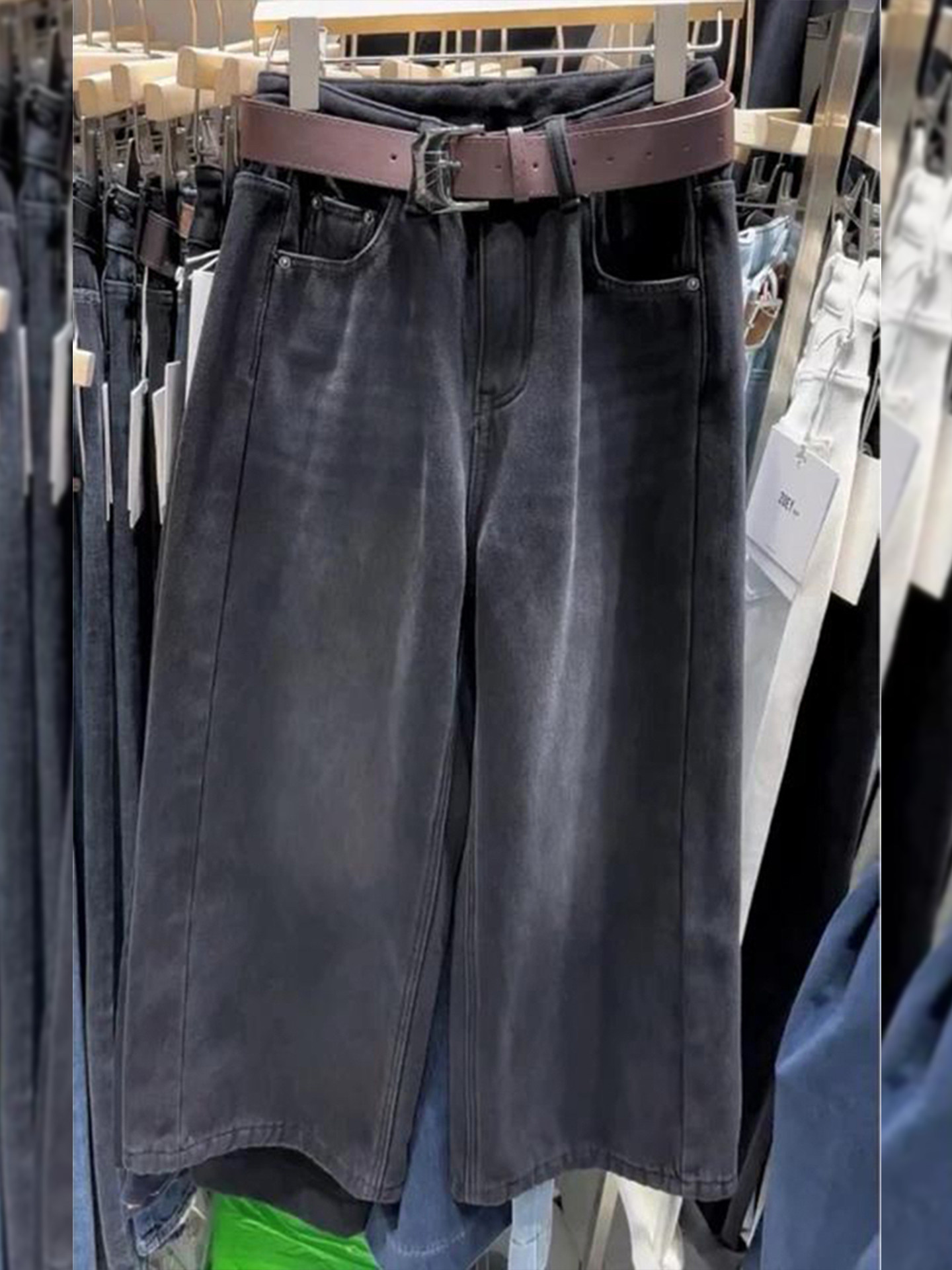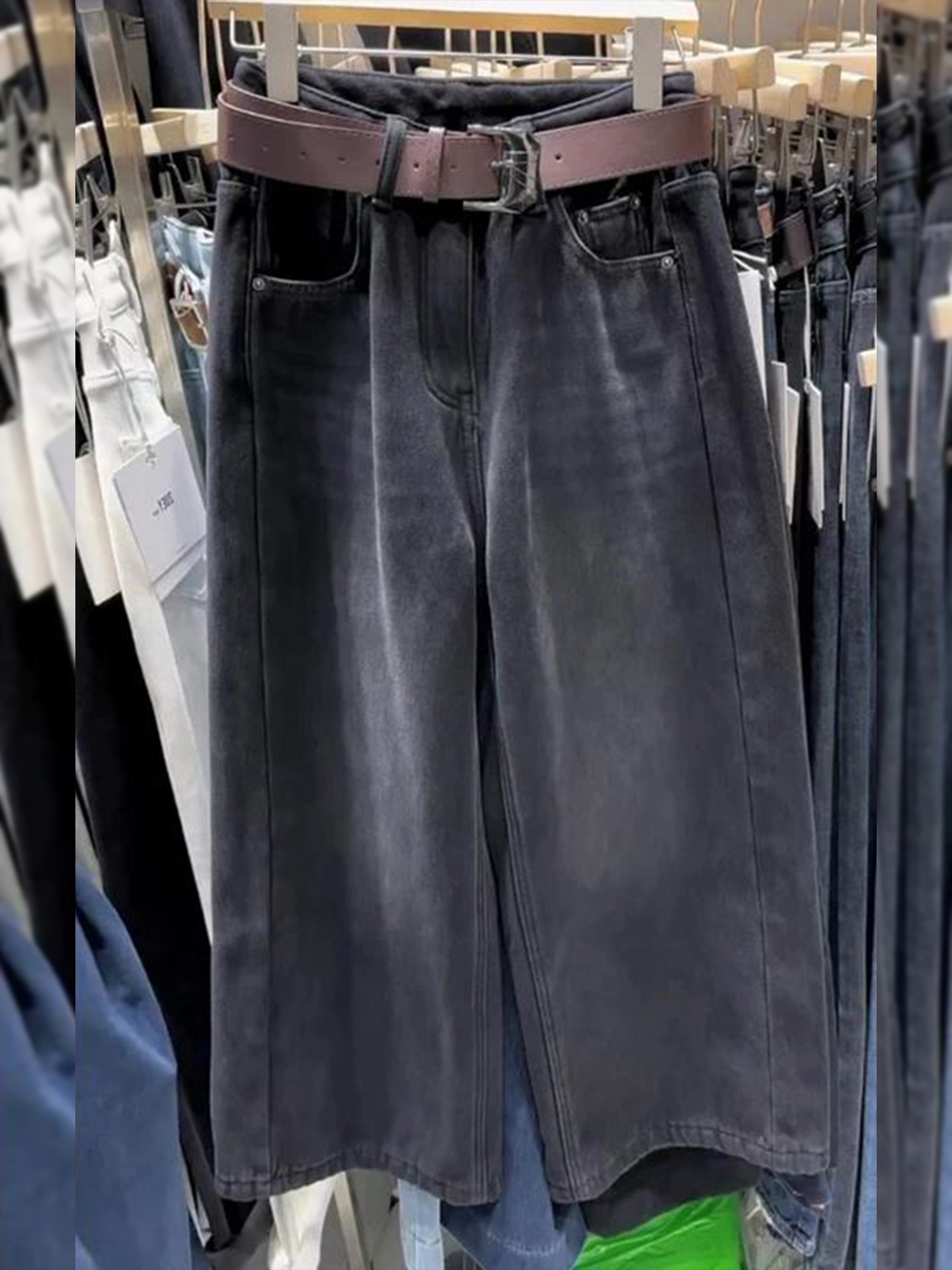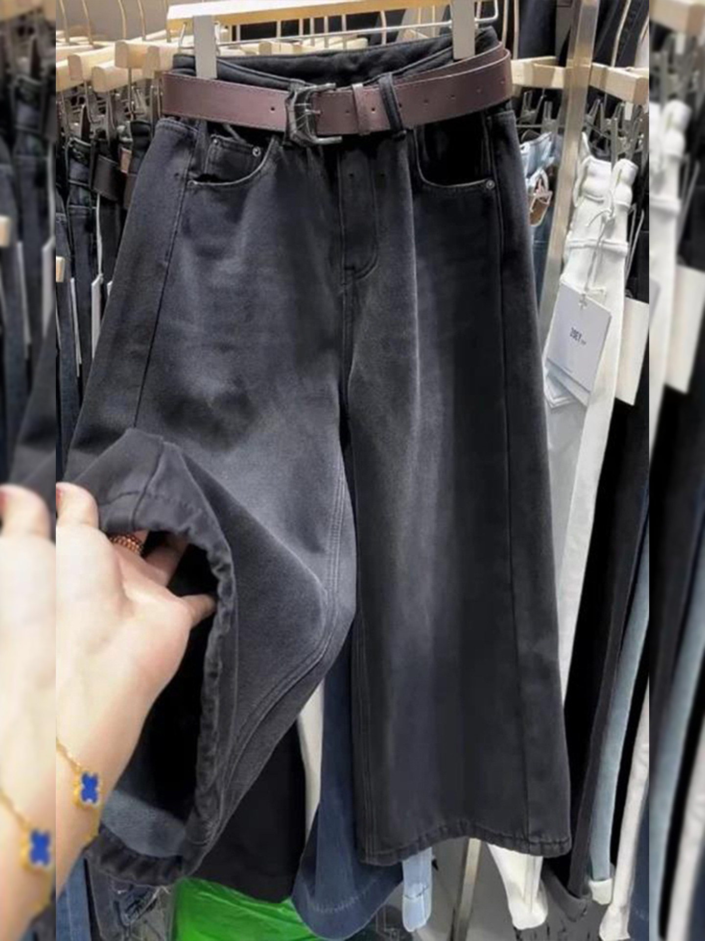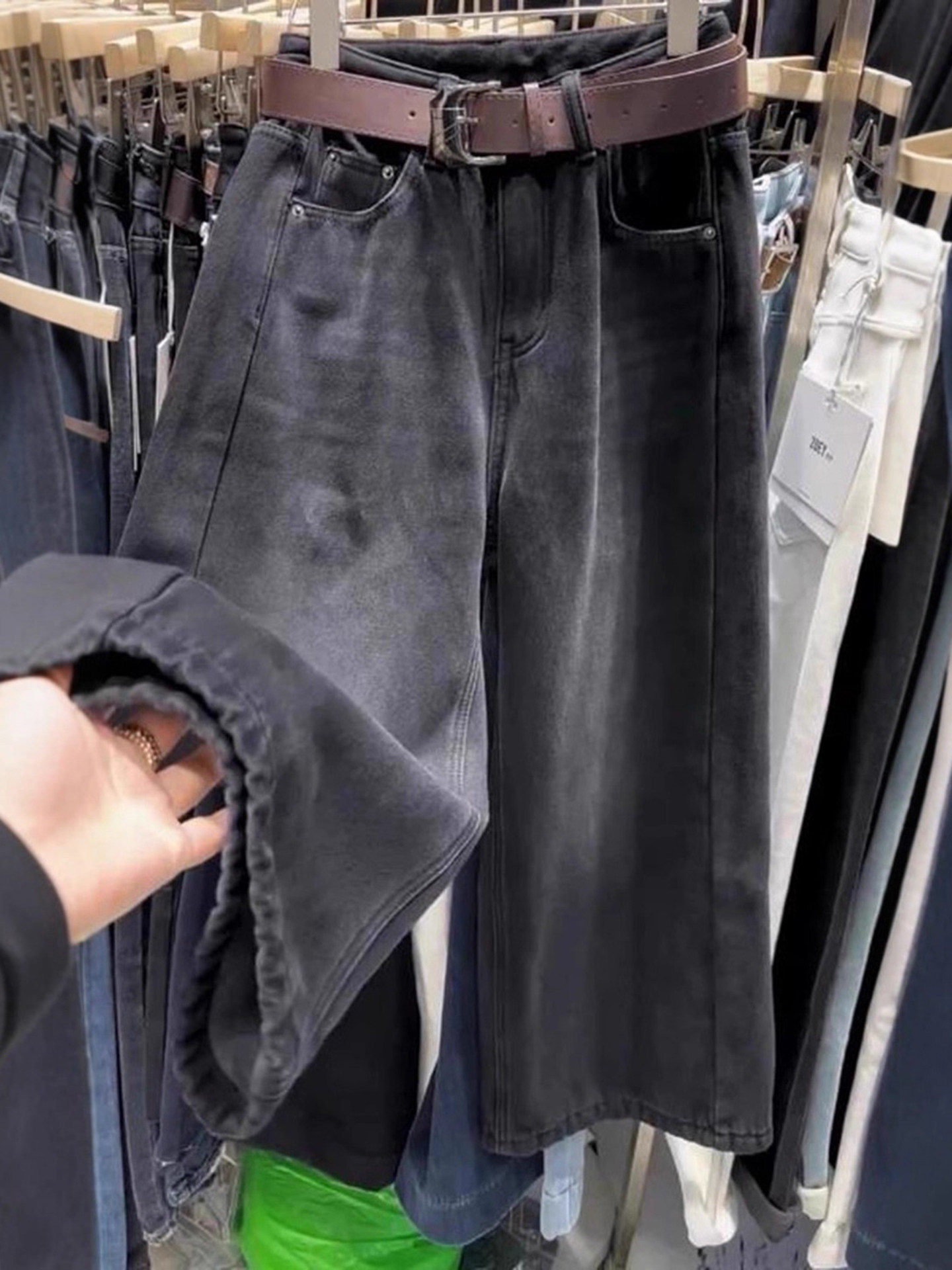 Black and gray straight jeans for women in autumn and winter new large size fat mm plus velvet thickened loose slimming eight-point wide-leg pants