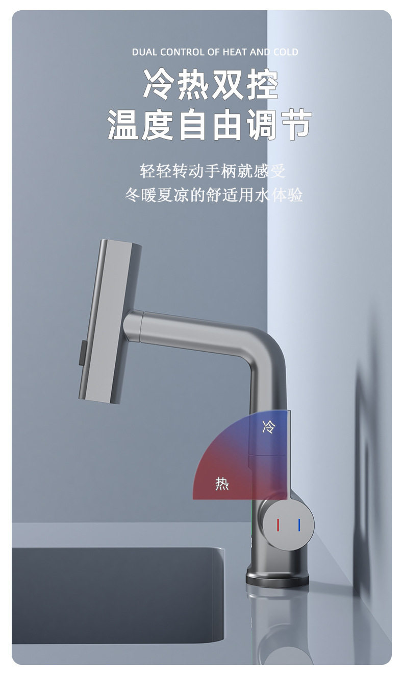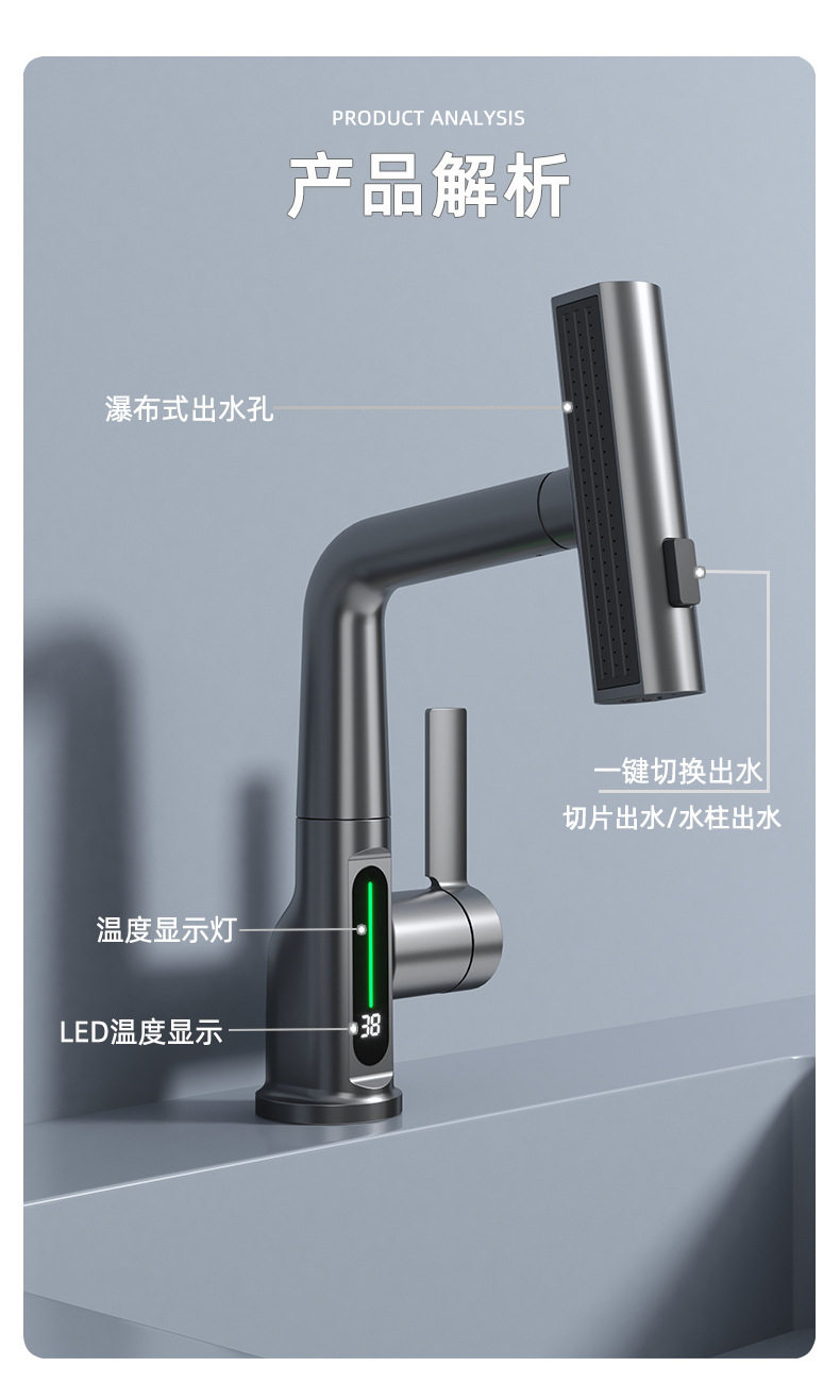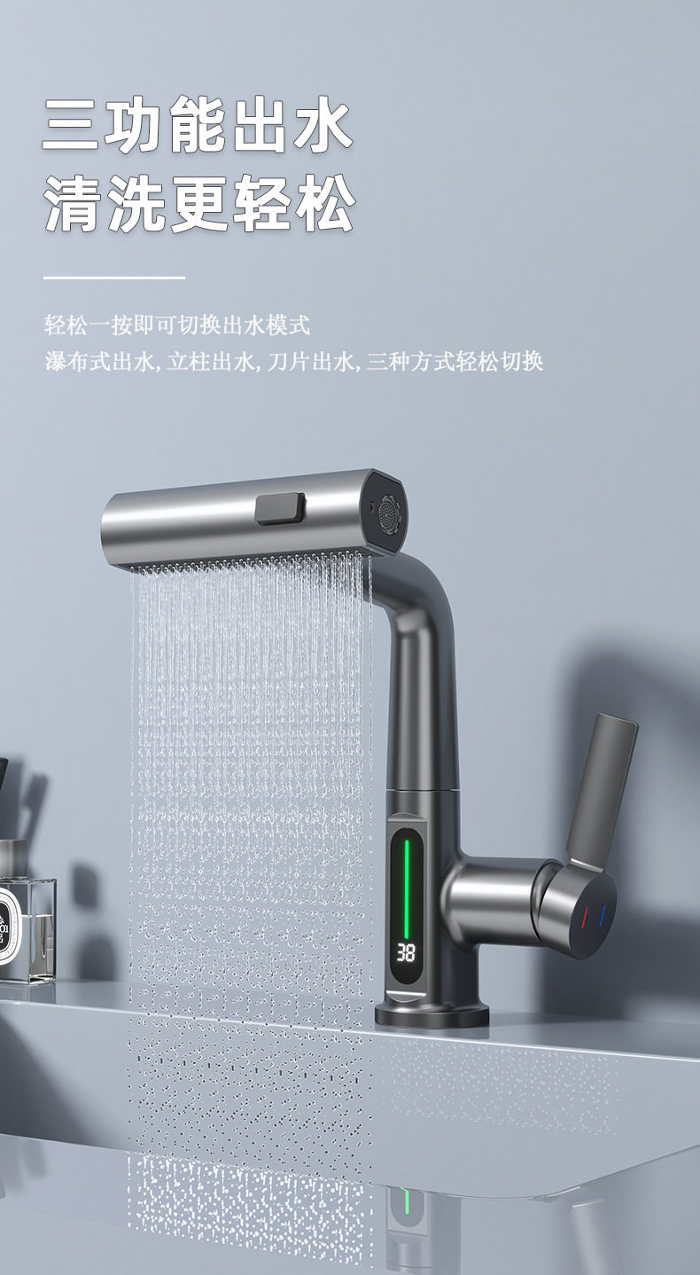 Sort by color Gun Ash digital waterfall pull-out three-outlet faucet,Silver digital waterfall pull-out three-outlet faucet,White digital waterfall pull-out three-outlet faucet,Black digital waterfall pull-out three-outlet faucet,Basin faucet
