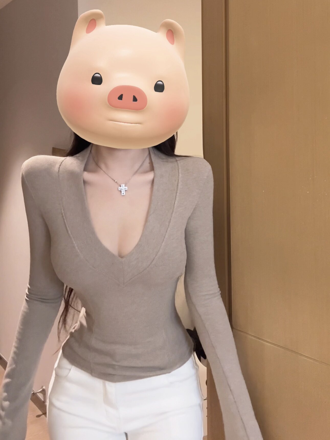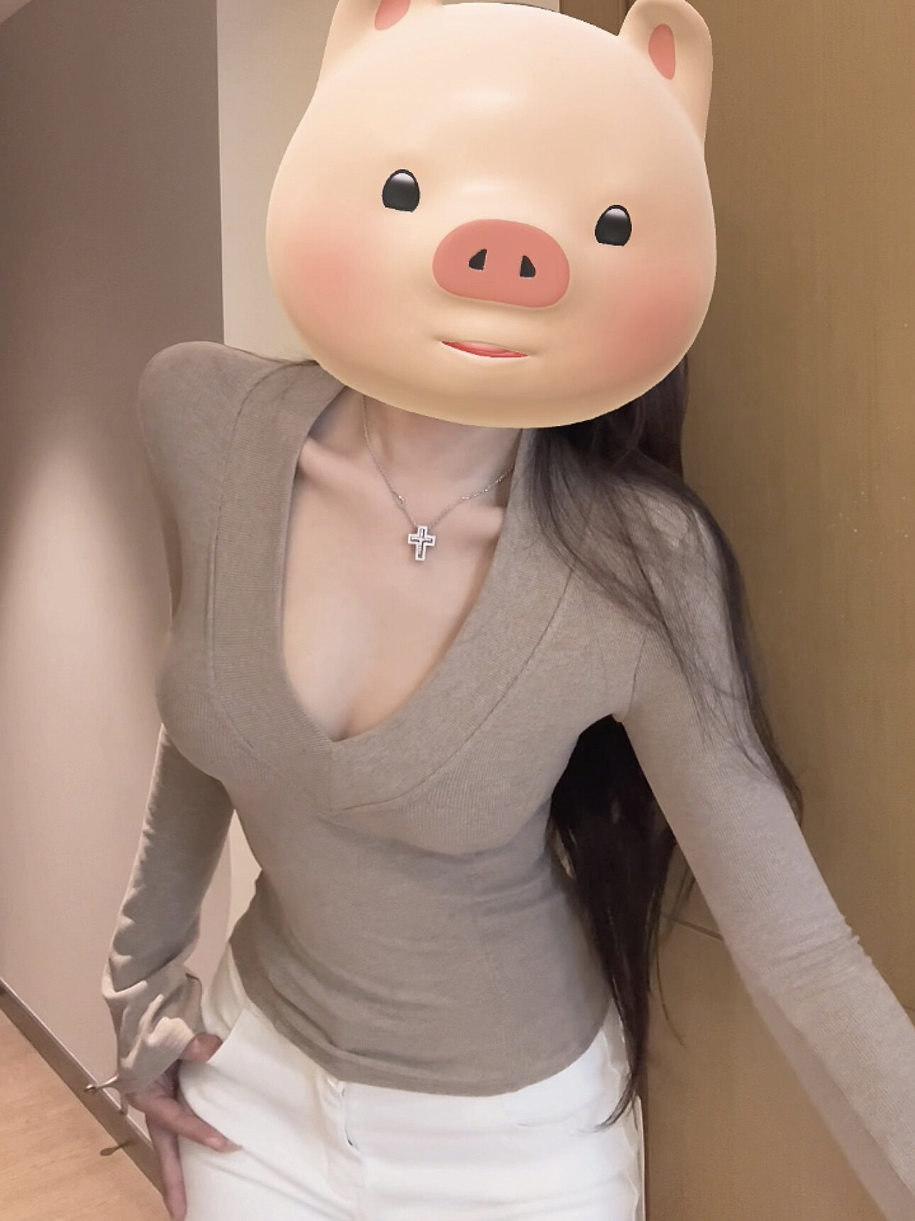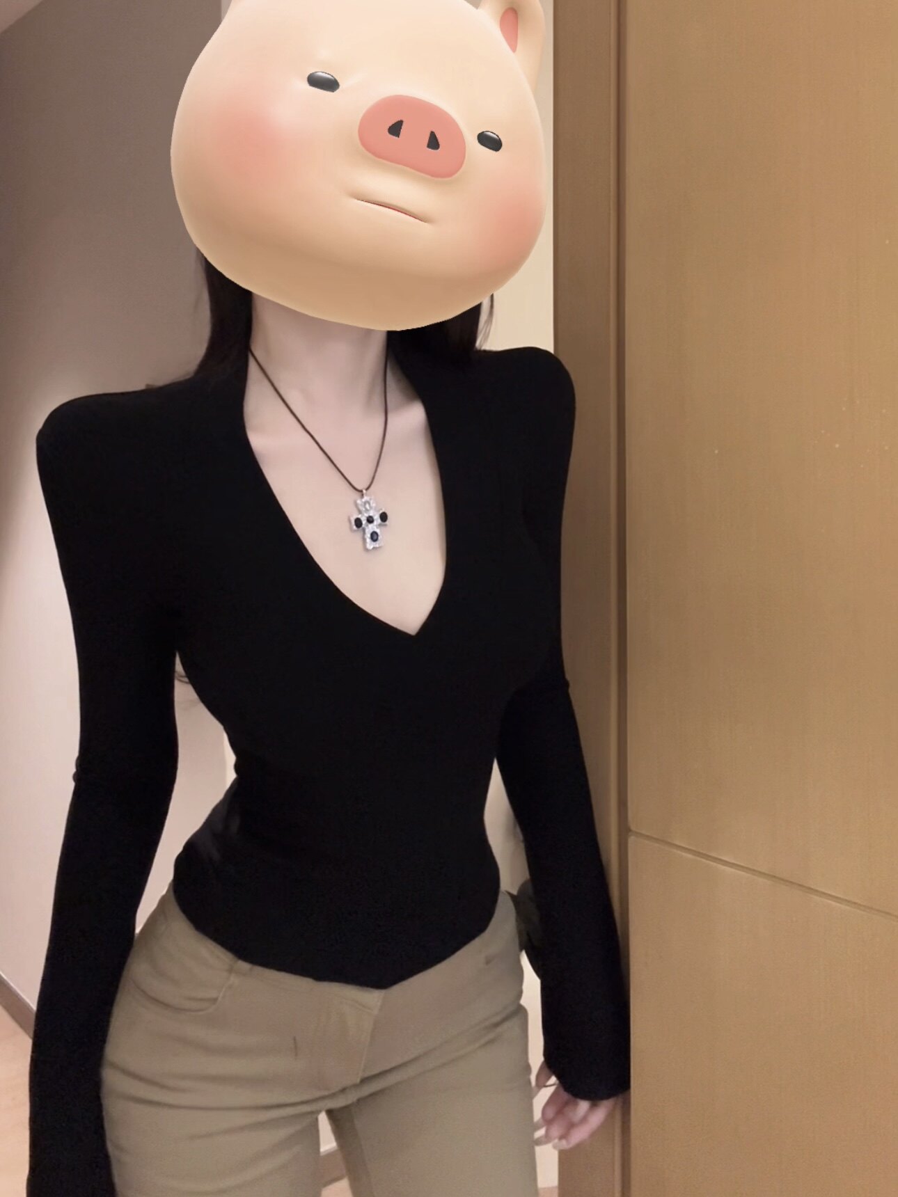 Hong Kong Style Mature V-Neck Flared Long-Sleeve T-Shirt for Women, Autumn and Winter Pure Desire Sexy Fishbone Waist-Cinching Regular Shoulder Base Layer Top