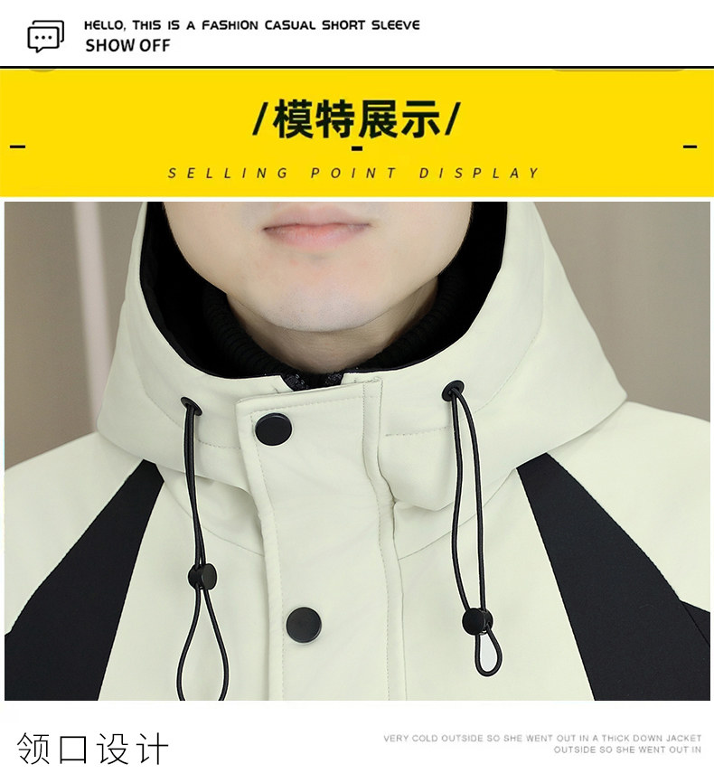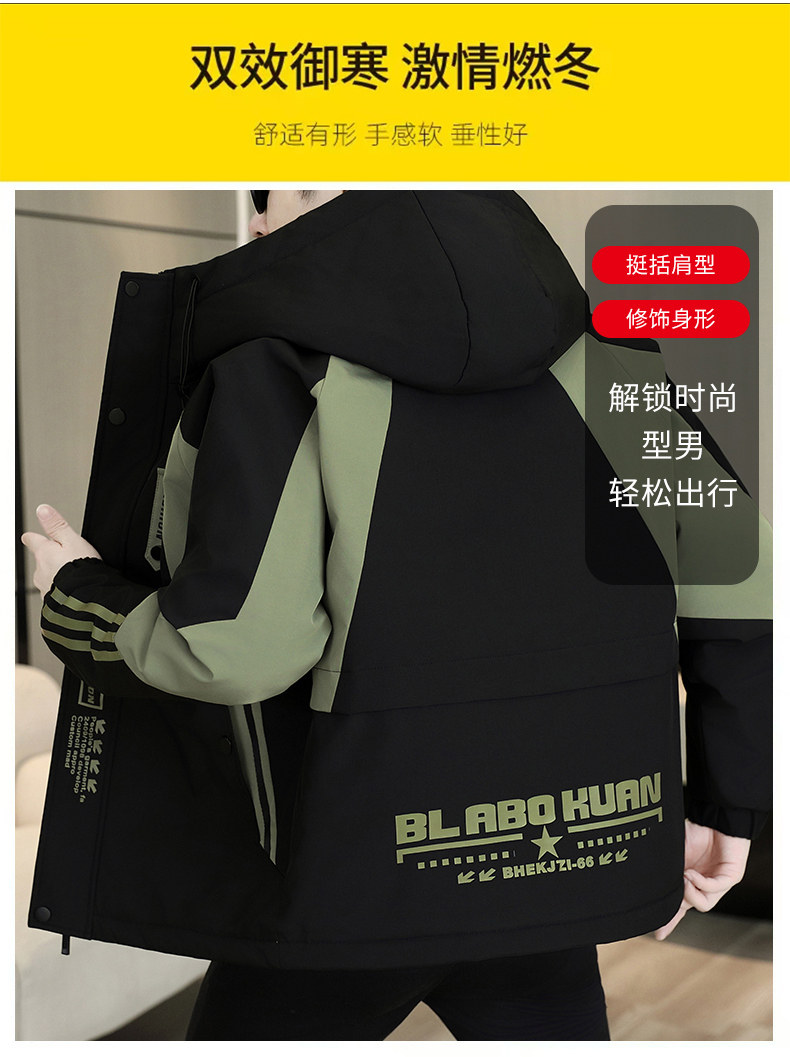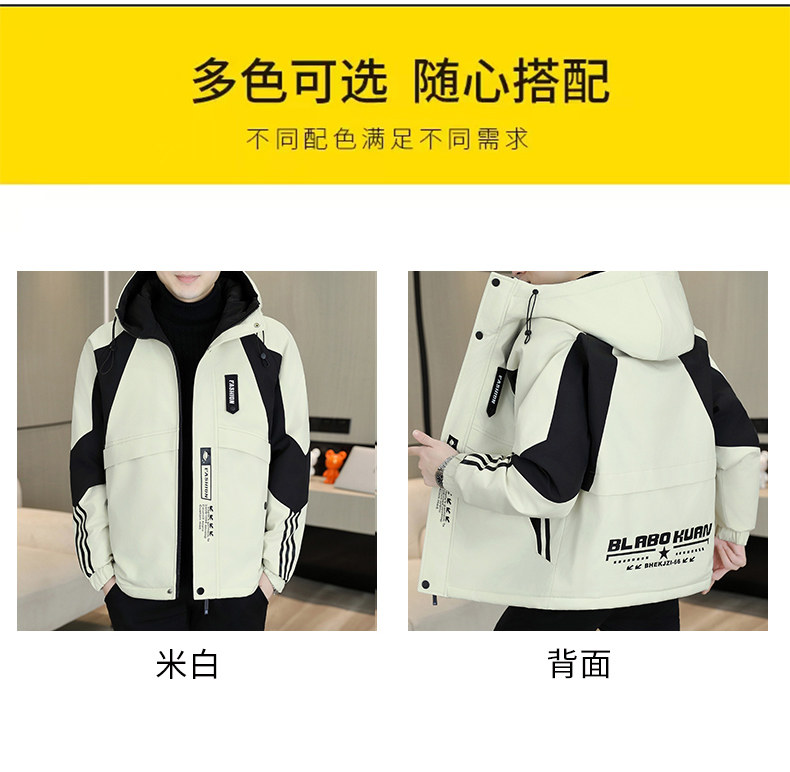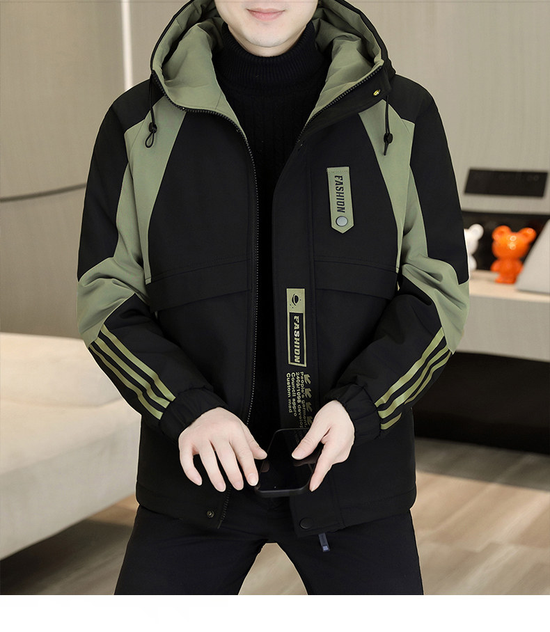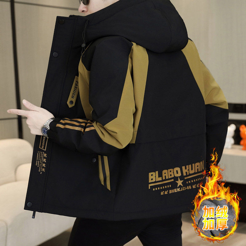 Plush jacket men's winter hooded thickened warm work jacket teenagers trendy casual contrast color parka cotton jacket