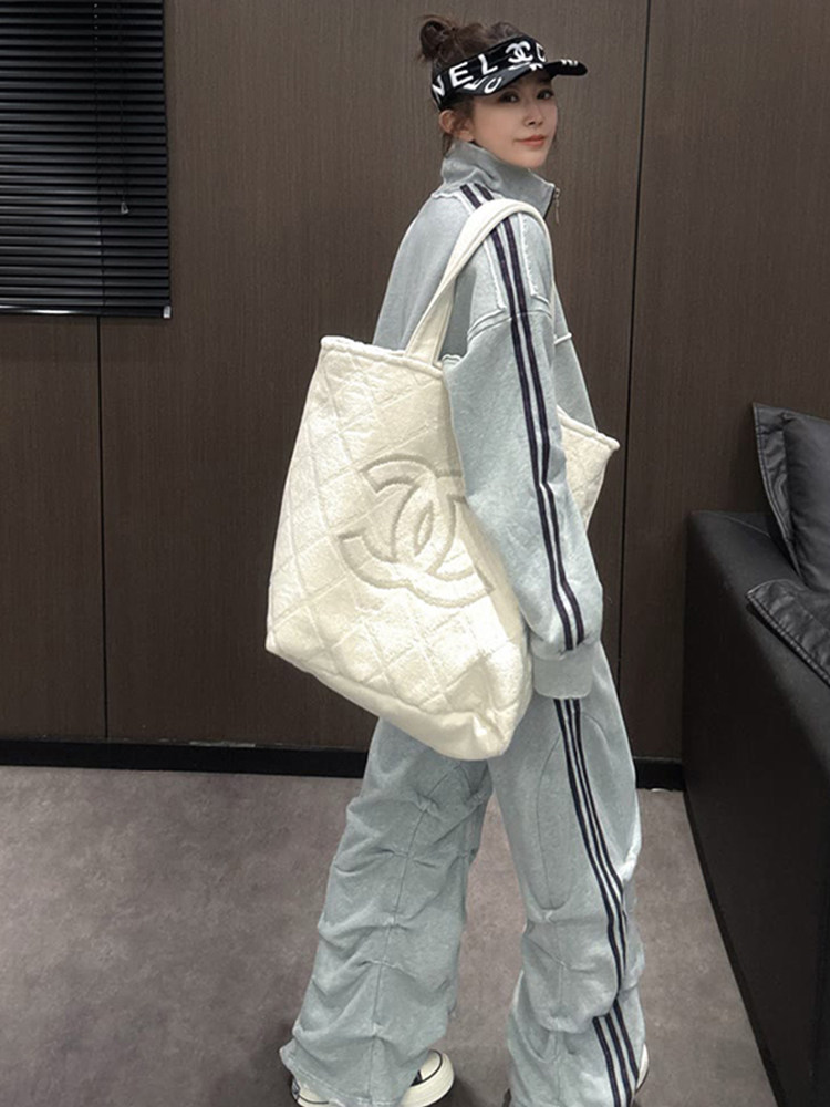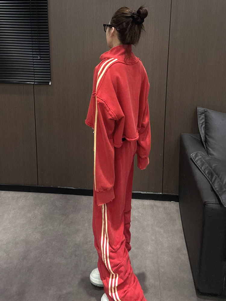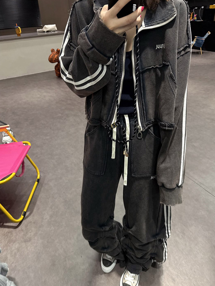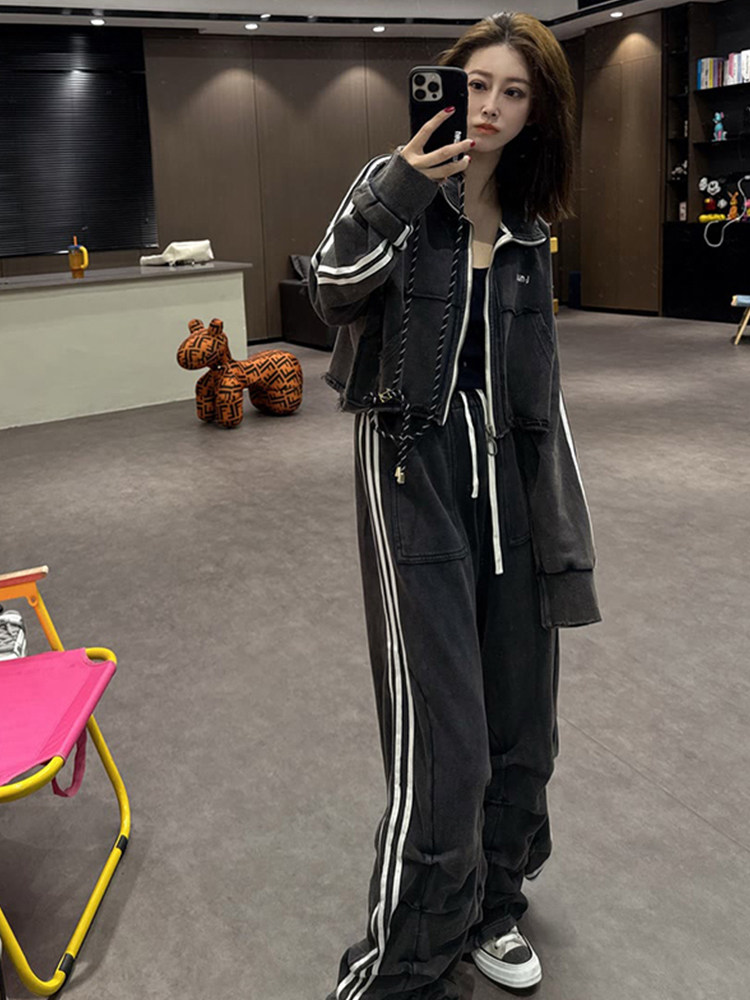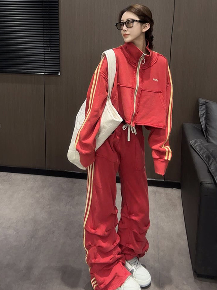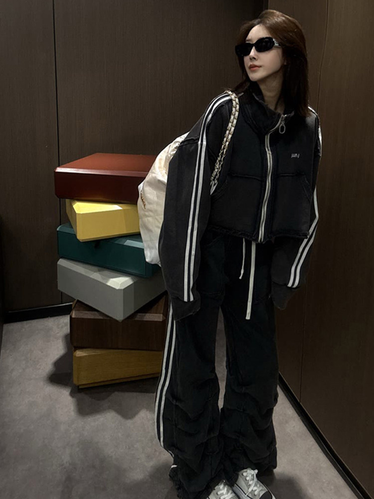 Fashion two-piece set trendy european station 2025 autumn new american casual versatile stand-up collar top elastic waist trousers