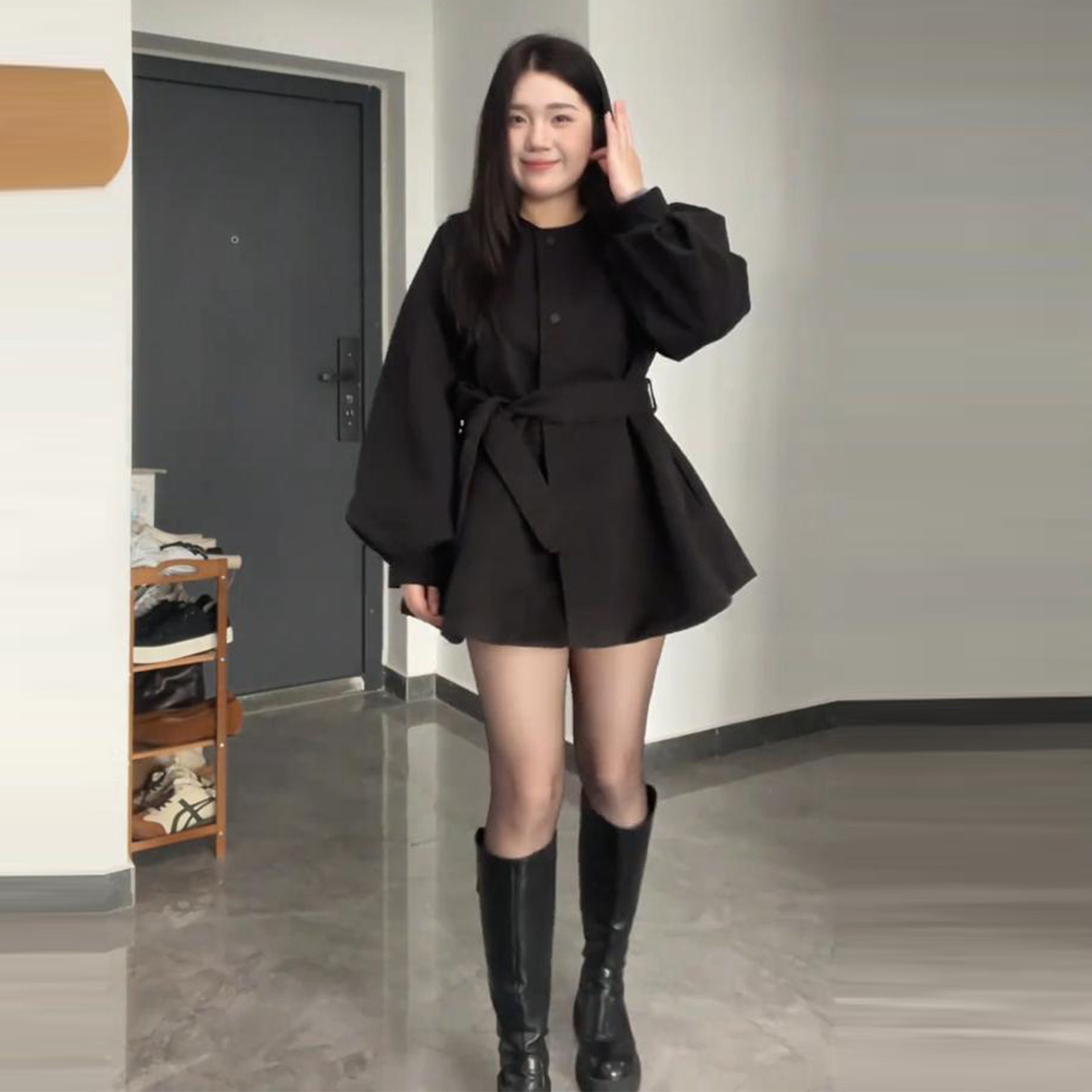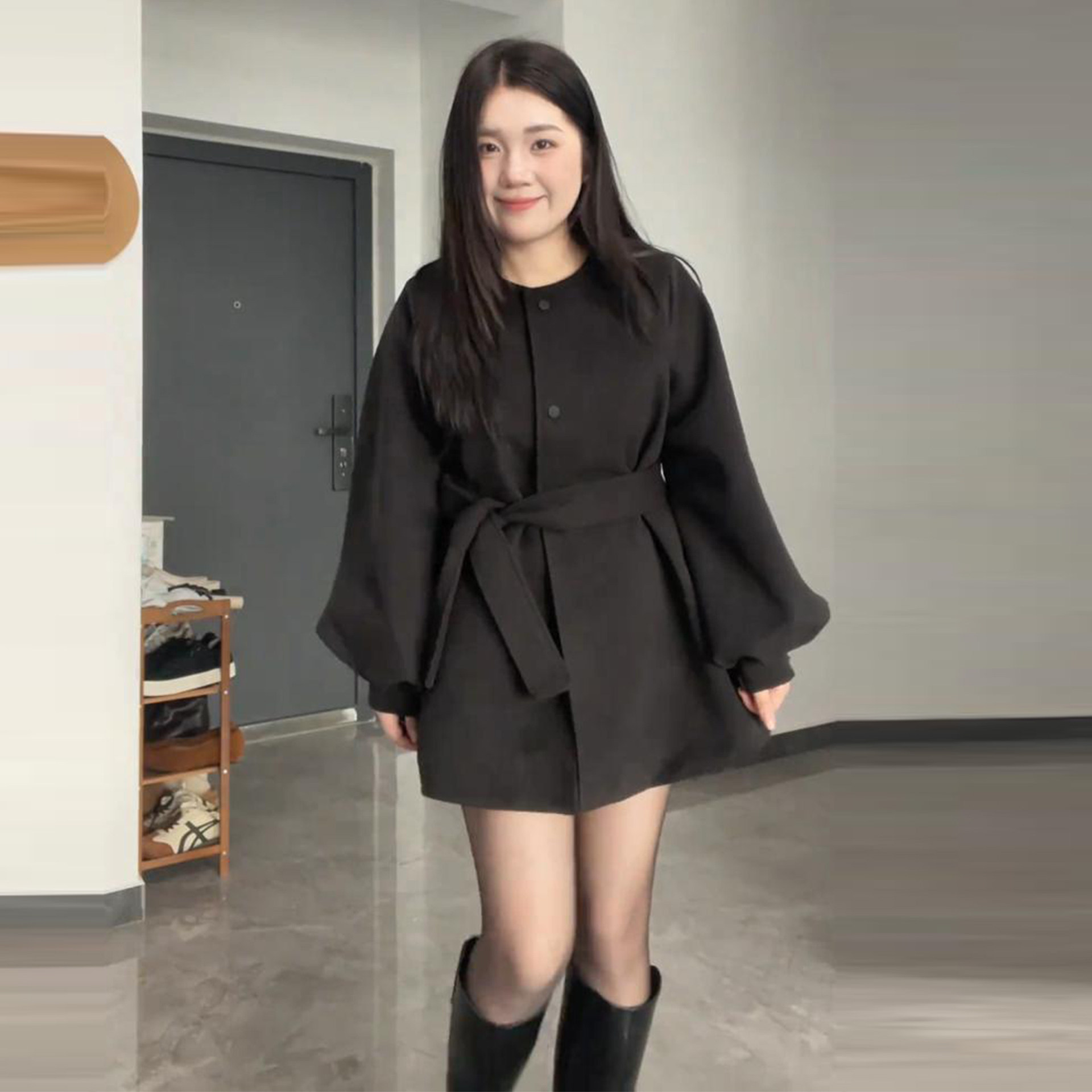Plus-Size Hepburn-Style Lantern Sleeve Padded Woolen Coat for Women, Winter Slim-Fit Waist-Cinching Coat for Petite Figures
