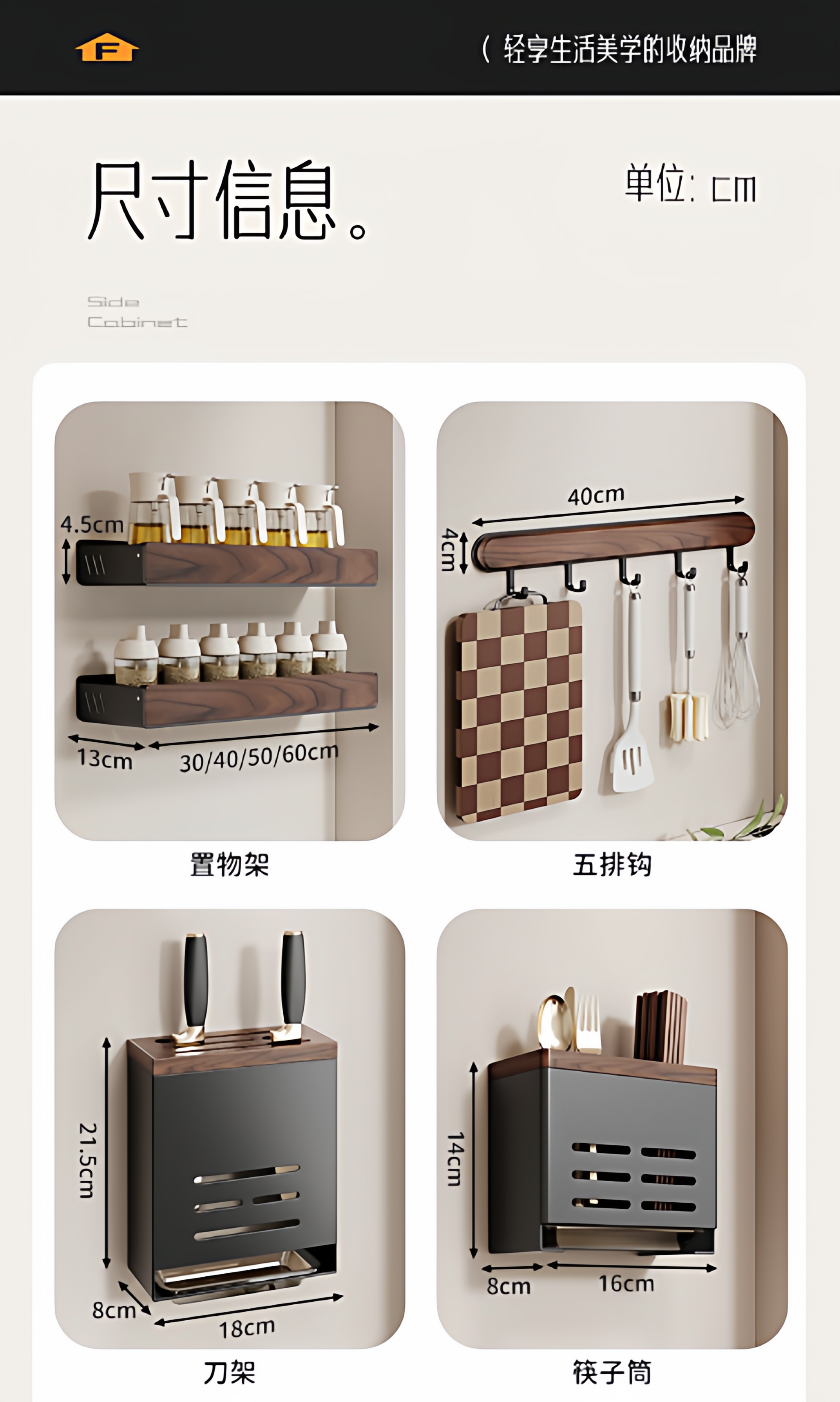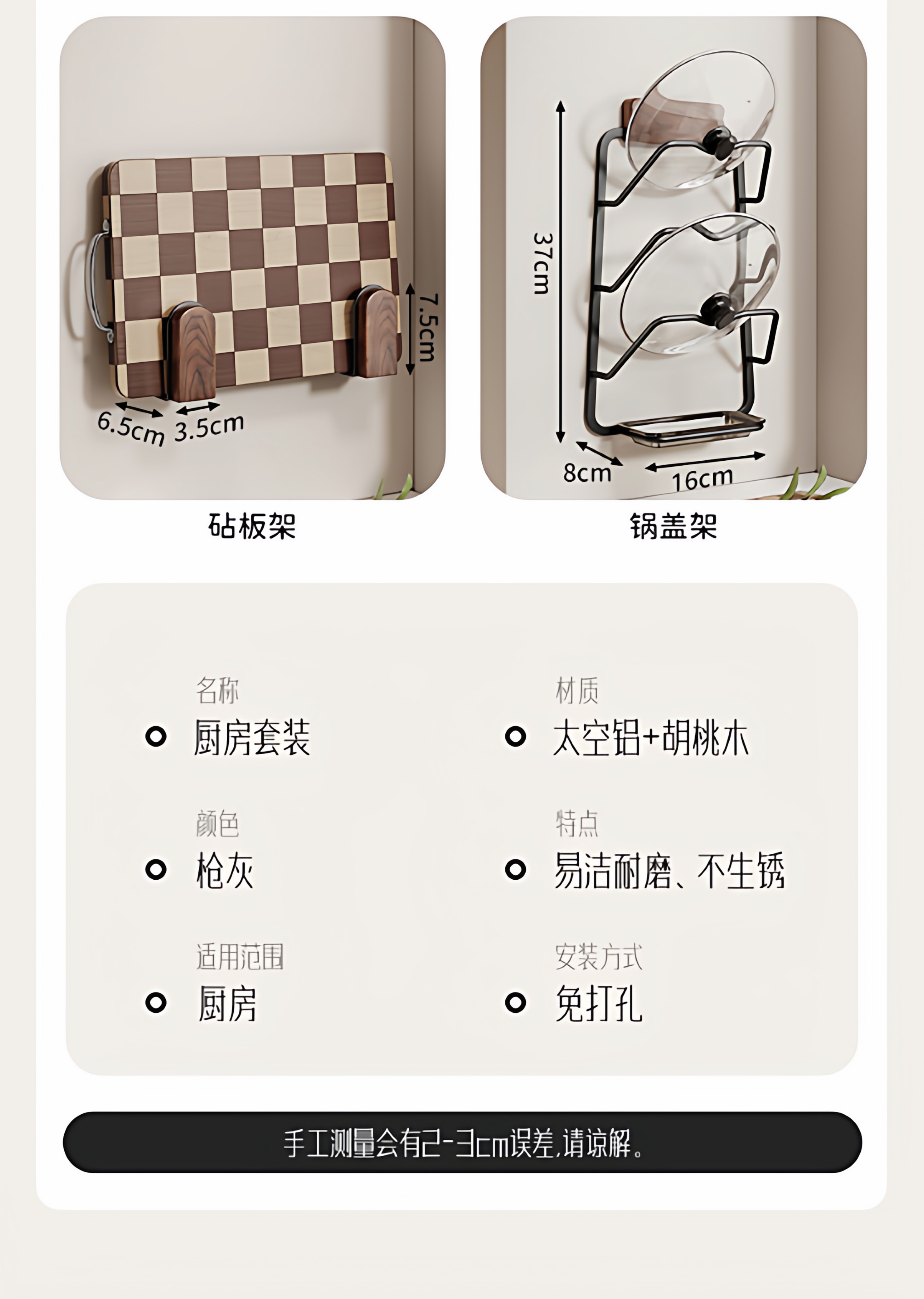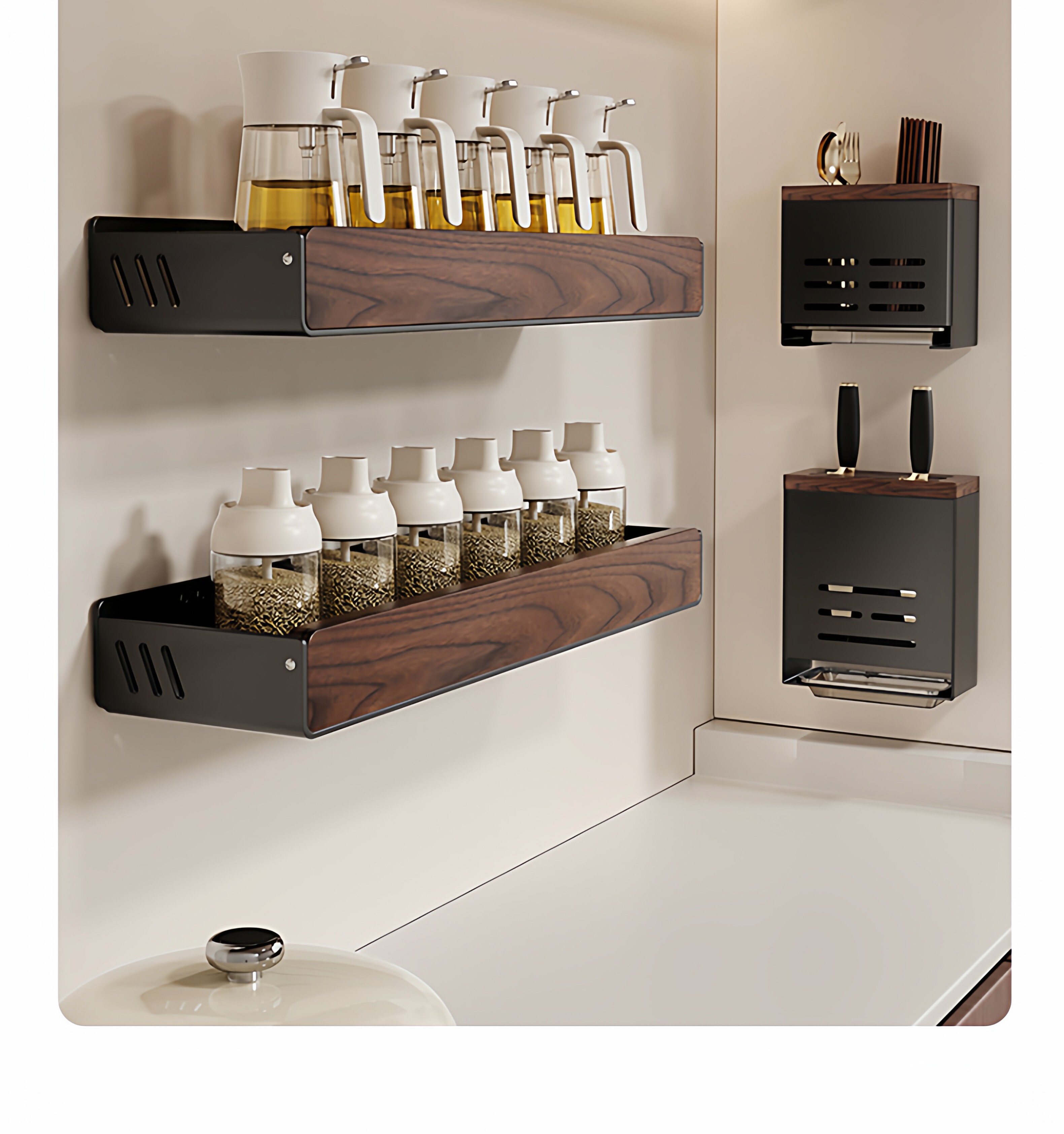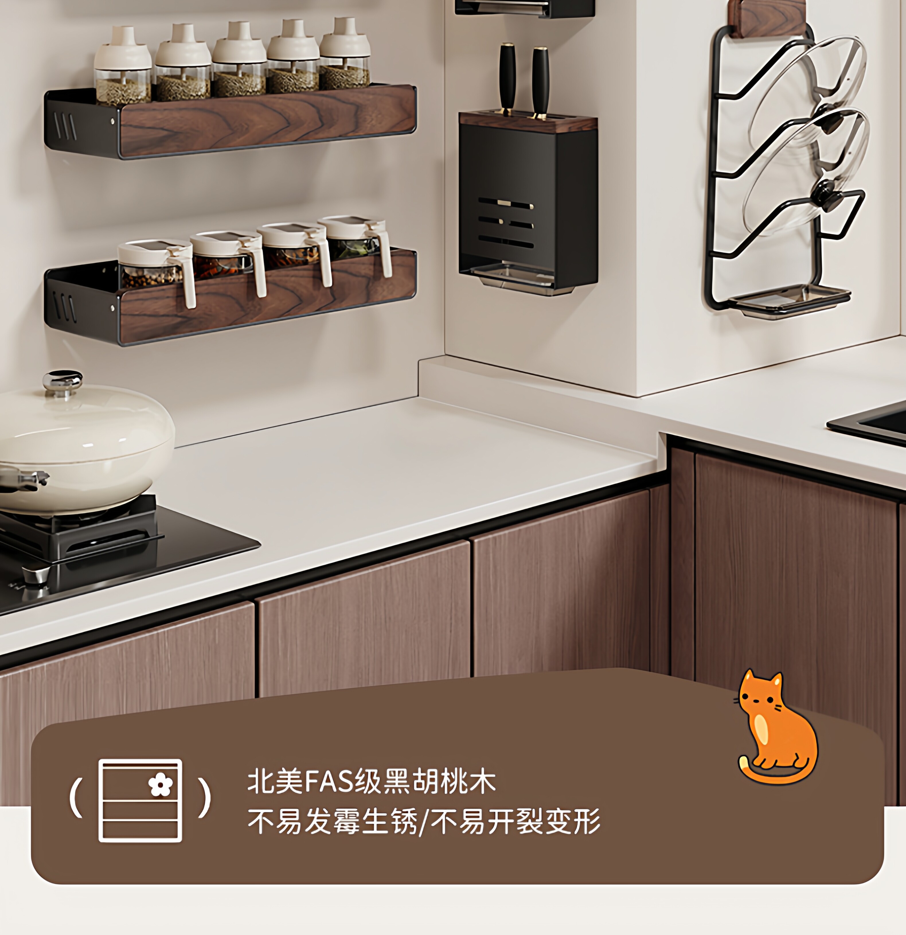 French Ziwoo Walnut Kitchen Storage Rack, No-Drill Solid Wood Pot Lid, Knife, Chopsticks, Spoon, Seasoning, Oil Pot Wall-Mounted Rack