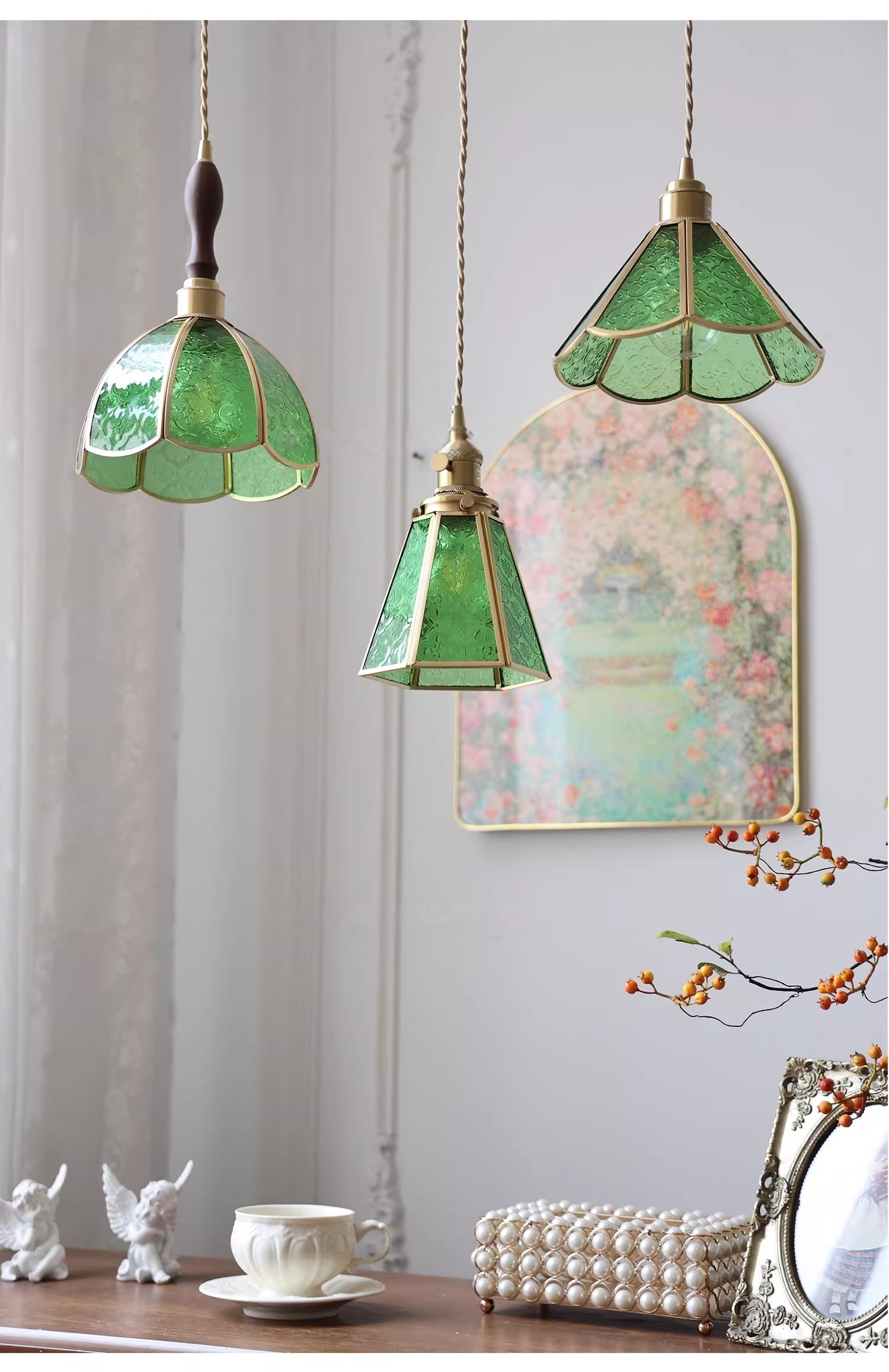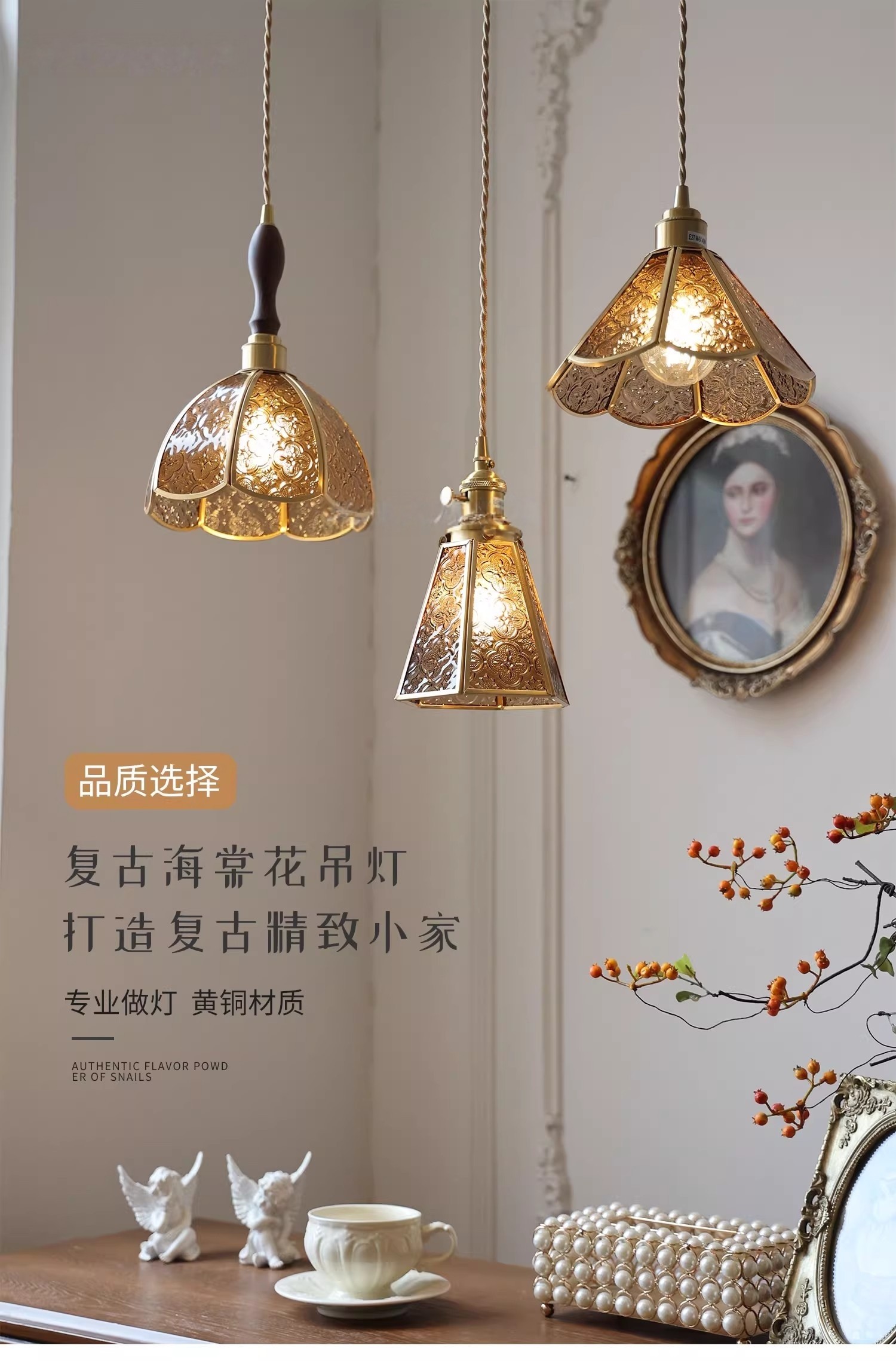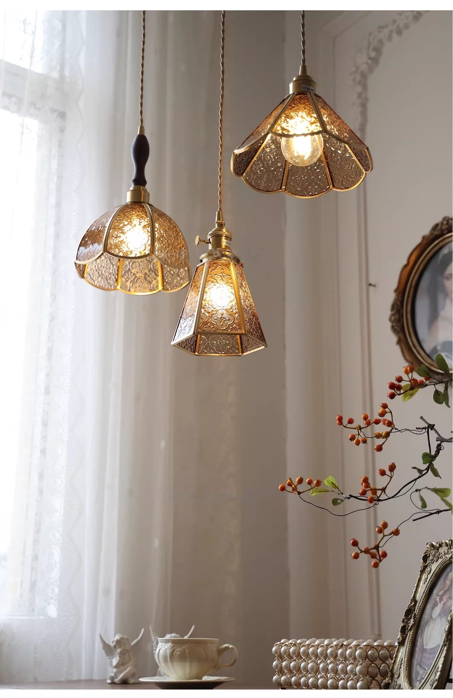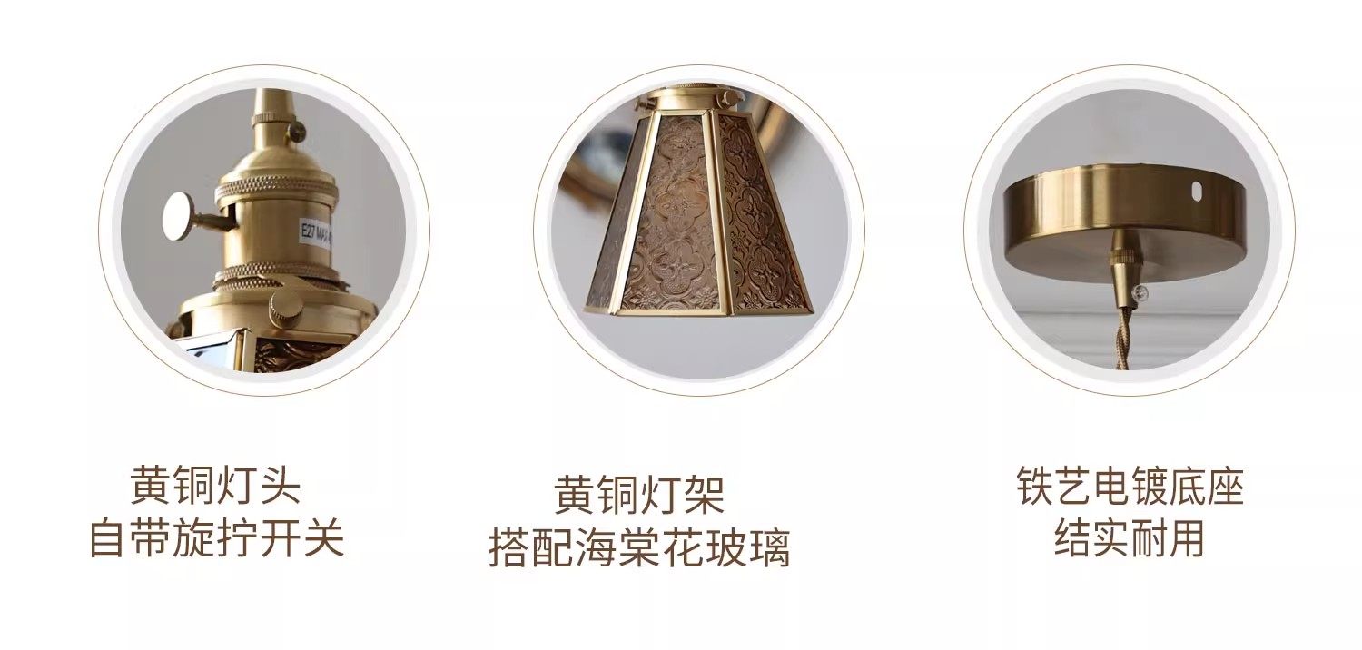 Vintage Style Old Shanghai Retro Brass American-Style Begonia Flower Glass Chandelier for Bedside, Hallway, Cafe, and Window Lighting