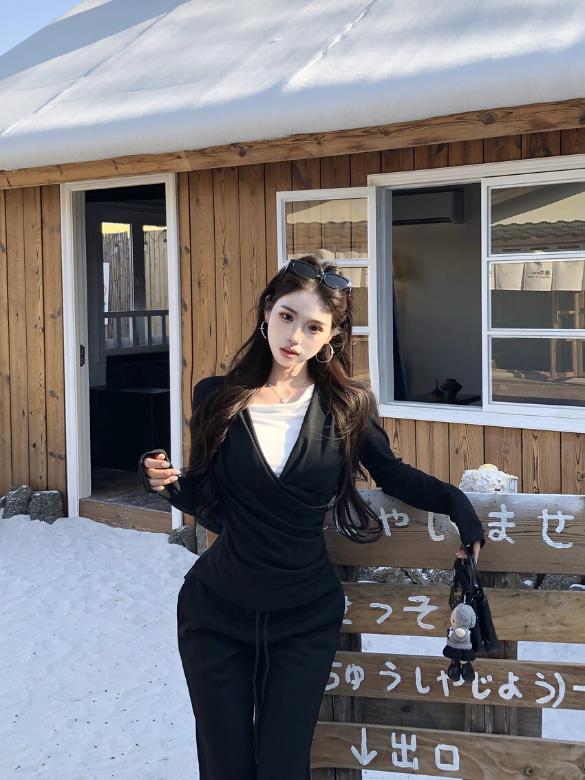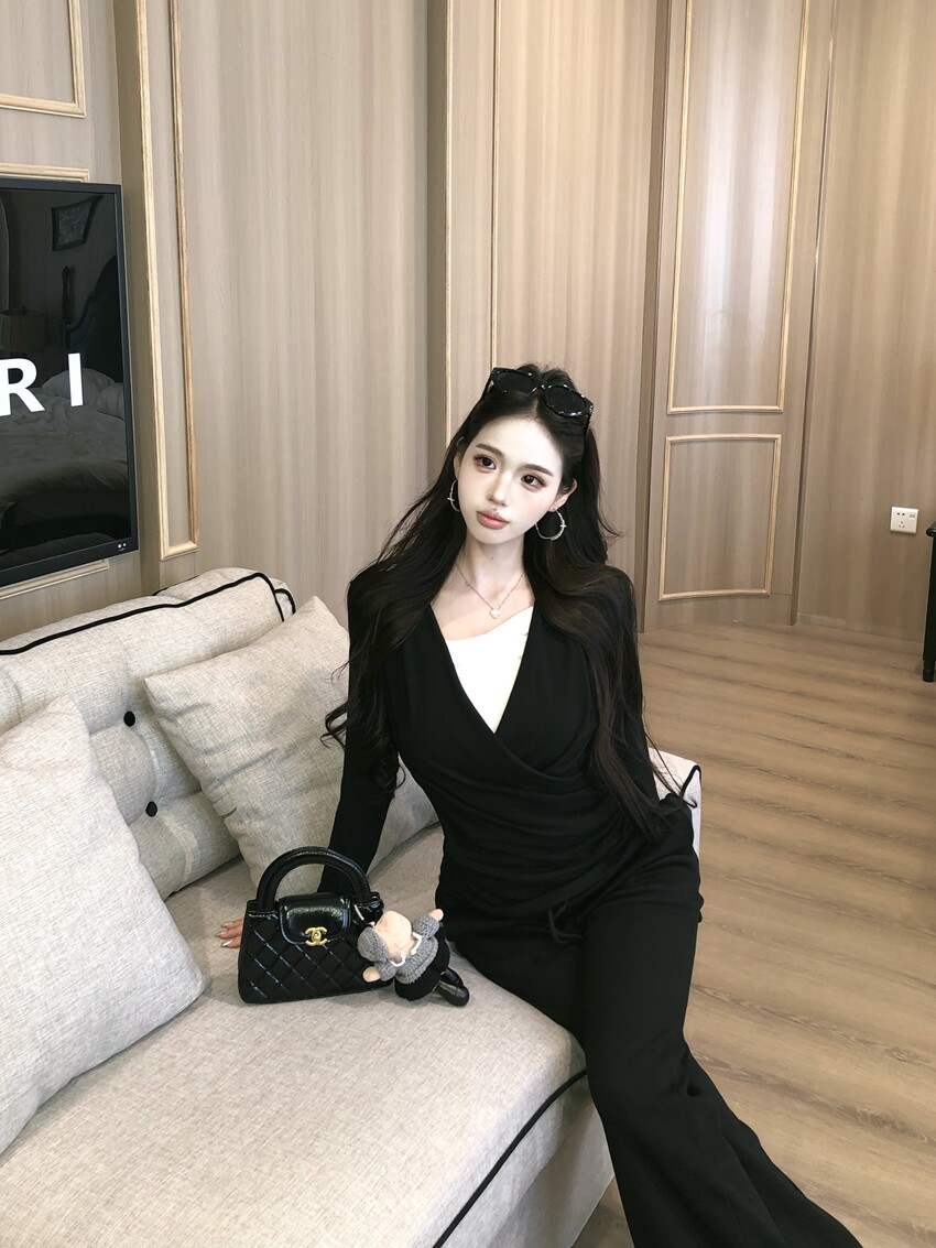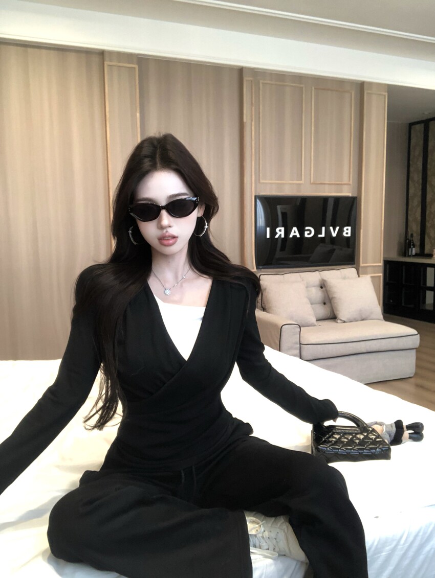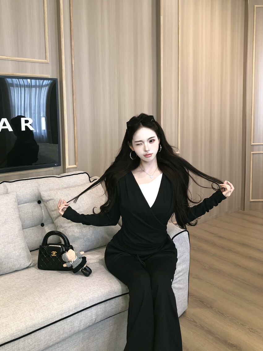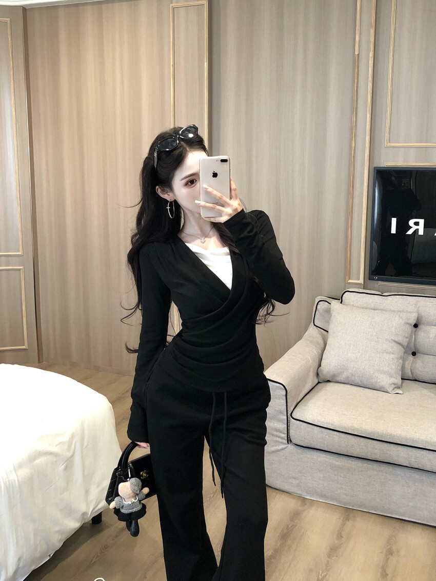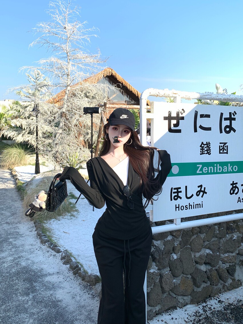 Fake Two-Piece Color-Blocked Long-Sleeve Base Shirt for Women, Autumn and Winter American Style Layered Wear with Thin Fleece, Slim Fit and Flattering Inner Top