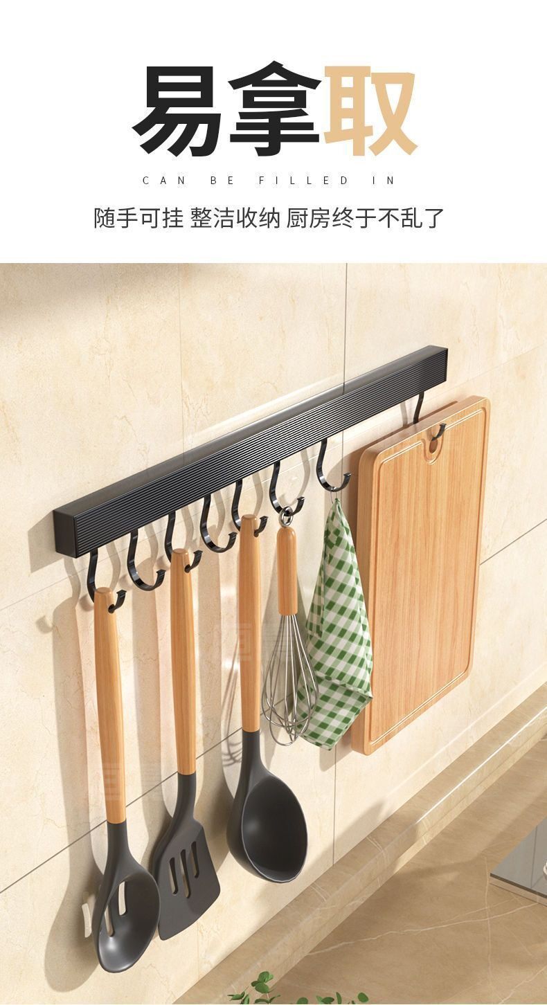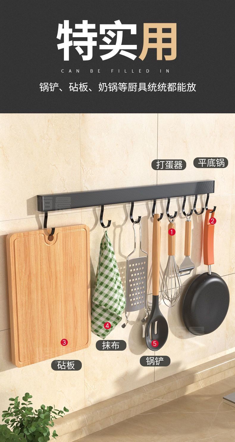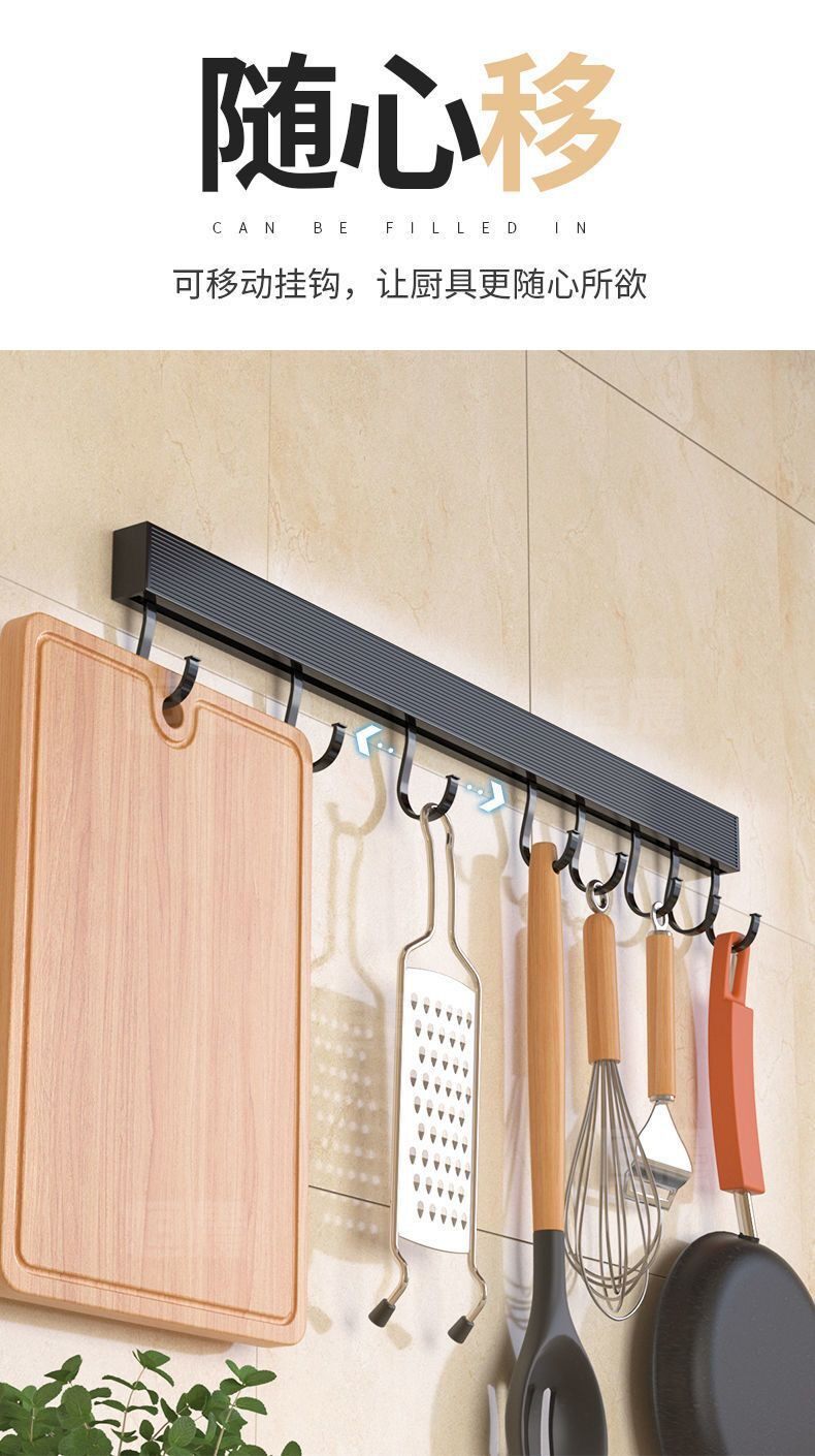 New Kitchen Hook Rack Wall-Mounted Space Aluminum Utensil Holder for Hanging Spoons and Spatulas, No-Drill Storage Rack