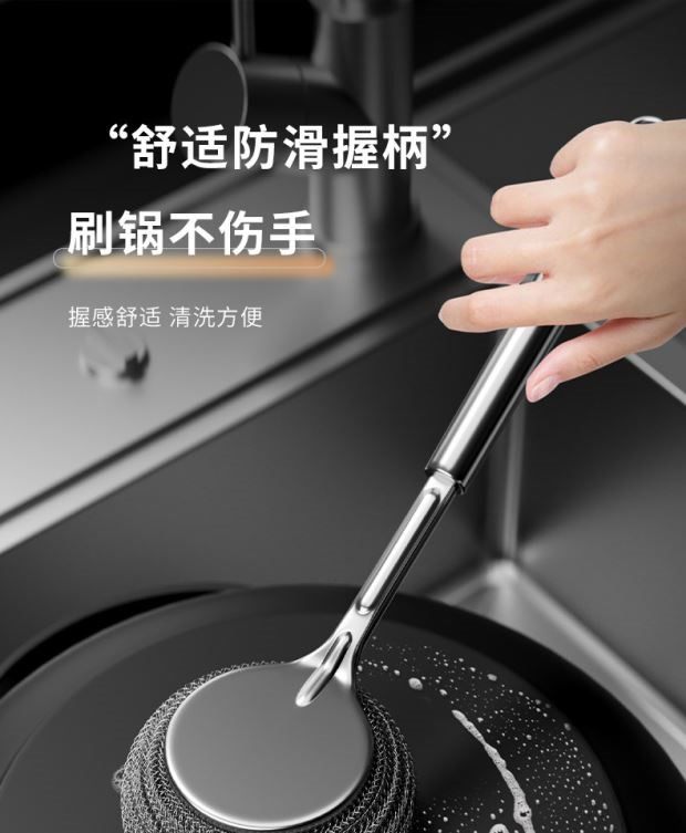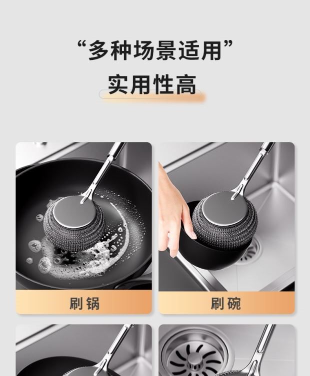 Kitchen Stainless Steel Pot Brush, Special Pot Cleaning Tool, Steel Wire Ball Brush with Long Handle, Dishwashing Cleaning Brush That Doesn'T Shed Bristles