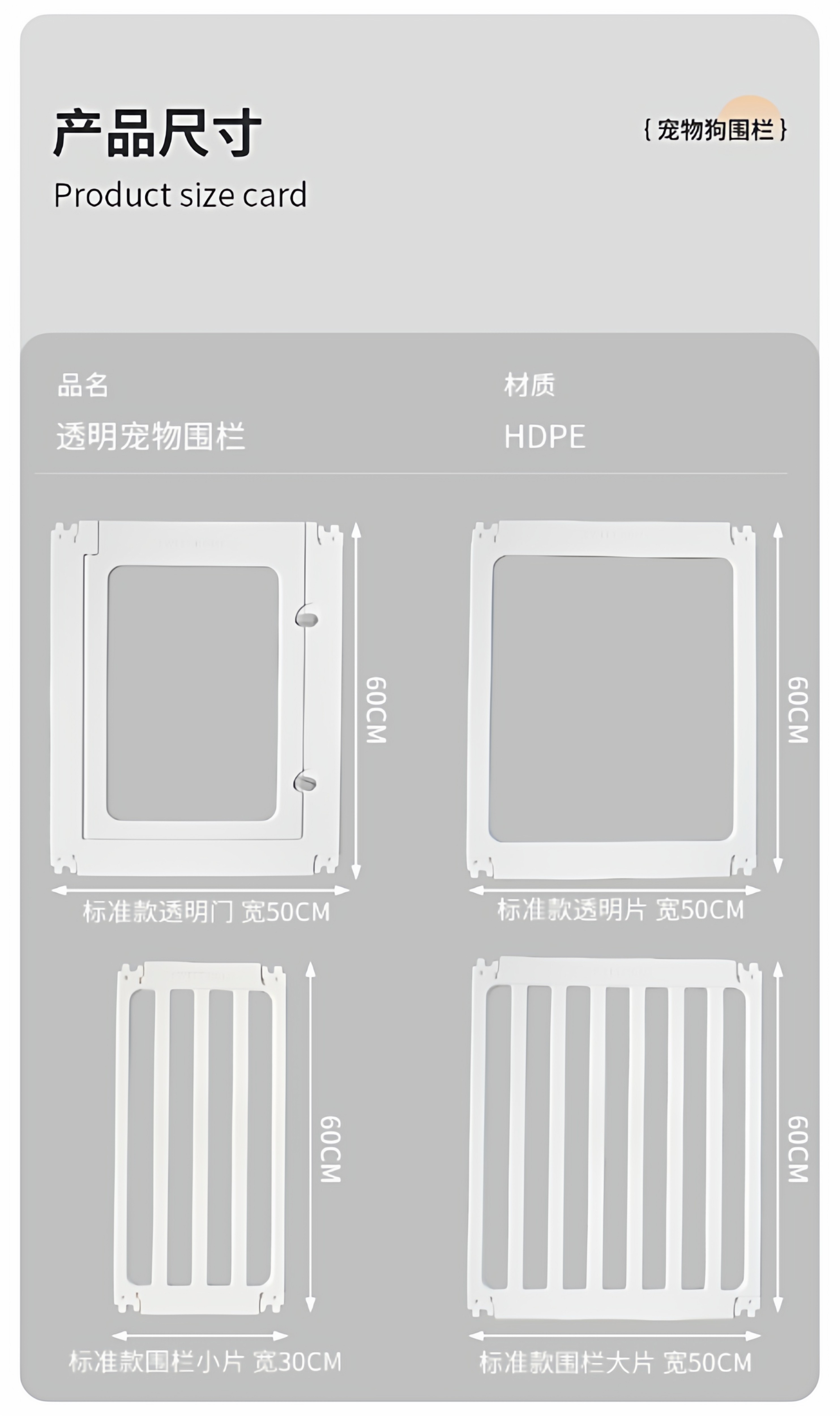 Color Classification Semi-Transparent [Height 60] 3 Large Panels + 1 Transparent Door (52*52),Semi-Transparent [Height 60] 4 Large Panels + 1 Transparent Door + 1 Transparent Panel (102*52) Style a,Semi-Transparent [Height 60] 2 Large Panels + 1 Transparent Door + 3 Transparent Panels (102*52) Style B,Semi-Transparent [Height 60] 4 Large Panels + 2 Small Panels + 1 Transparent Door + 1 Transparent Panel (102*82) Style a,Semi-Transparent [Height 60] 2 Large Panels + 2 Small Panels + 1 Transparent Door + 3 Transparent Sheets (102*82) Style B,Semi-Transparent [Height 60] 6 Large Panels + 1 Transparent Door + 1 Transparent Panel (102*102) Style a,Semi-Transparent [Height 60] 4 Large Panels + 1 Transparent Door + 3 Transparent Panels (102*102) Style B,Semi-Transparent [Height 60] 7 Large Panels + 1 Transparent Door + 2 Transparent Panels (152*102) Style a,Semi-Transparent [Height 60] 5 Large Panels + 1 Transparent Door + 4 Transparent Panels (152*102) Style B,Semi-Transparent [Height 60] 7 Large Panels + 2 Small Panels + 1 Transparent Door + 2 Transparent Panels (152*132) Style a,Semi-Transparent [Height 60] 5 Large Panels + 2 Small Panels + 1 Transparent Door + 4 Transparent Panels (152*132) Style B,Semi-Transparent [Height 60] 6 Large Panels + 1 Transparent Door + 5 Transparent Panels (202*102),Semi-Transparent [Height 60] 8 Large Panels + 2 Small Panels + 1 Transparent Door + 3 Transparent Panels (202*132) Style a,Semi-Transparent [Height 60] 6 Large Panels + 2 Small Panels + 1 Transparent Door + 5 Transparent Sheets (202*132) Style B,Fully Transparent [Height 60] 1 Transparent Door + 3 Transparent Sheets (52*52),Fully Transparent [Height 60] 1 Transparent Door + 5 Transparent Sheets (102*52),Fully Transparent [Height 60] 1 Transparent Door + 7 Transparent Sheets (102*102),Fully Transparent [Height 60] 1 Transparent Door + 9 Transparent Sheets (152*102),Fully Transparent [Height 60] 1 Transparent Door + 11 Transparent Sheets (152*152),Full Fence Combination [Height 60] 3 Large Pieces + 1 Door (52*52),Full Fence Combination [Height 60] 5 Large Pieces + 1 Door (102*52),Full Fence Combination [Height 60] 5 Large Pieces + 2 Small Pieces + 1 Door (102*82),Full Fence Combination [Height 60] 7 Large Pieces + 1 Door (102*102),Full Fence Combination [Height 60] 9 Large Pieces + 1 Door (152*102)