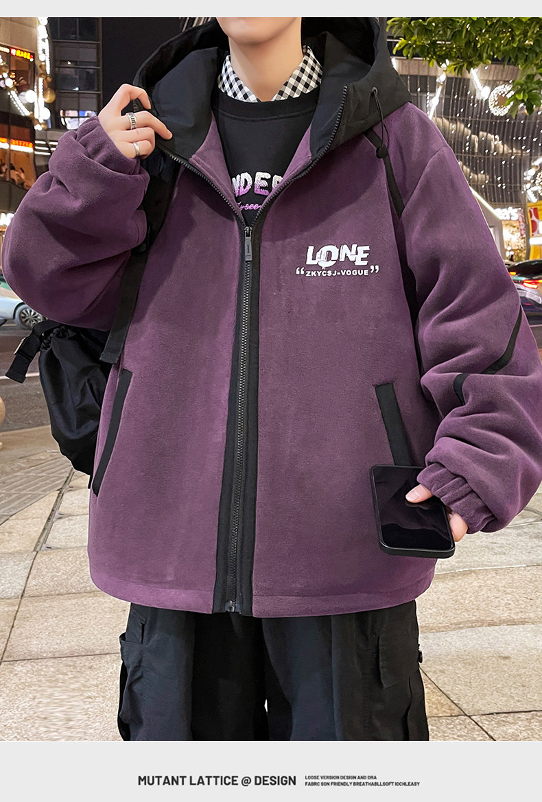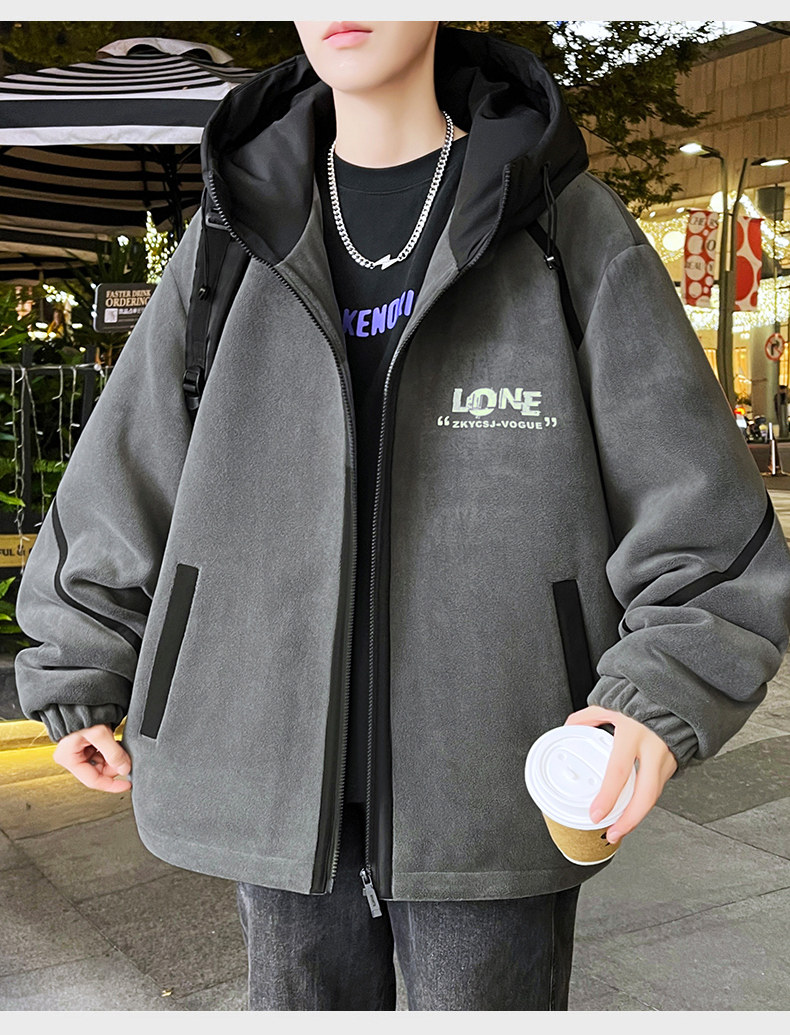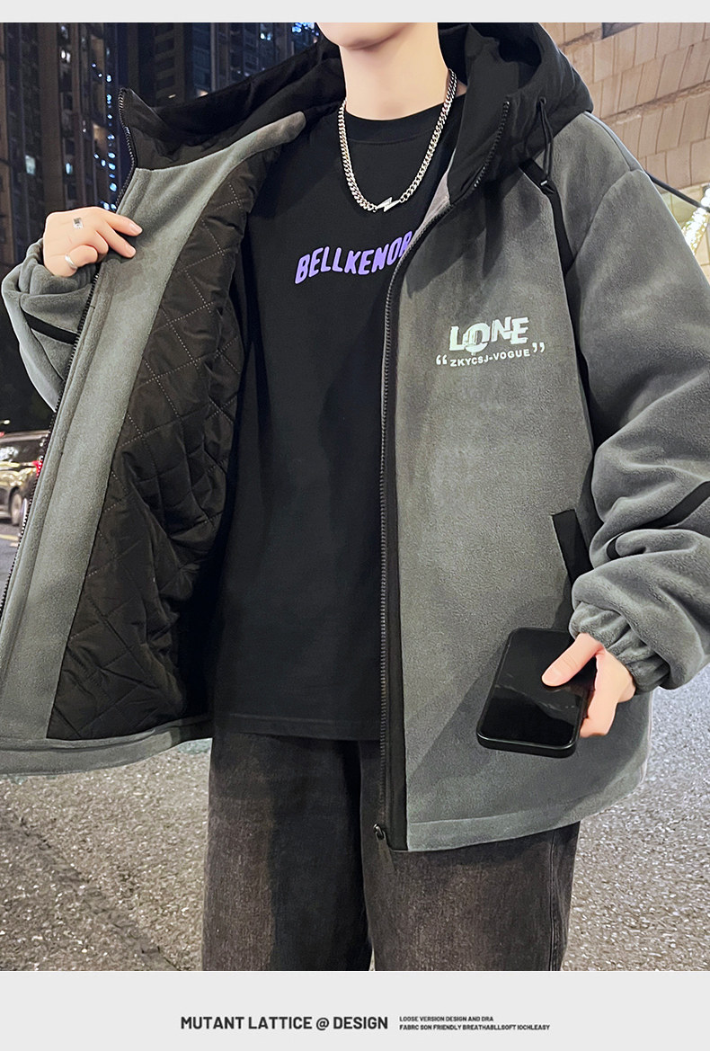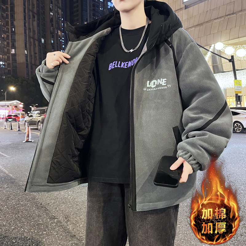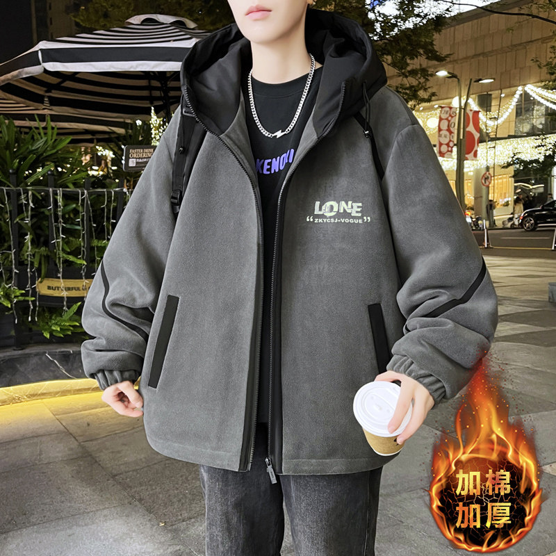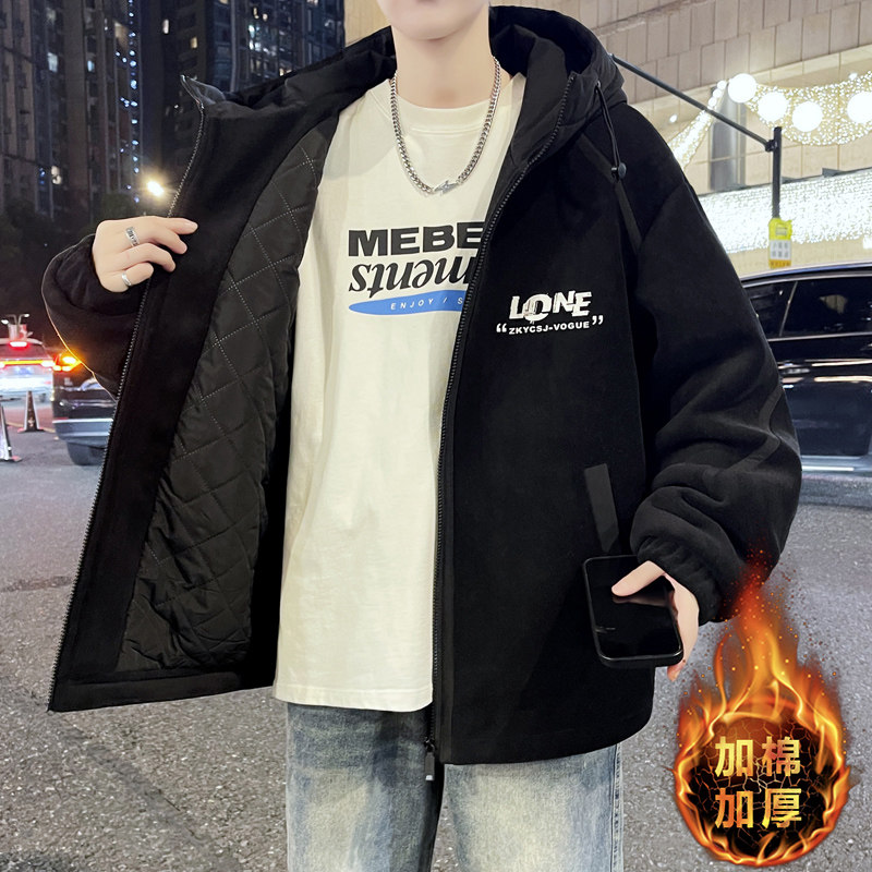 Teenagers' Fleece-Lined Cotton Jacket for Men, Winter Trendy Brand Loose Hooded Cotton Coat, Student Winter Clothing Top