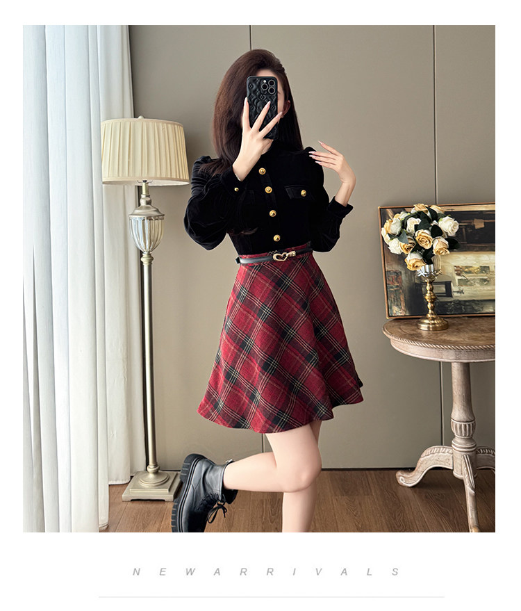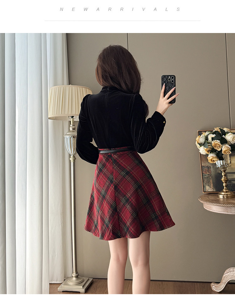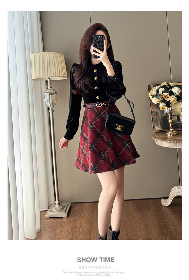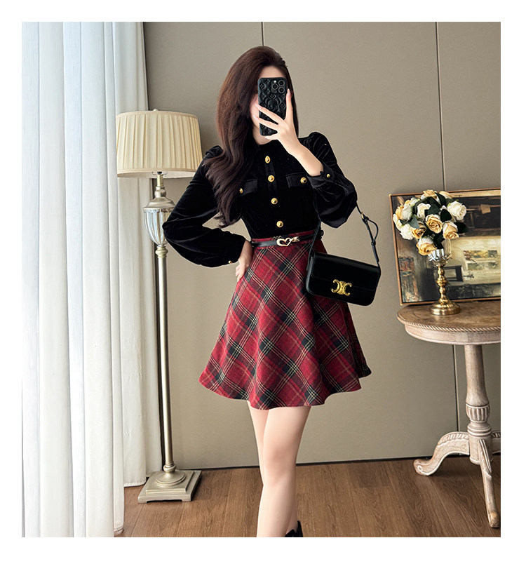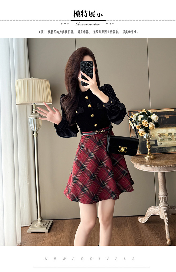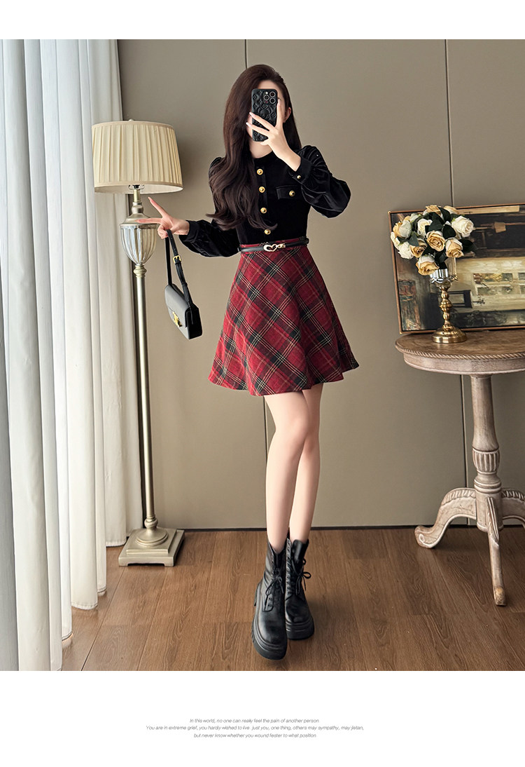 French-Style Socialite Fashion Retro Plaid Skirt for Women, Stylish Petite Age-Reducing Chanel-Style Velvet Dress
