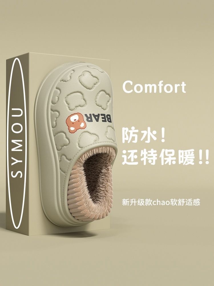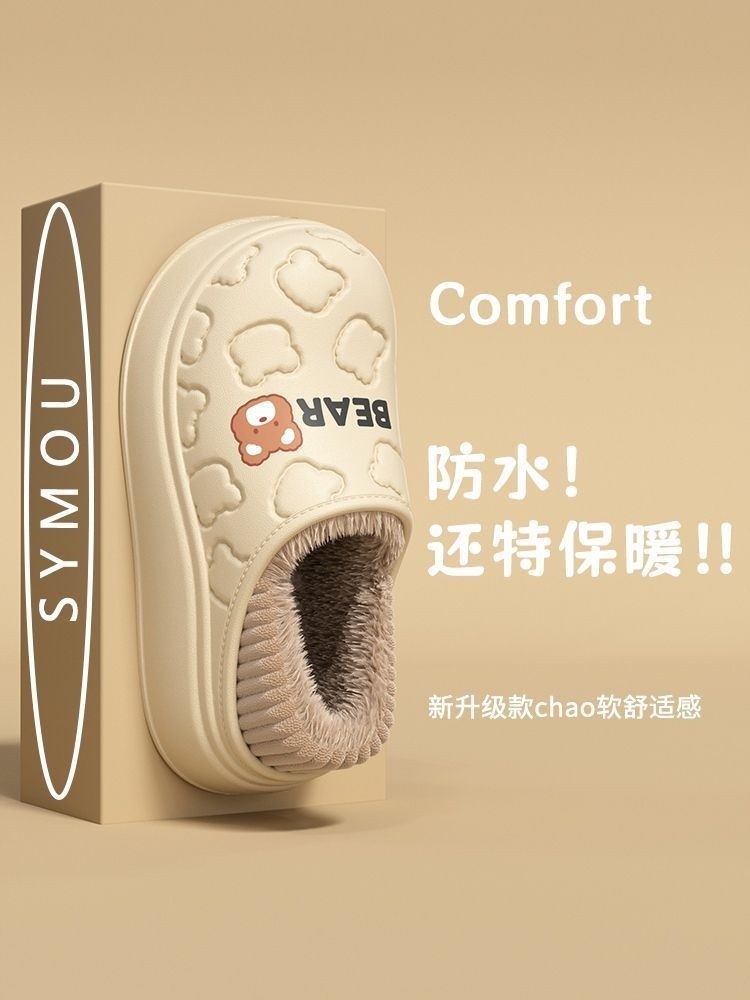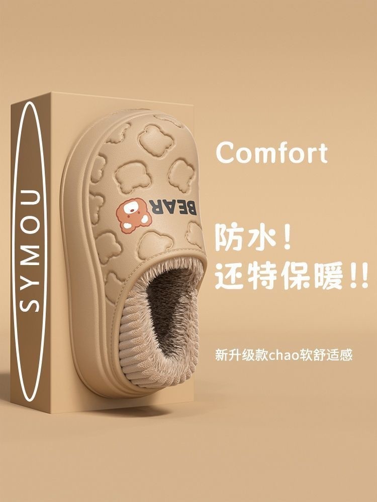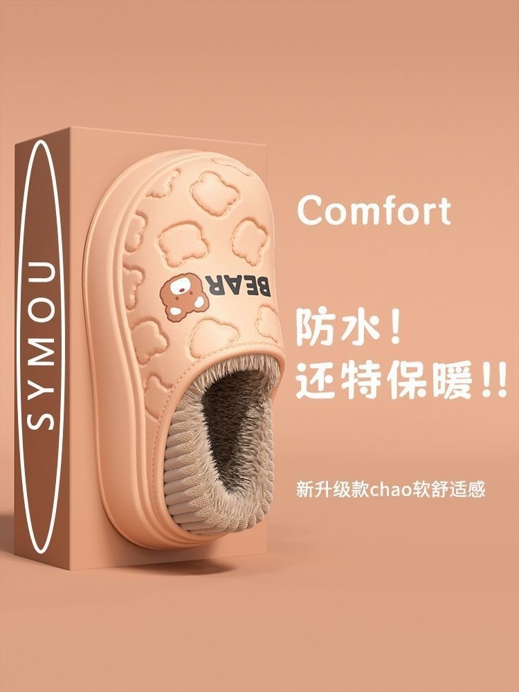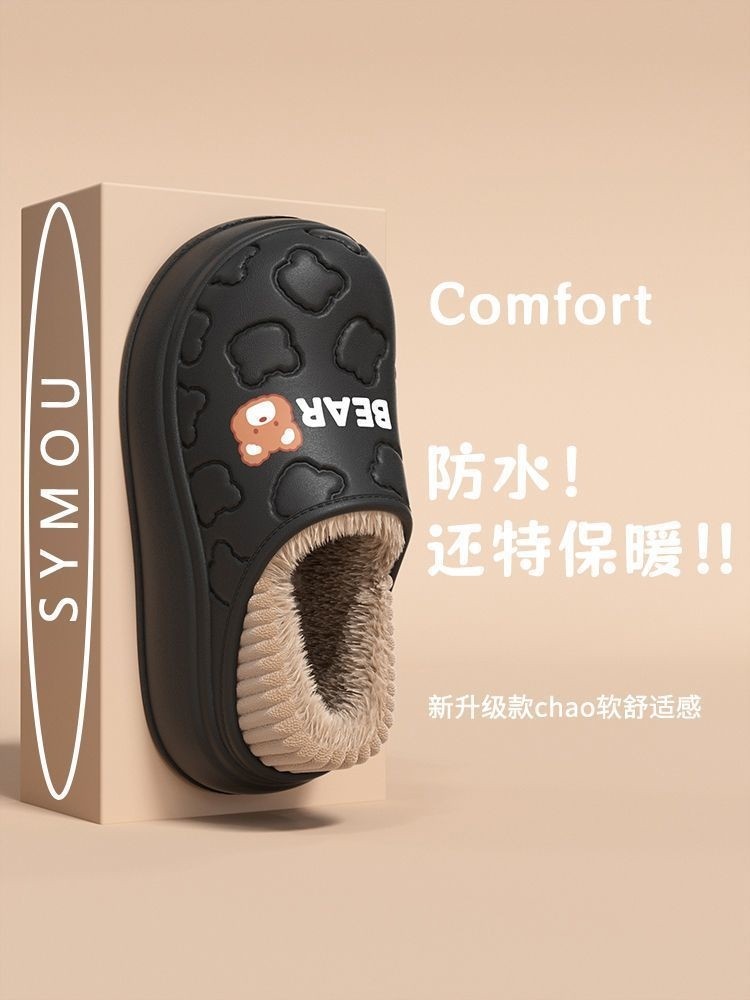Waterproof Warm Cotton Slippers for Women, Autumn and Winter 2025 New Style, Cartoon Bear, Sweet and Versatile, Indoor Non-Slip and Odor-Resistant Men's Shoes