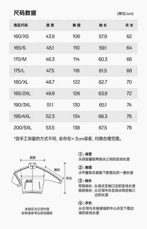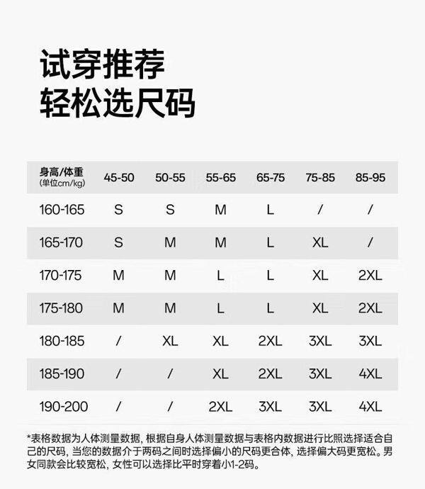 China (cm) 165 / 88-90 170 / 96-98 175 / 108-110 180 / 118-122 185 / 126-130