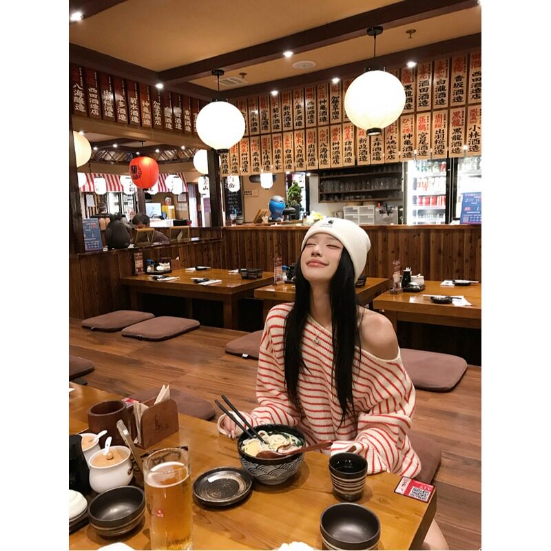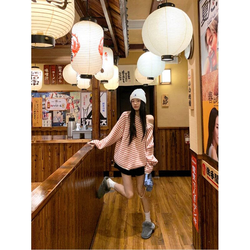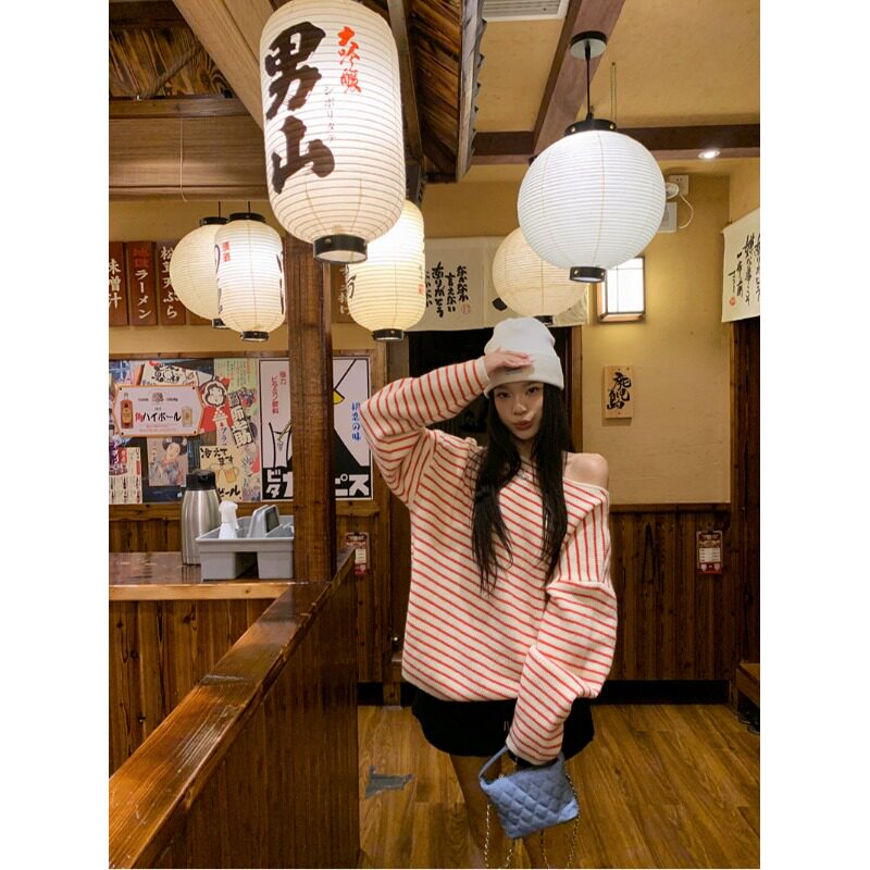 Korean Retro Lazy Style Red and White Striped Off-Shoulder Long-Sleeve Sweater for Women, Autumn and Winter, Loose, Slimming, Casual, Versatile Top