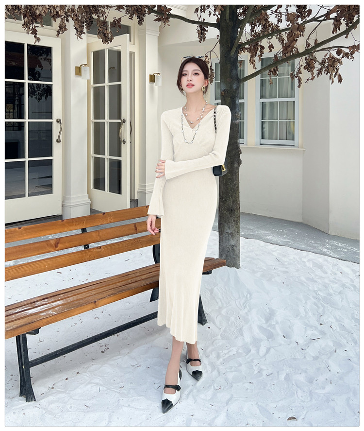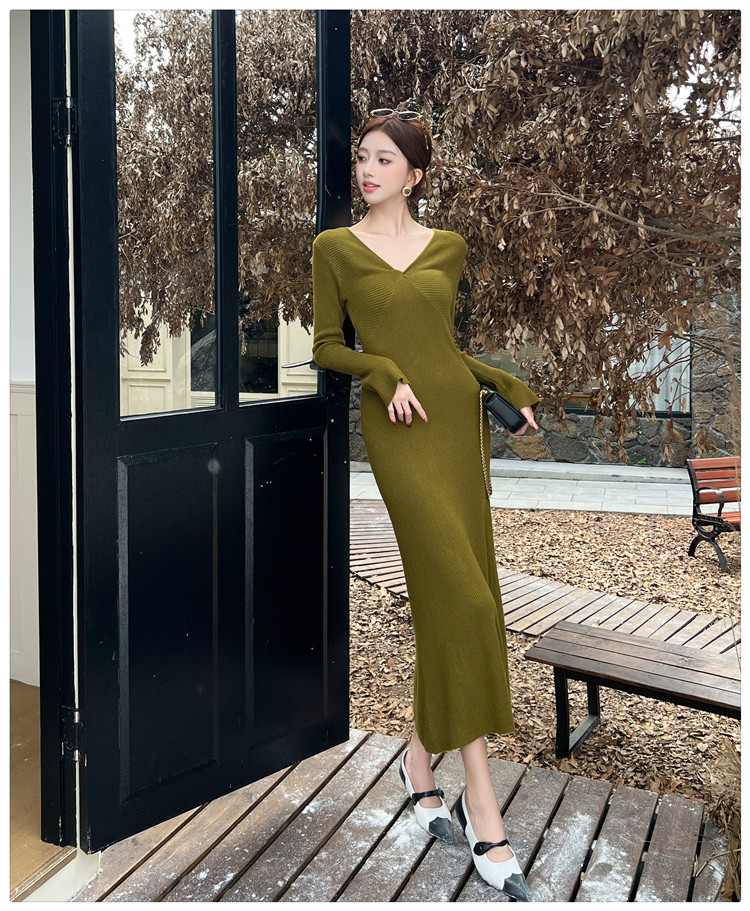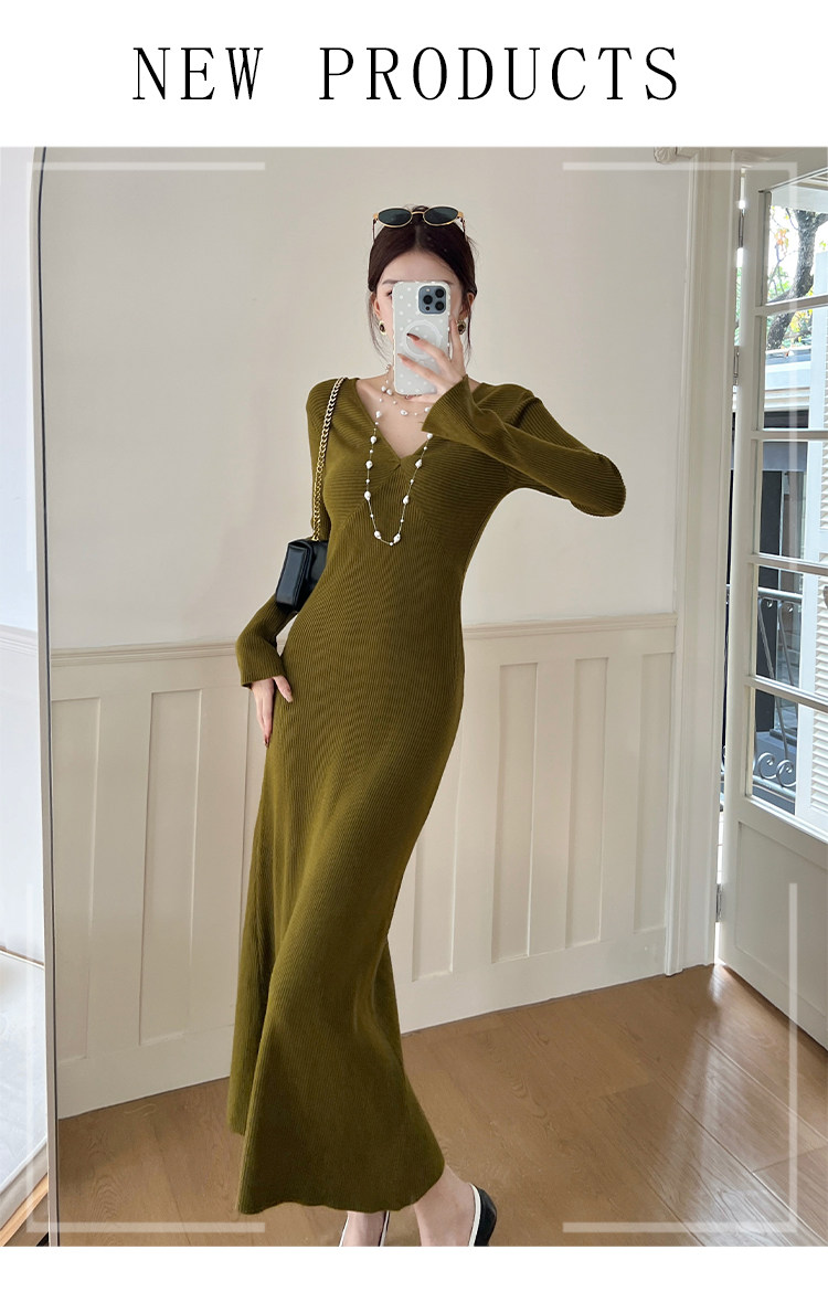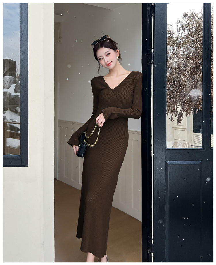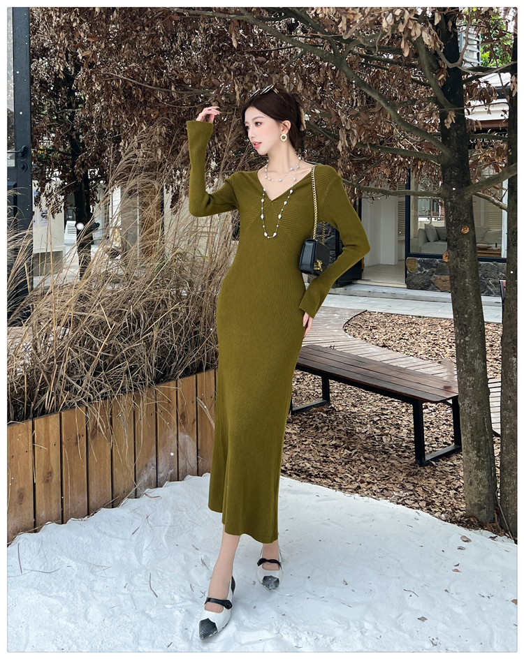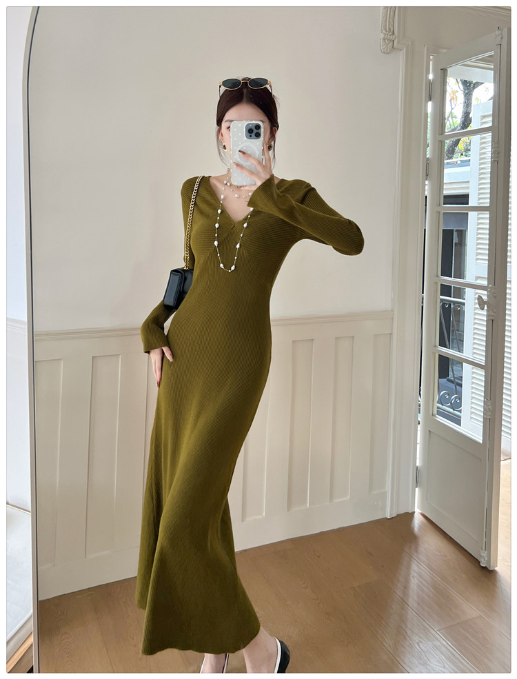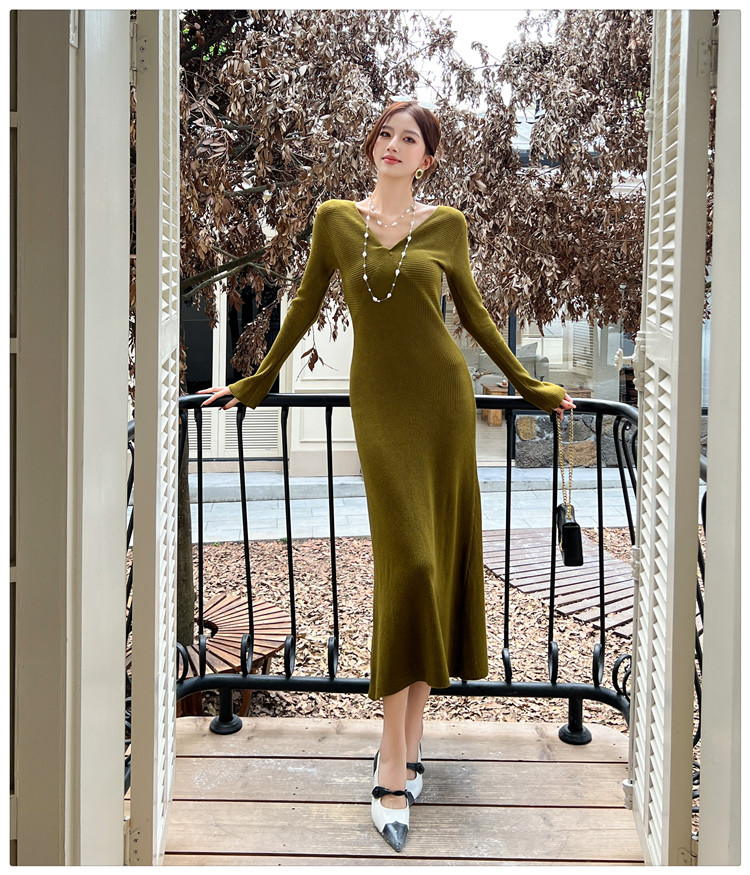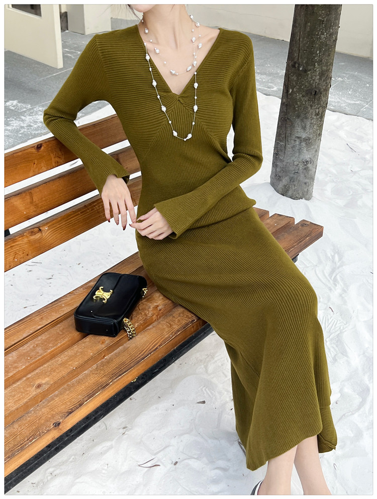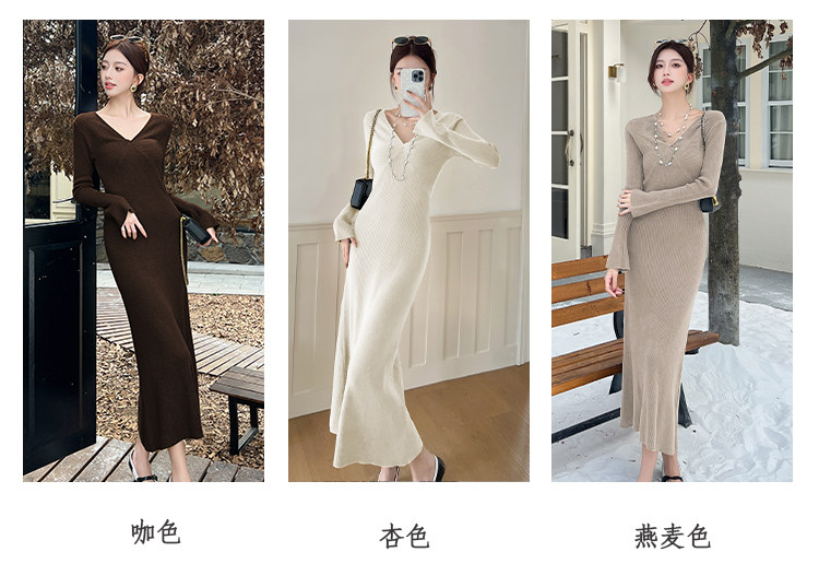 Lightly Mature and Elegant Style V-Neck Knitted Dress for Women, Autumn and Winter Long-Sleeved Slim-Fit Dress with a High-End Feel and A-Line Skirt Underneath