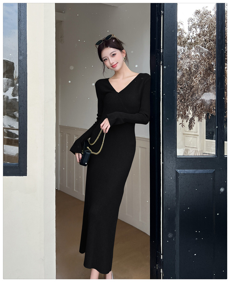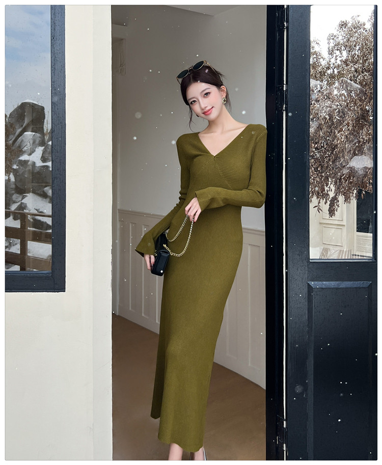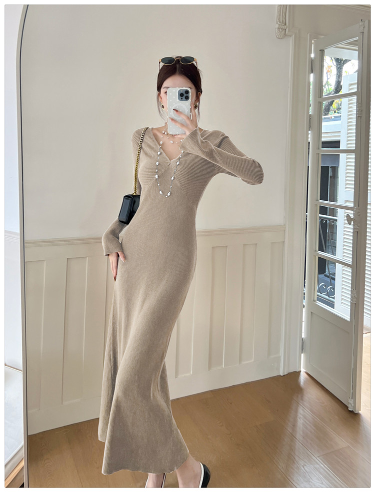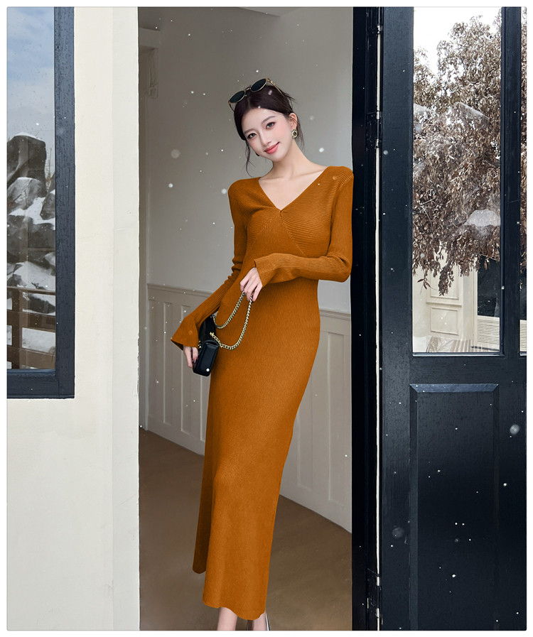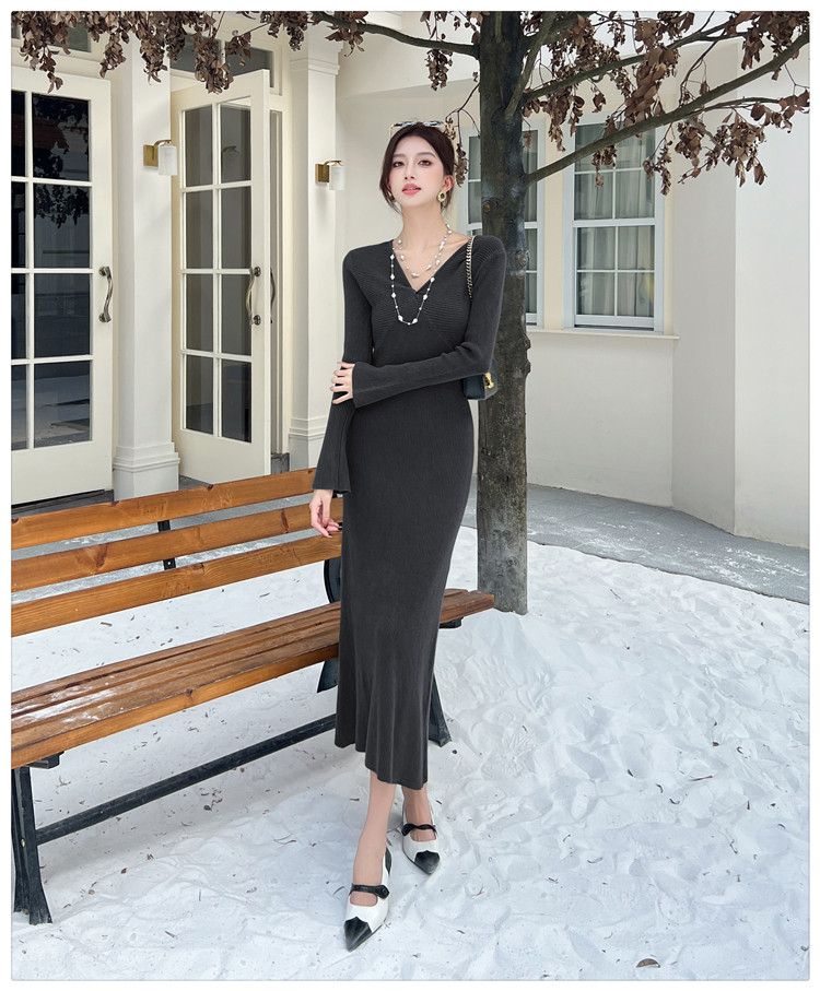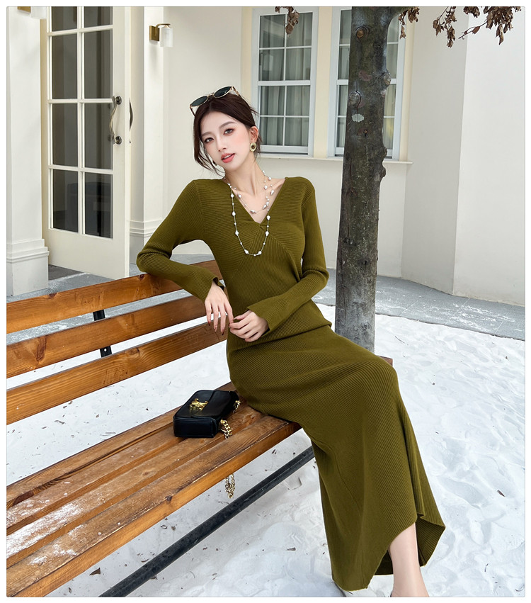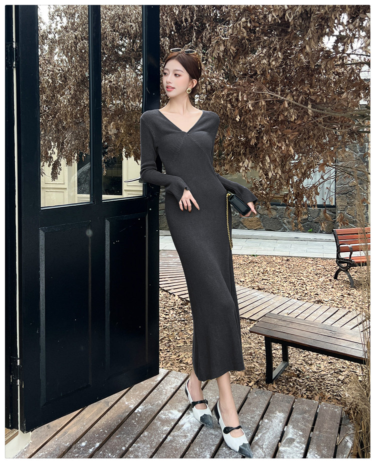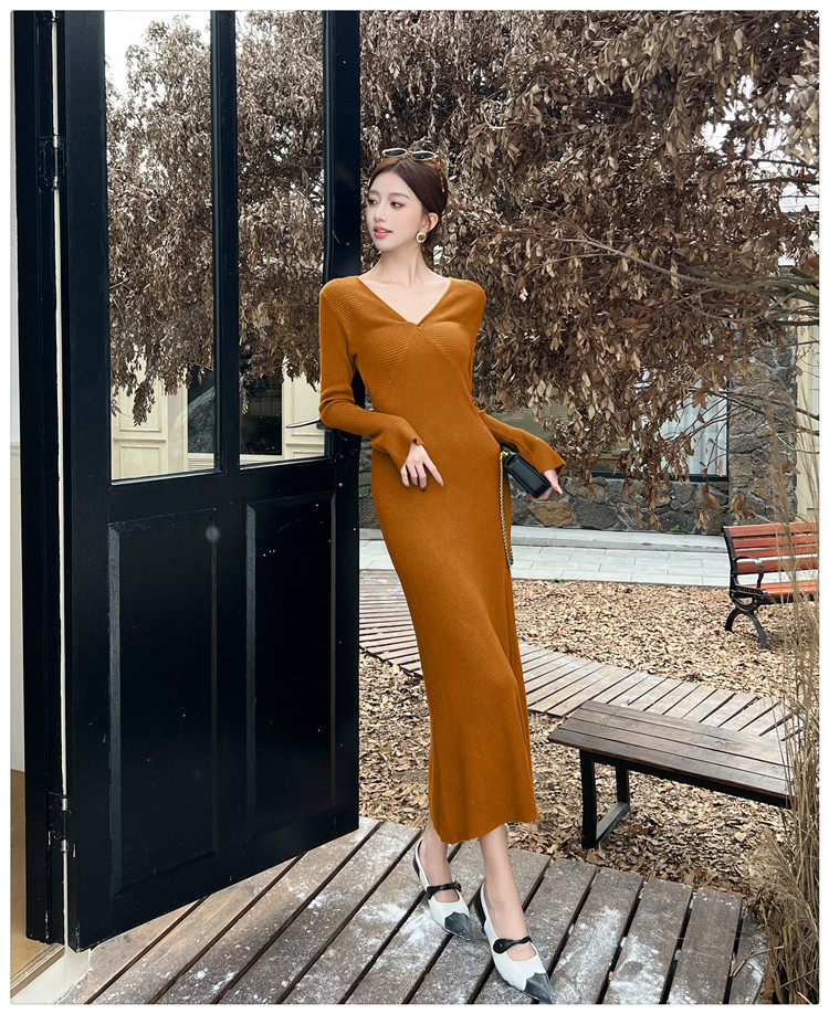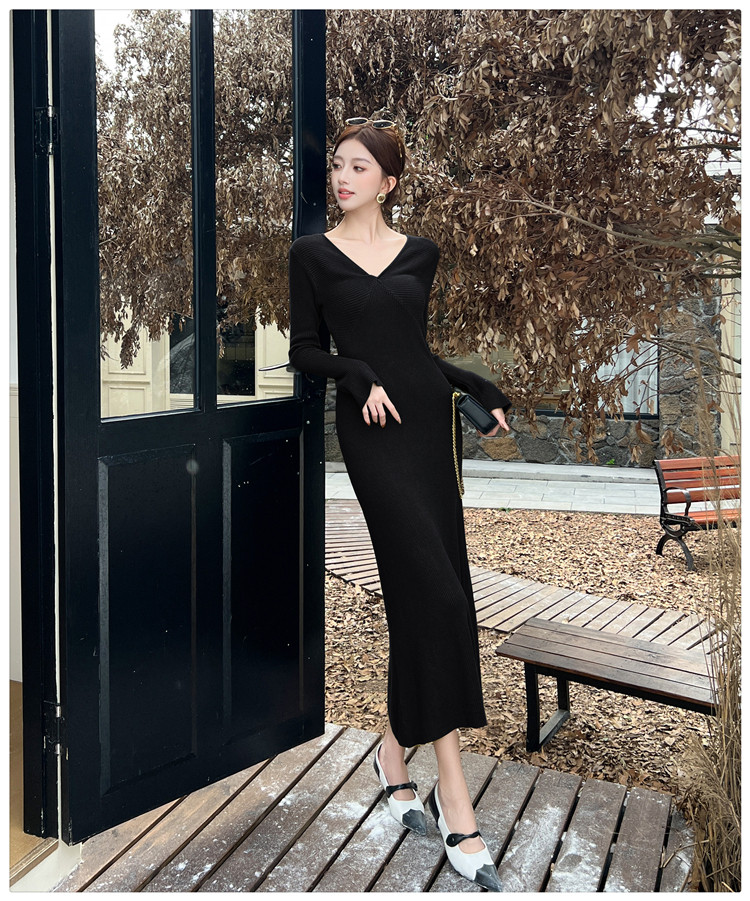 Lightly Mature and Elegant Style V-Neck Knitted Dress for Women, Autumn and Winter Long-Sleeved Slim-Fit Dress with a High-End Feel and A-Line Skirt Underneath