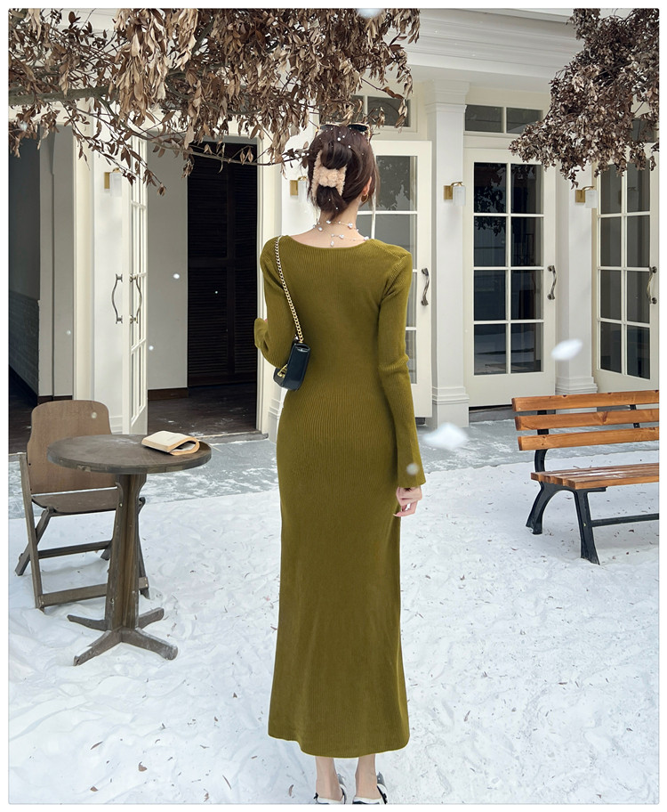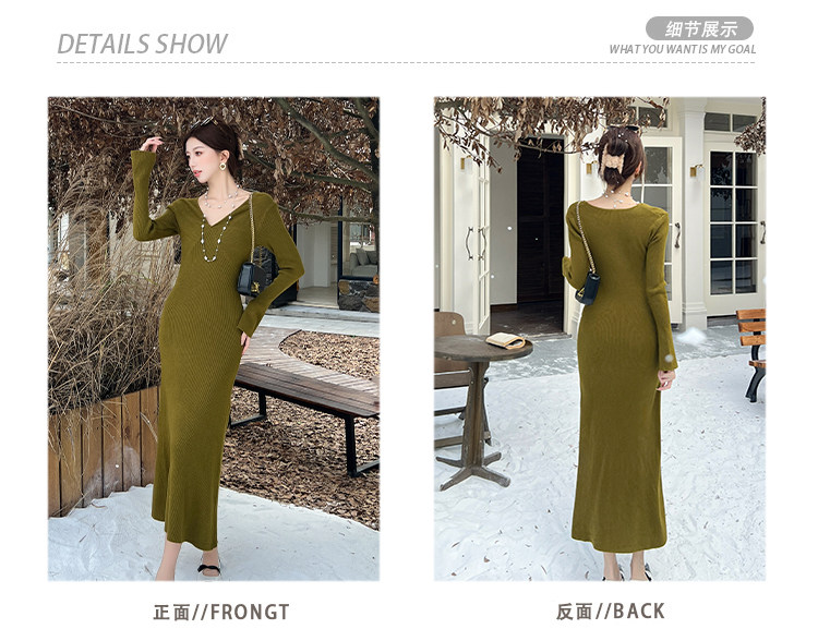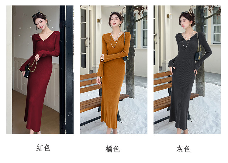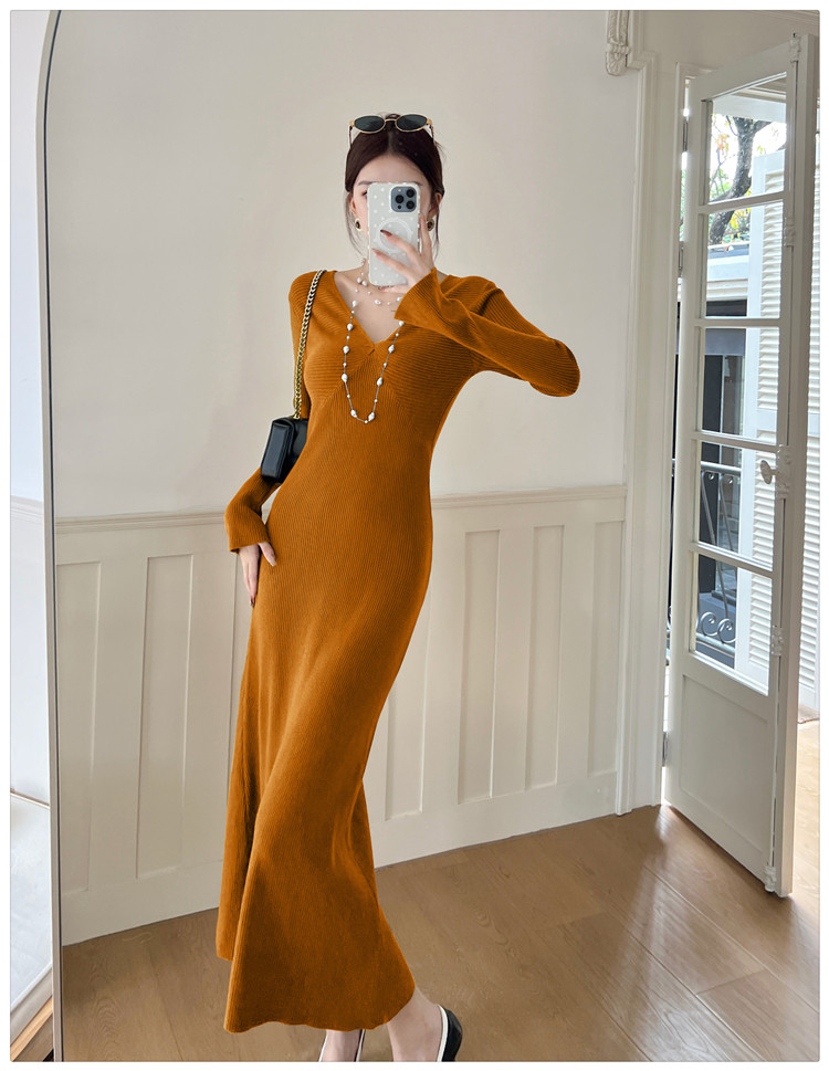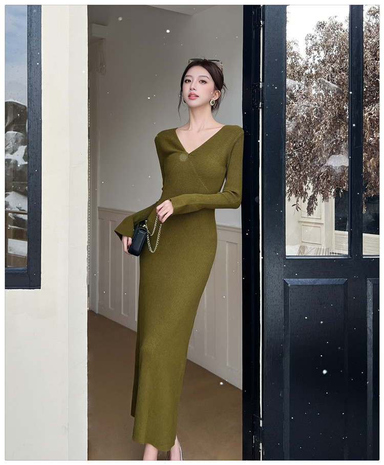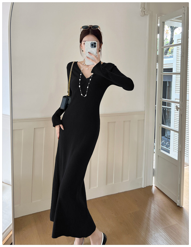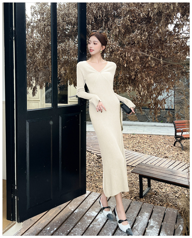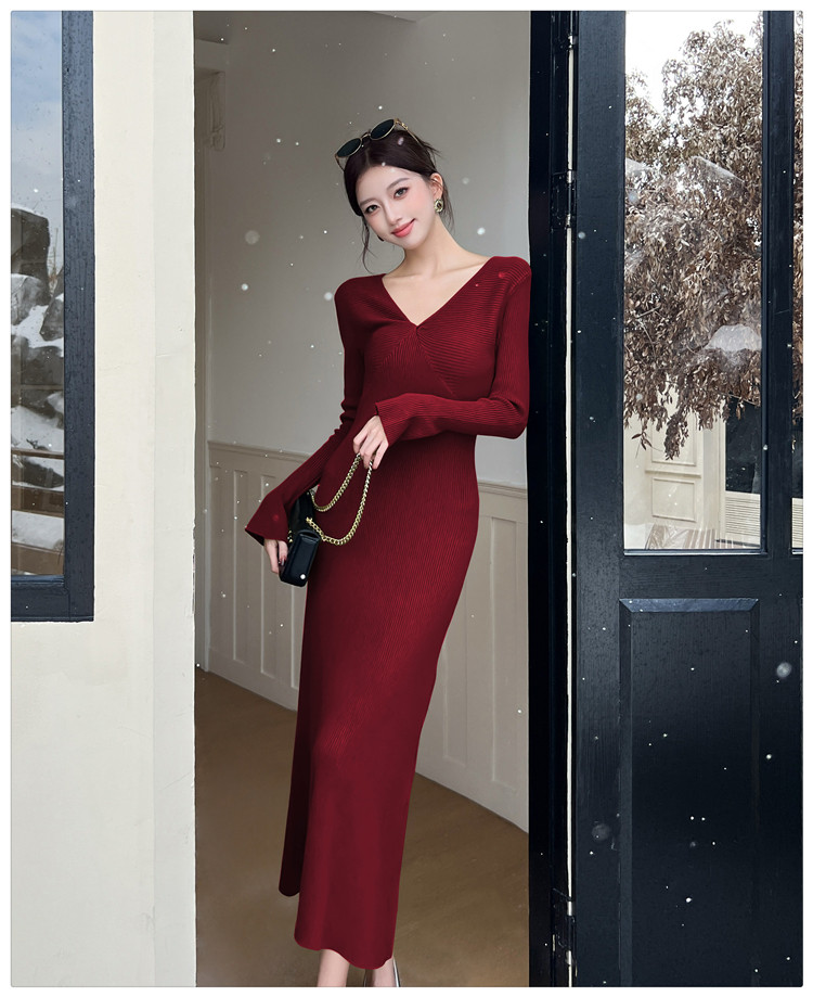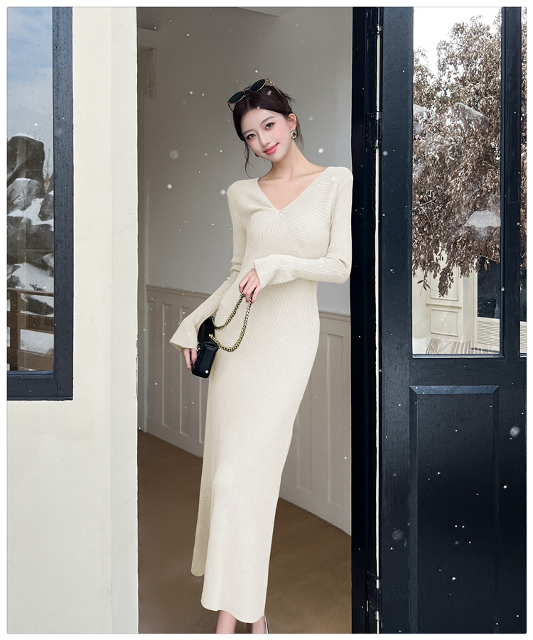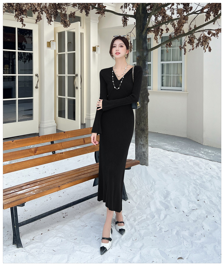 Lightly Mature and Elegant Style V-Neck Knitted Dress for Women, Autumn and Winter Long-Sleeved Slim-Fit Dress with a High-End Feel and A-Line Skirt Underneath