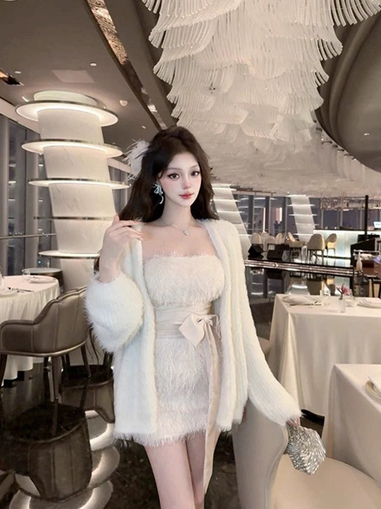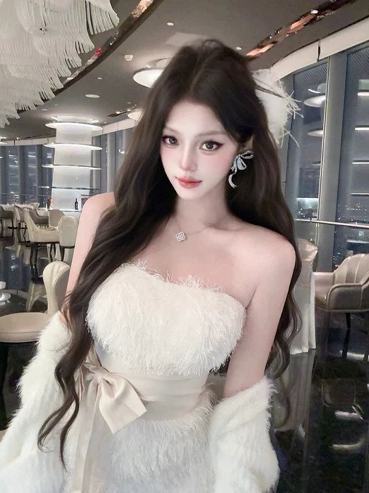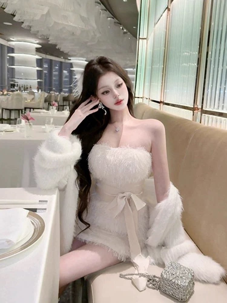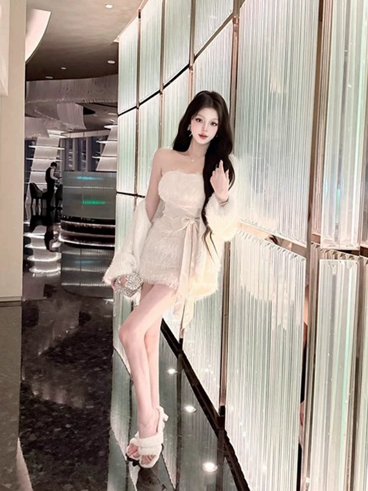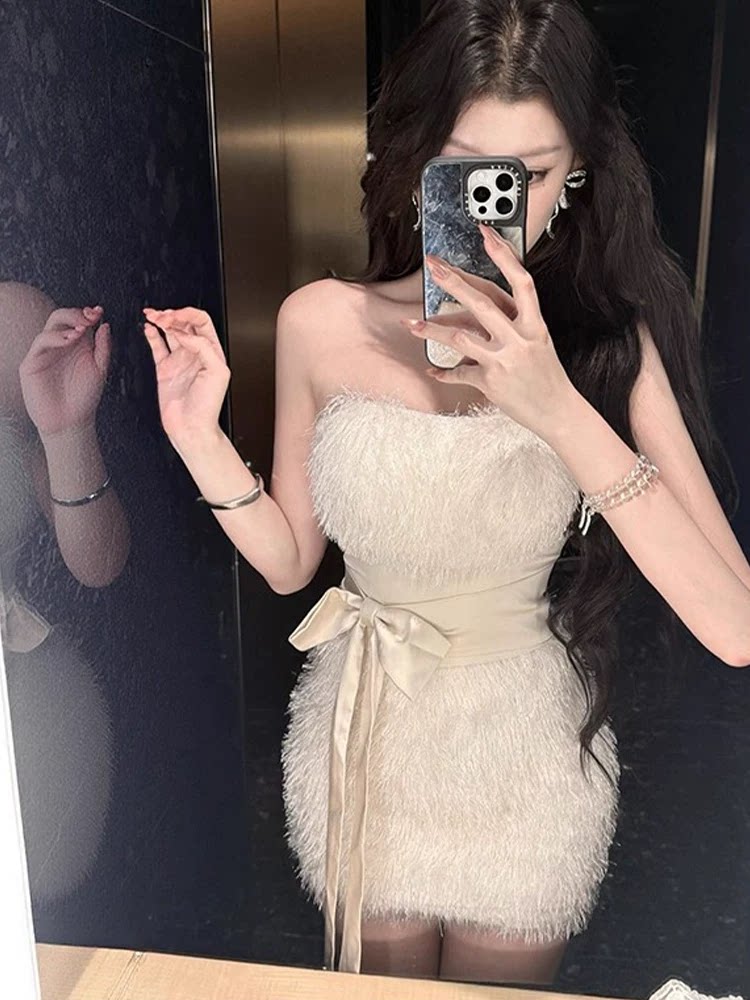 High-End Pure Desire Sexy Fur Tube Top Dress for Women, Autumn and Winter Design, Waist-Cinching, Hip-Hugging Short Dress
