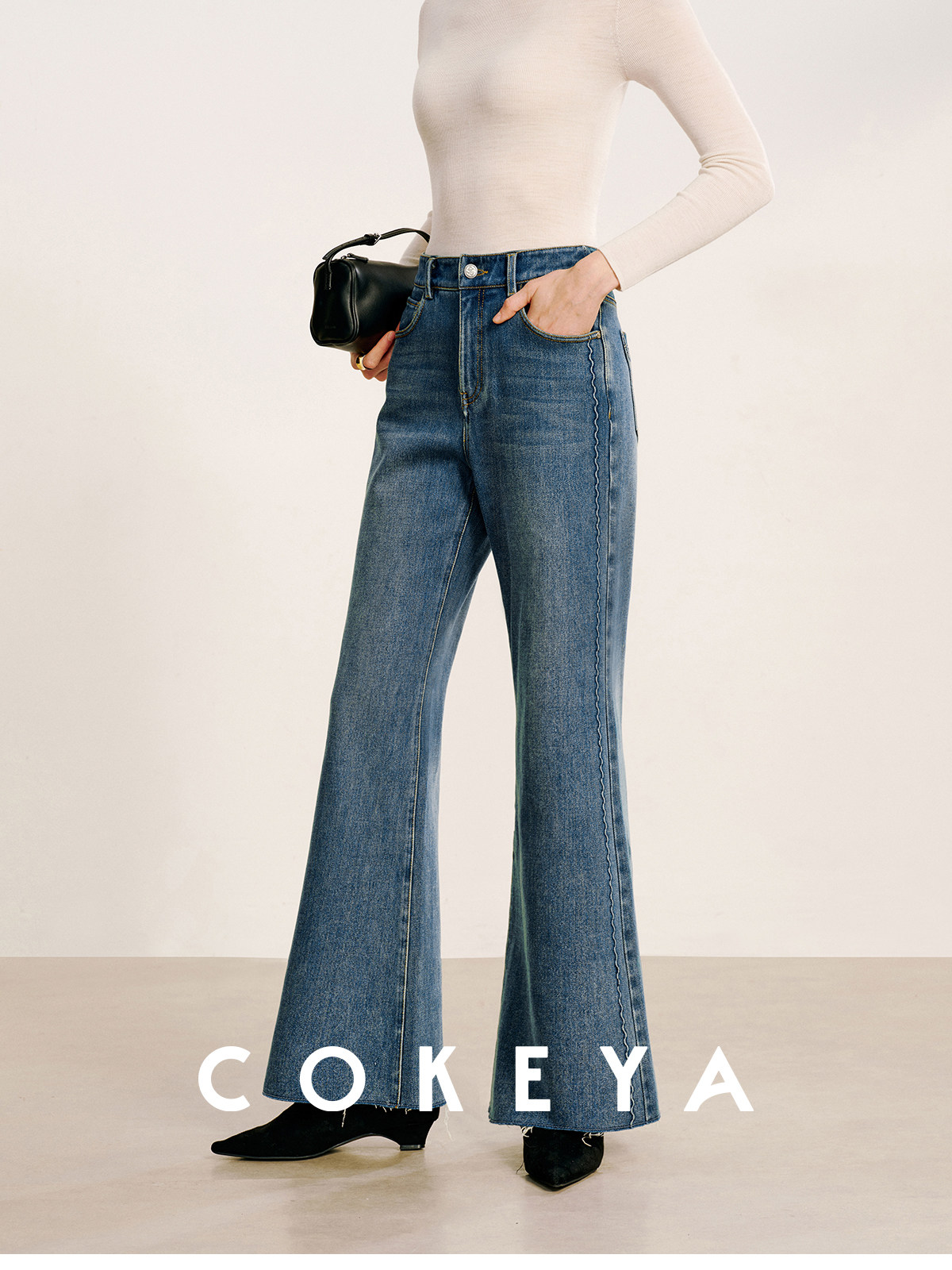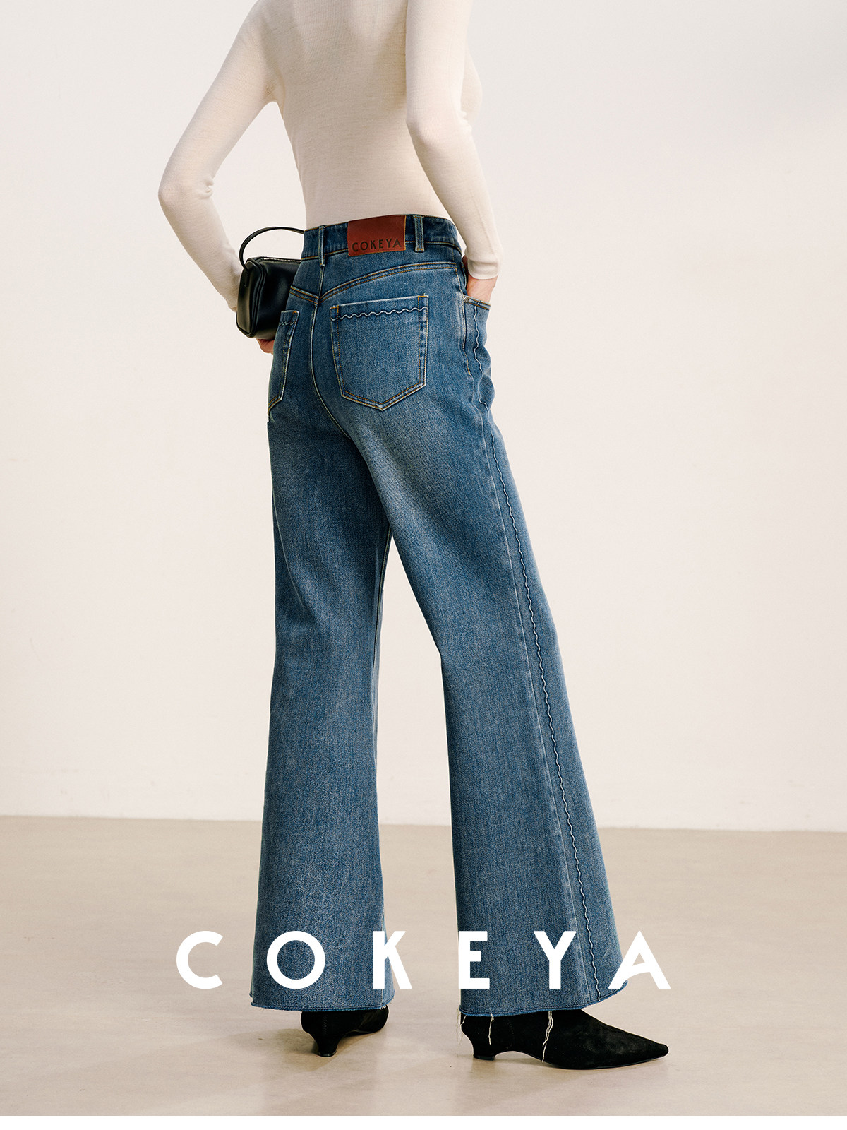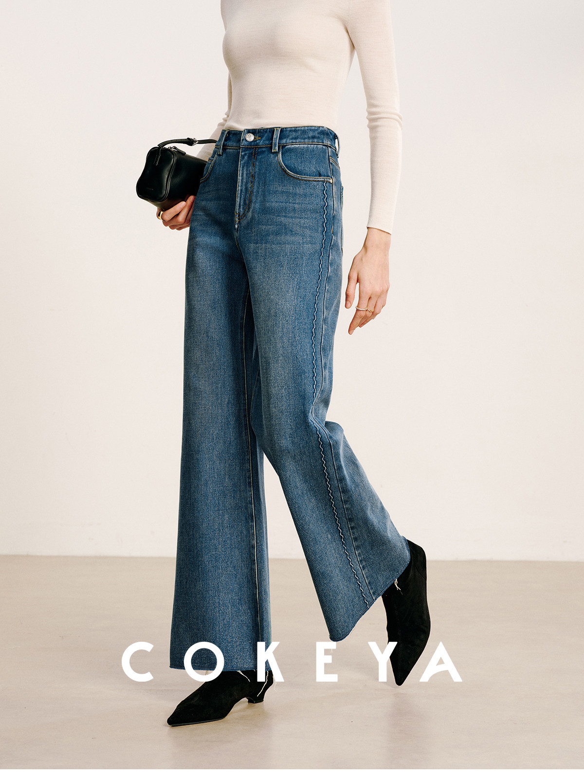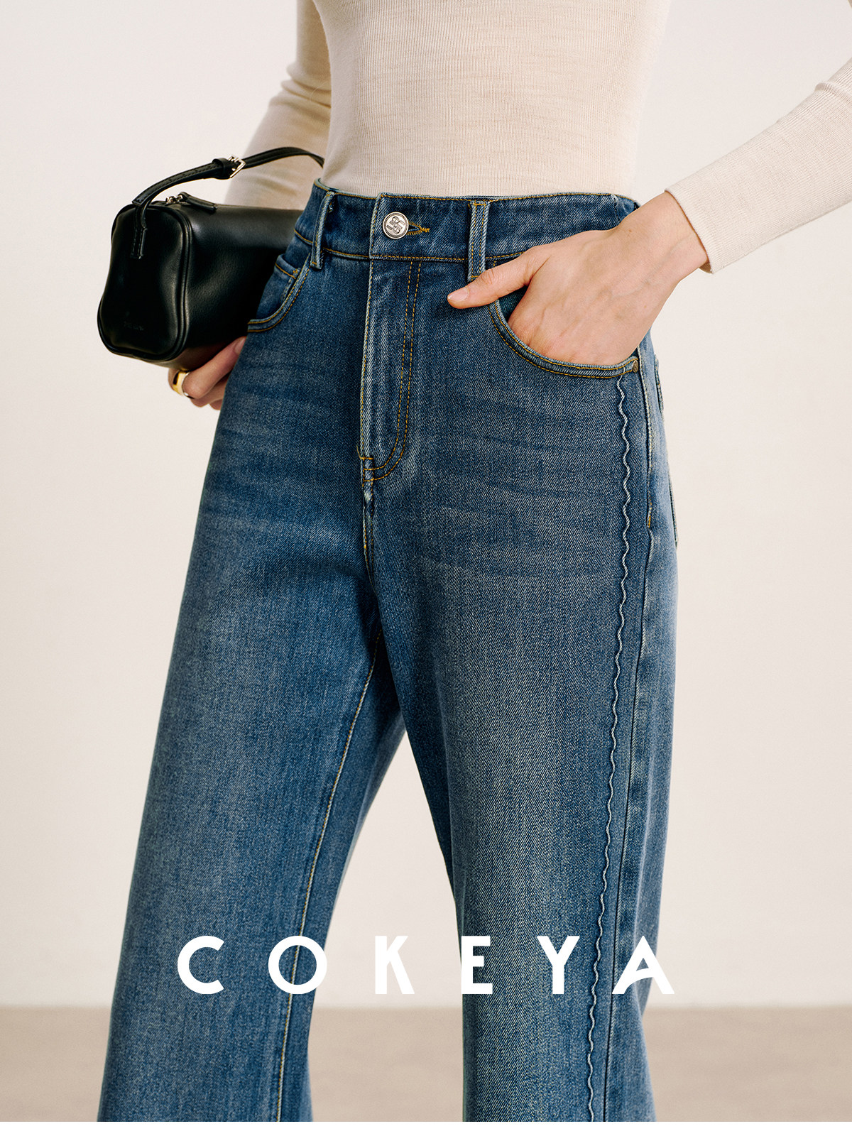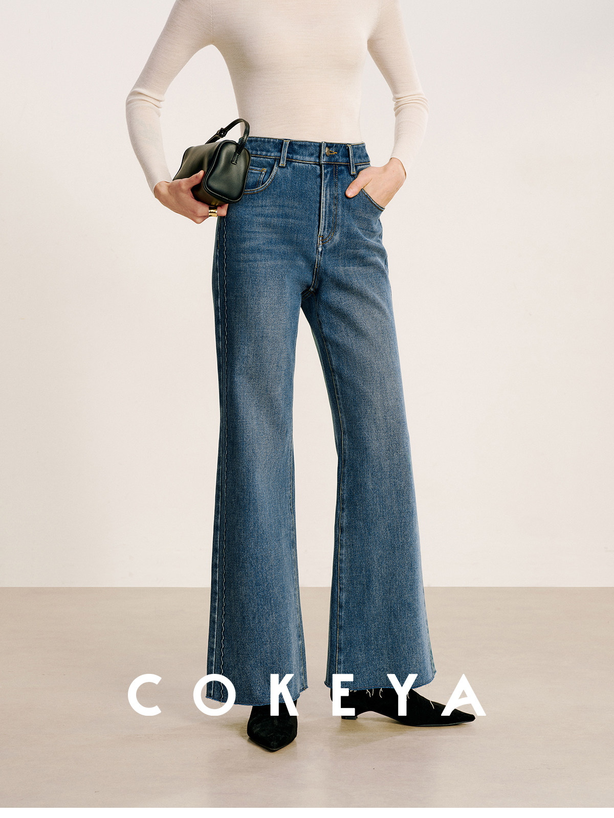 Cokeya/Fleece-Lined "Wave Pants"~Tencel Cotton High-Waisted Slimming Loose Flared Jeans for Women Winter Flared Pants