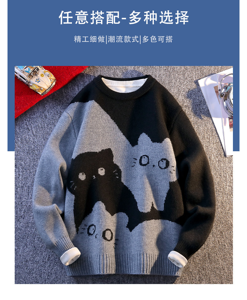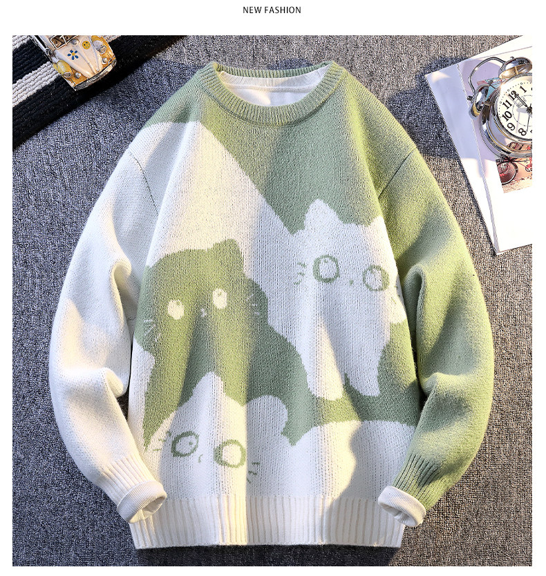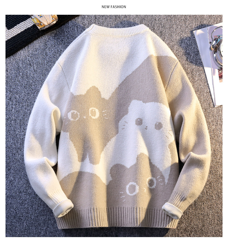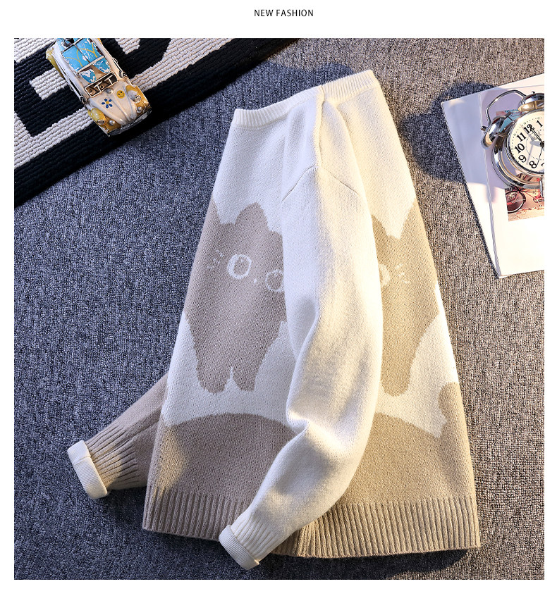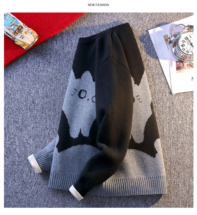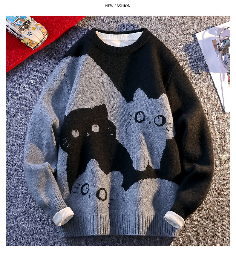 College Style Round Neck Sweater for Men in Autumn and Winter, Contrasting Color Cat Knit Sweater, Loose and Lazy Style, Handsome and Warm Top