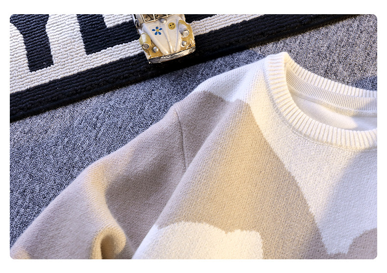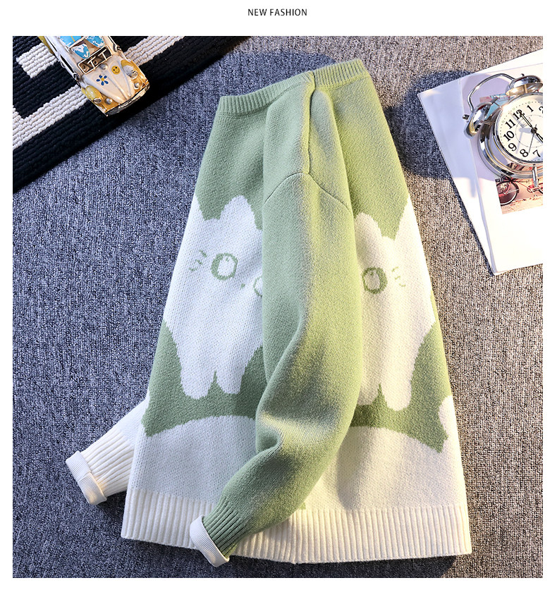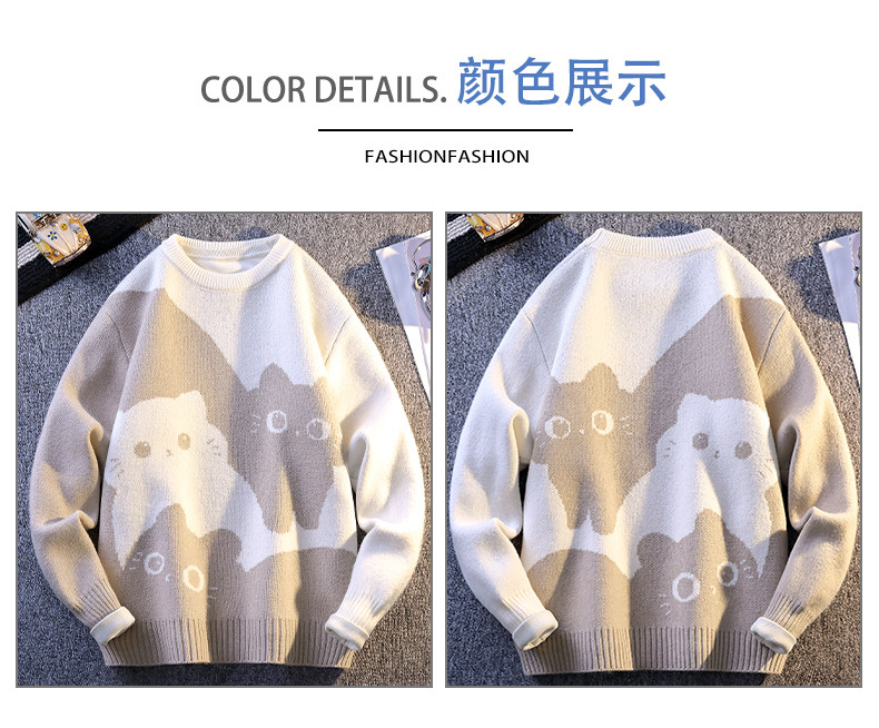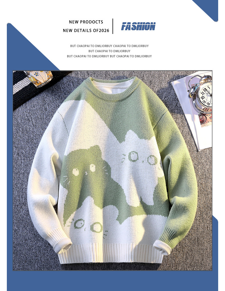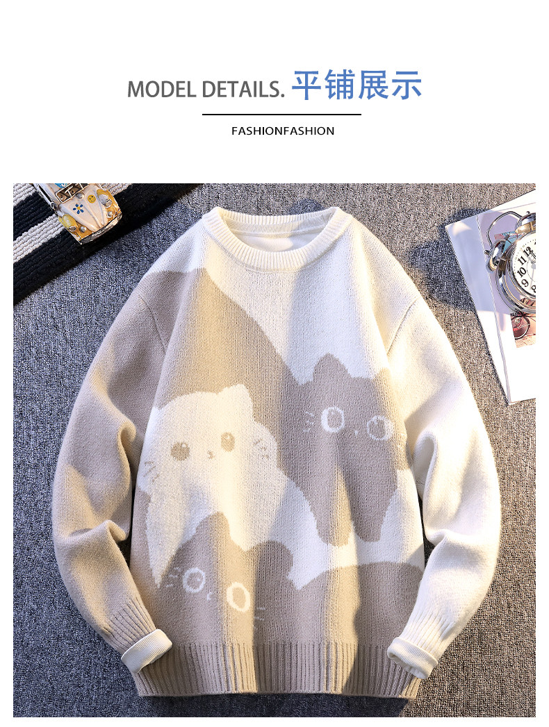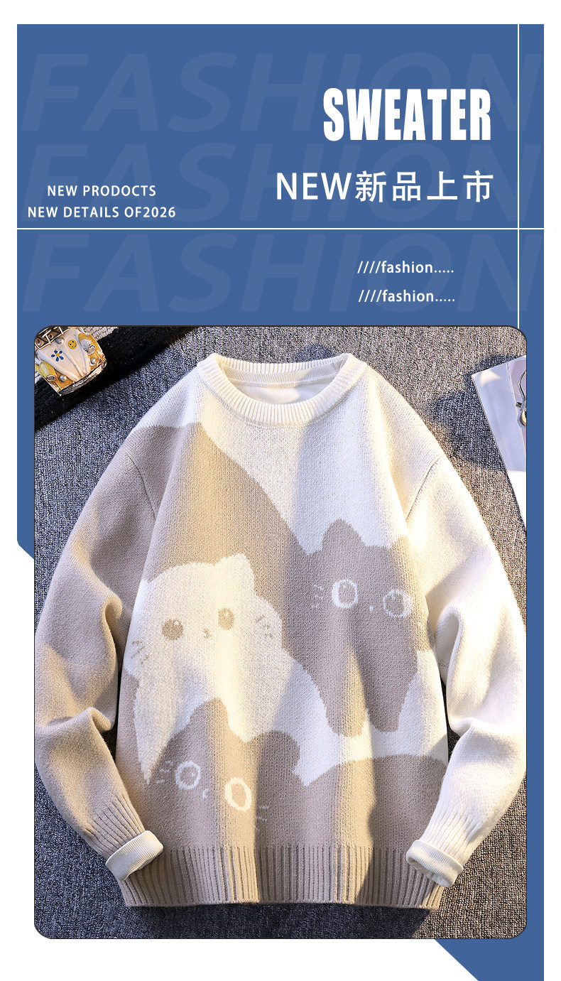 College Style Round Neck Sweater for Men in Autumn and Winter, Contrasting Color Cat Knit Sweater, Loose and Lazy Style, Handsome and Warm Top