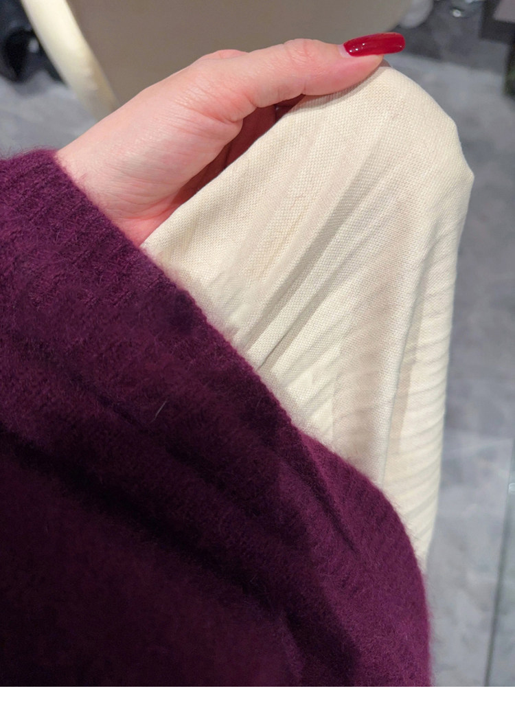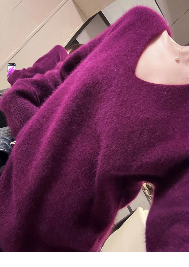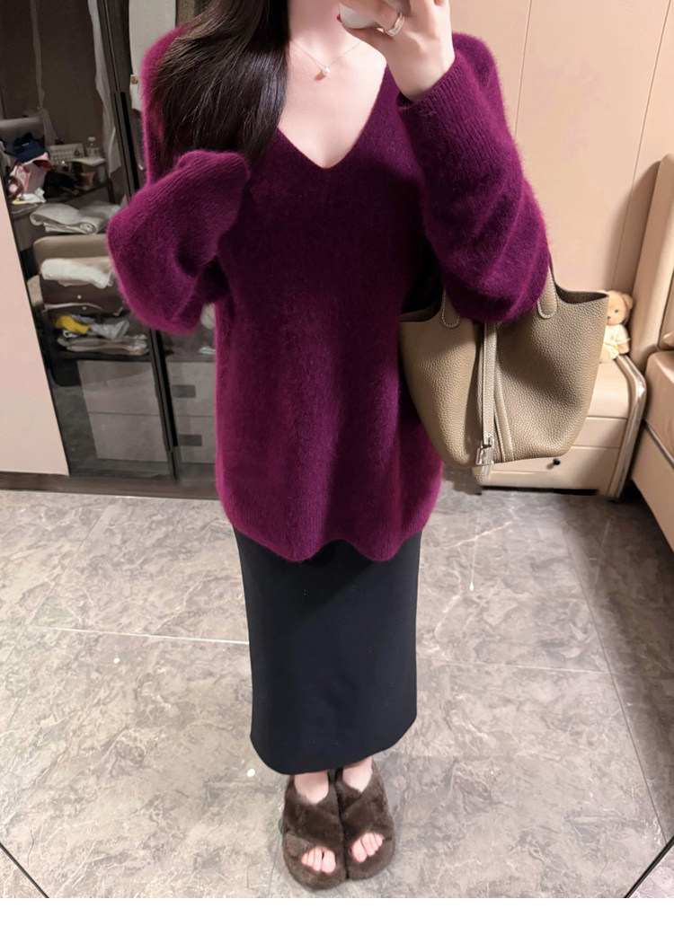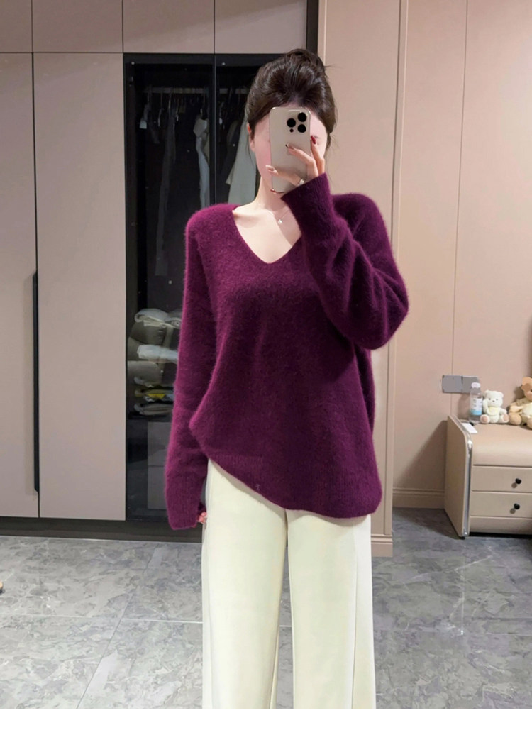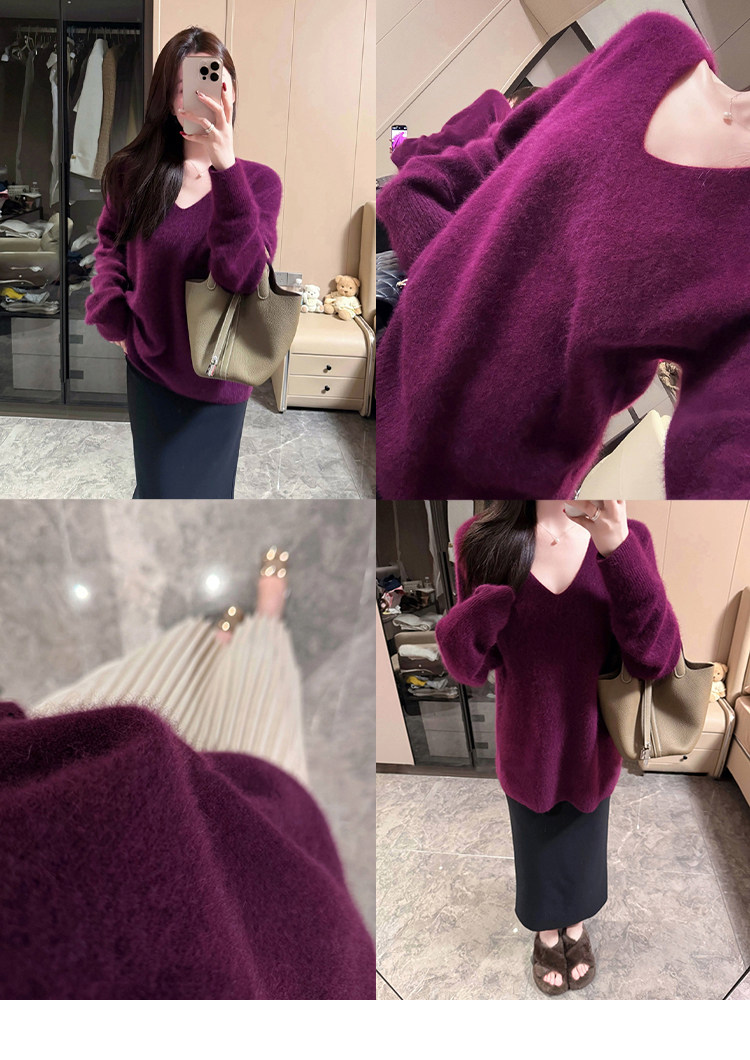 Autumn and Winter V-Neck Grape Purple Raccoon Velvet Knit Sweater for Women, Lazy Style, Elegant Inner Layer Sweater, High-End Base Top