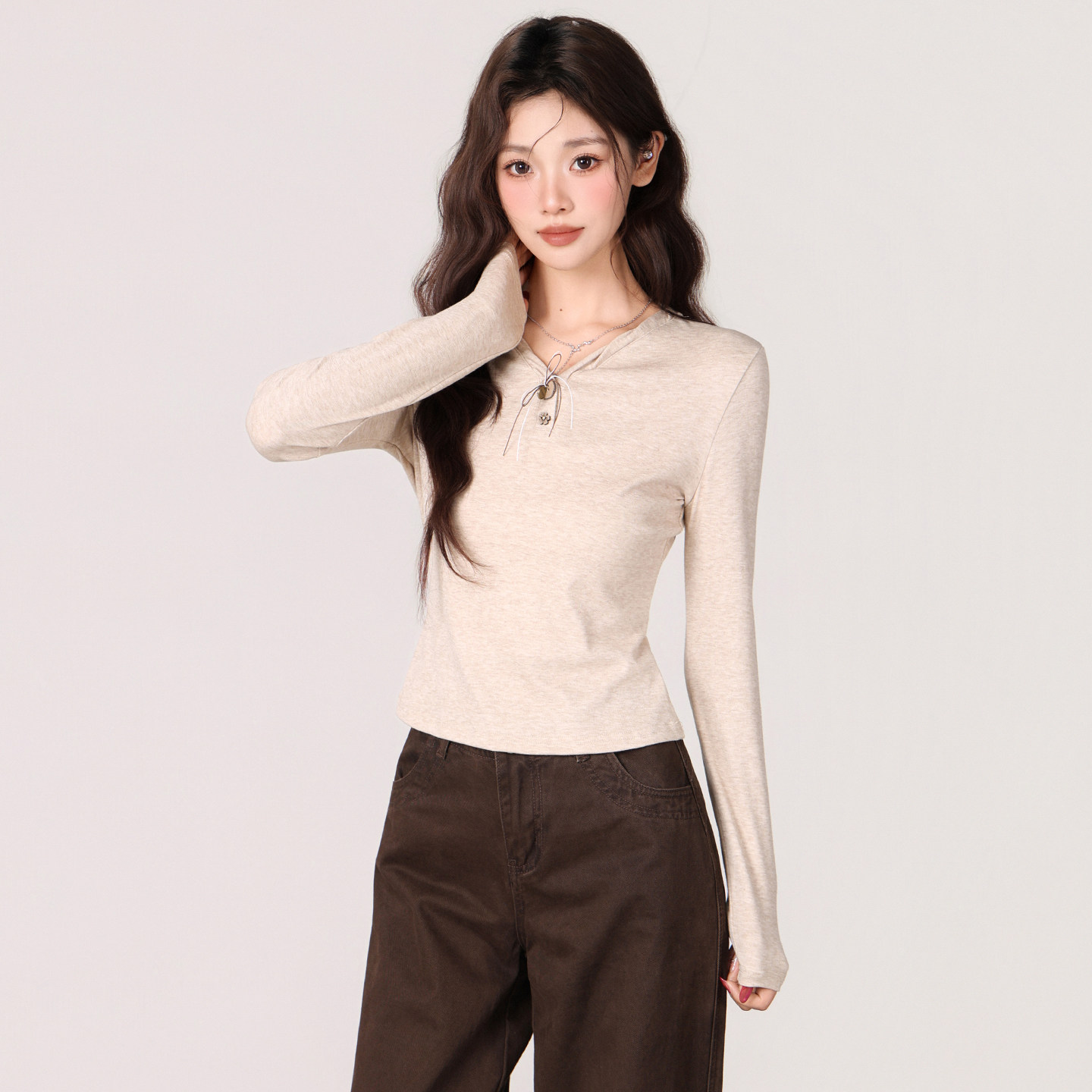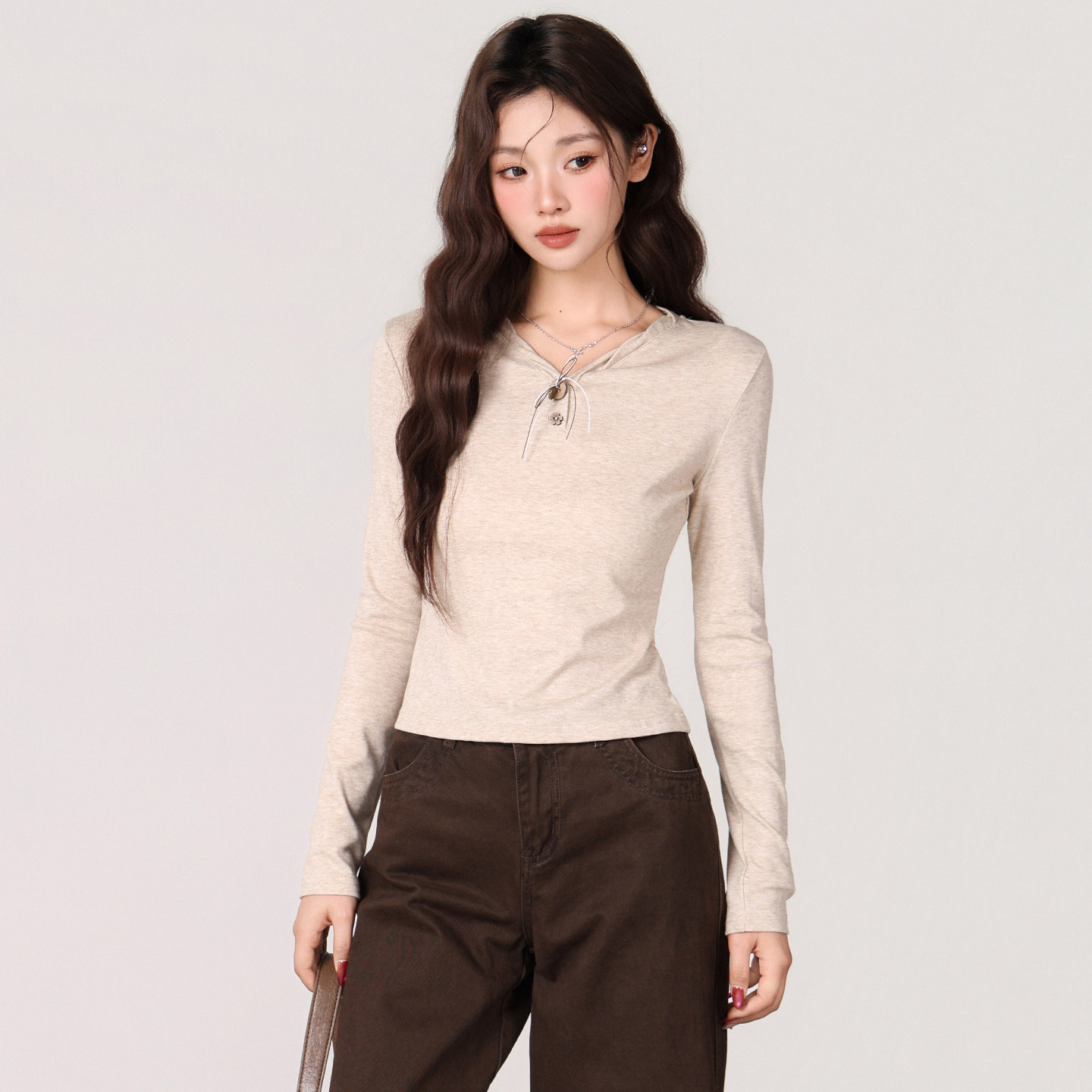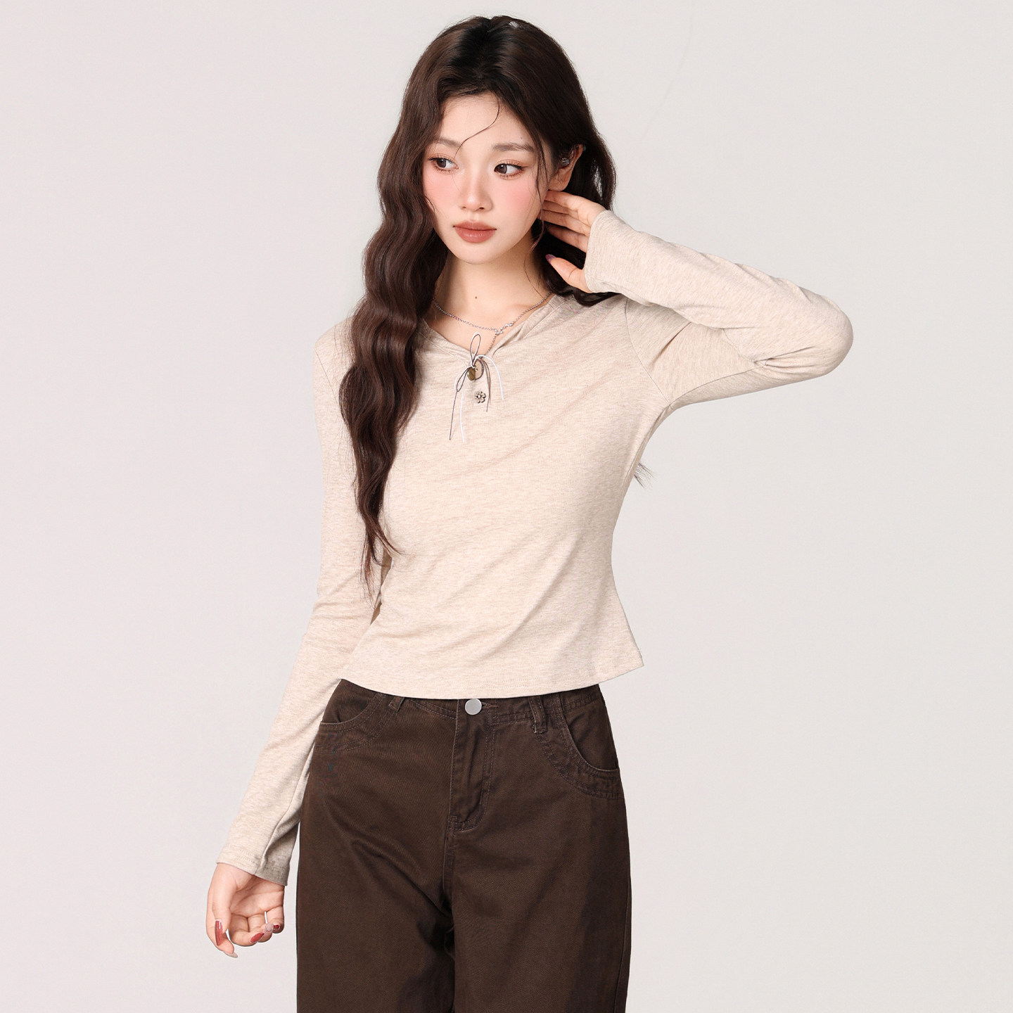 Stylish and Unique Long-Sleeve T-Shirt for Women, Suitable as a Base Layer in Autumn and Winter, Oatmeal Color, Regular Shoulder Fit, Versatile, Slim-Fit Top