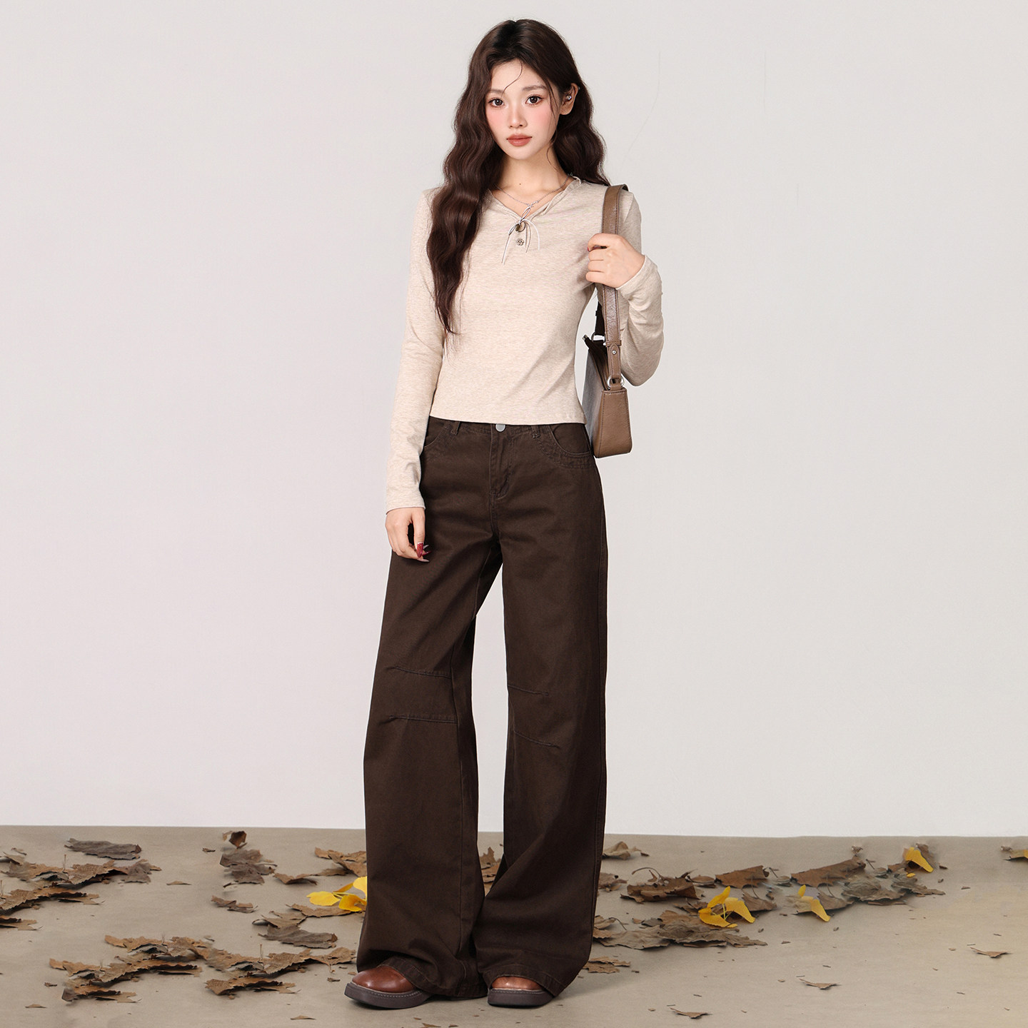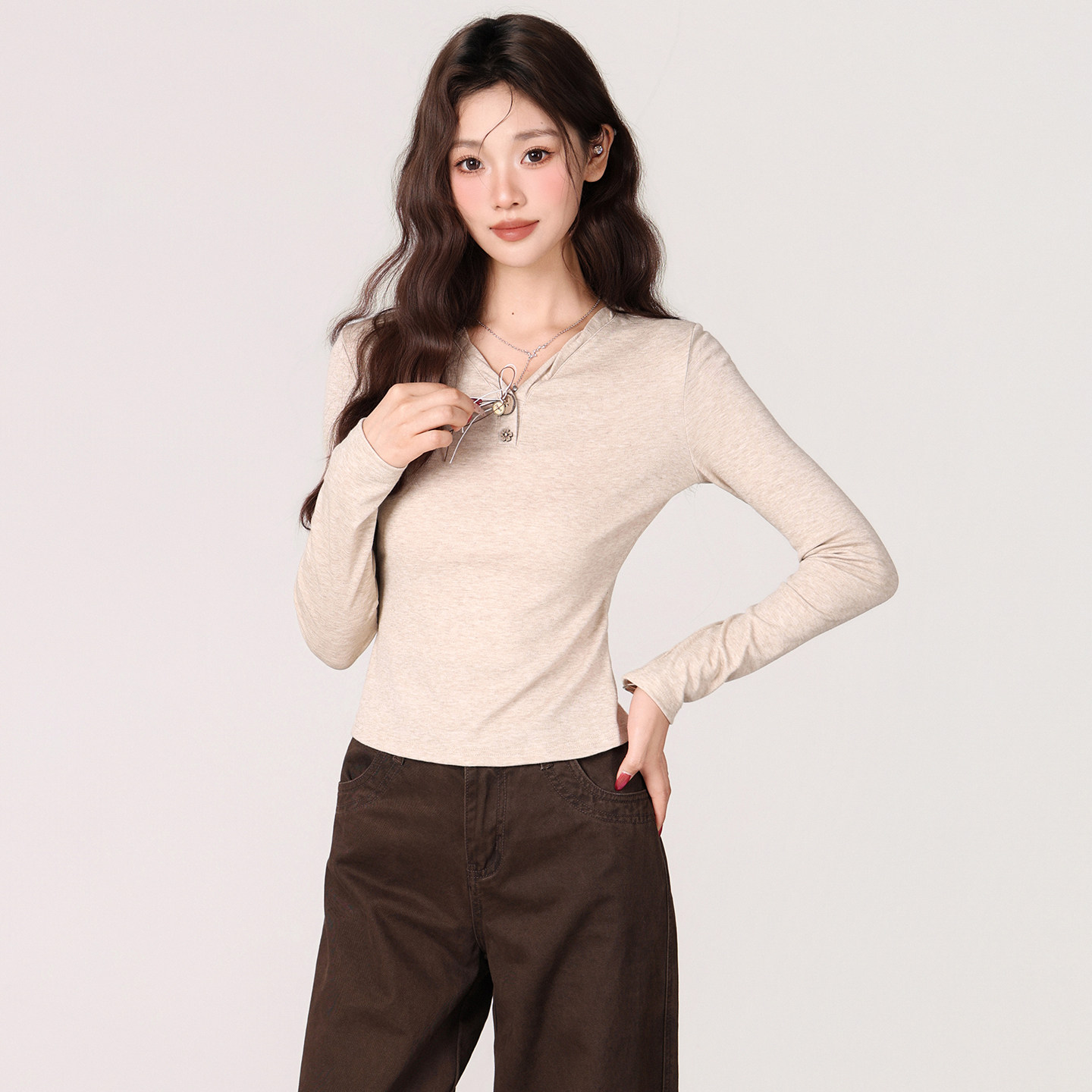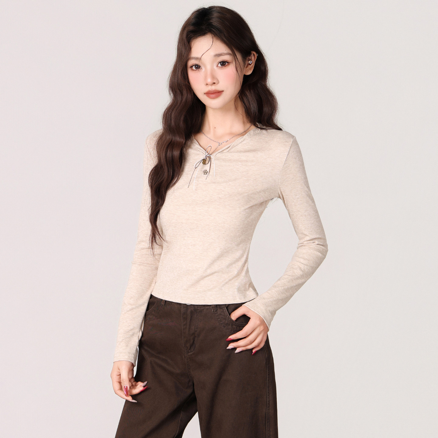 Stylish and Unique Long-Sleeve T-Shirt for Women, Suitable as a Base Layer in Autumn and Winter, Oatmeal Color, Regular Shoulder Fit, Versatile, Slim-Fit Top