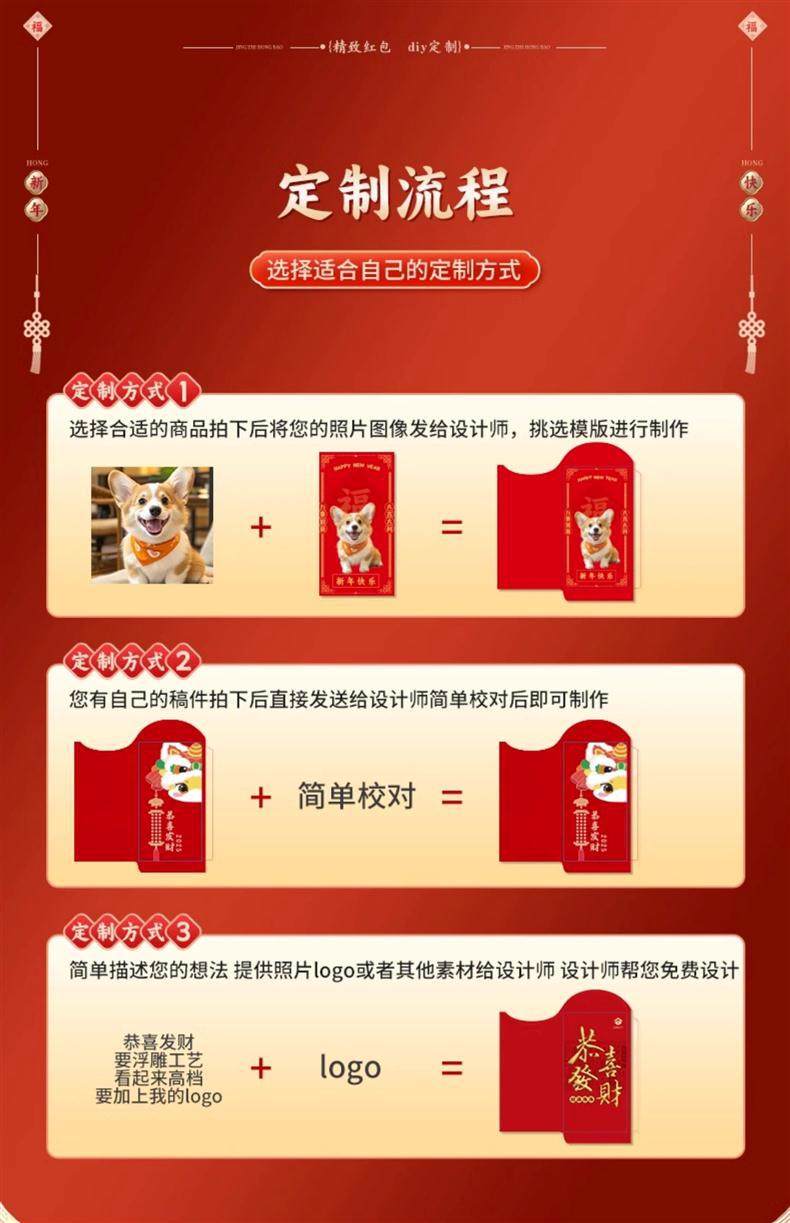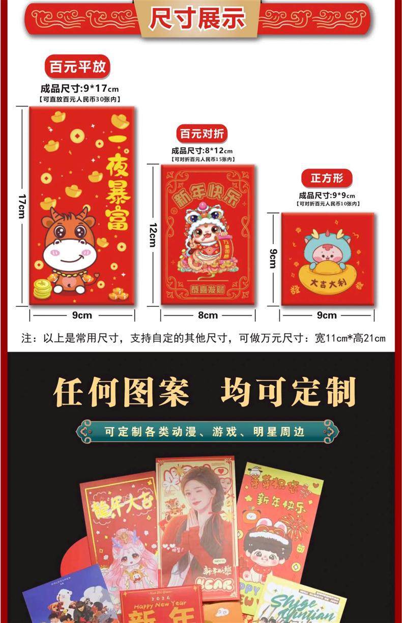 Sort by color Support free design and customization,Enterprise customized professional designer 1V1 design to satisfaction,High-definition color printing on coated paper with tens of thousands of colors,Ice white star color pearlescent paper matte texture,Customized high-quality red envelope boxes with more upscale packages,Massive red envelope templates, free consultation,Customized best-selling thousand-yuan bag, commonly used style (88*165mm),Customized cartoon square package (90*90mm),Customized popular 100-yuan bag (80*120mm),Professional designer layout design consultation customer service,Support DIY customized drawings and consult customer service