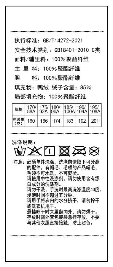 Down Filling Amount 160–201g