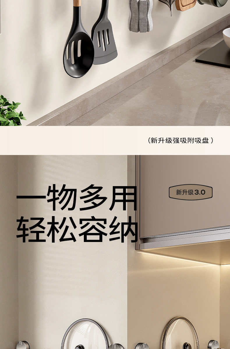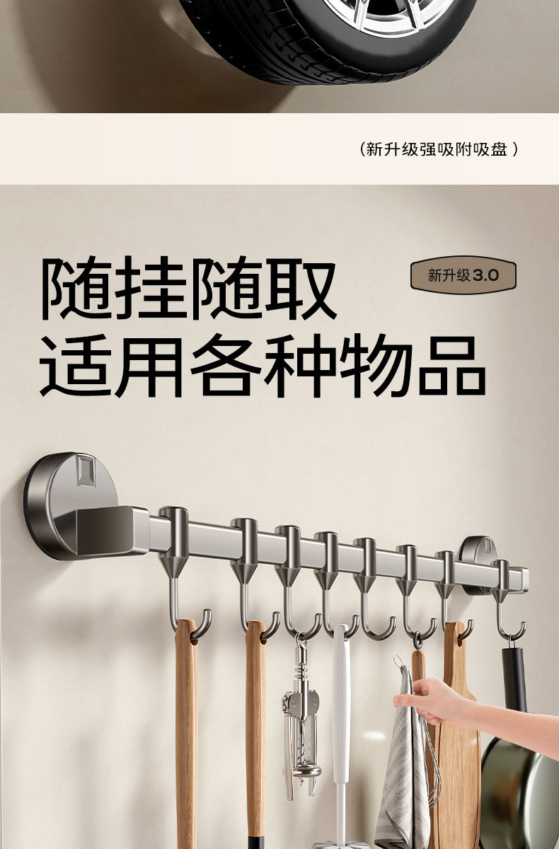Japanese Suction Cup Kitchen Hook, No-Drill Hanging Rod, Kitchen Storage Rack, Wall-Mounted Hook Rack for Hanging Spatulas and Spoons