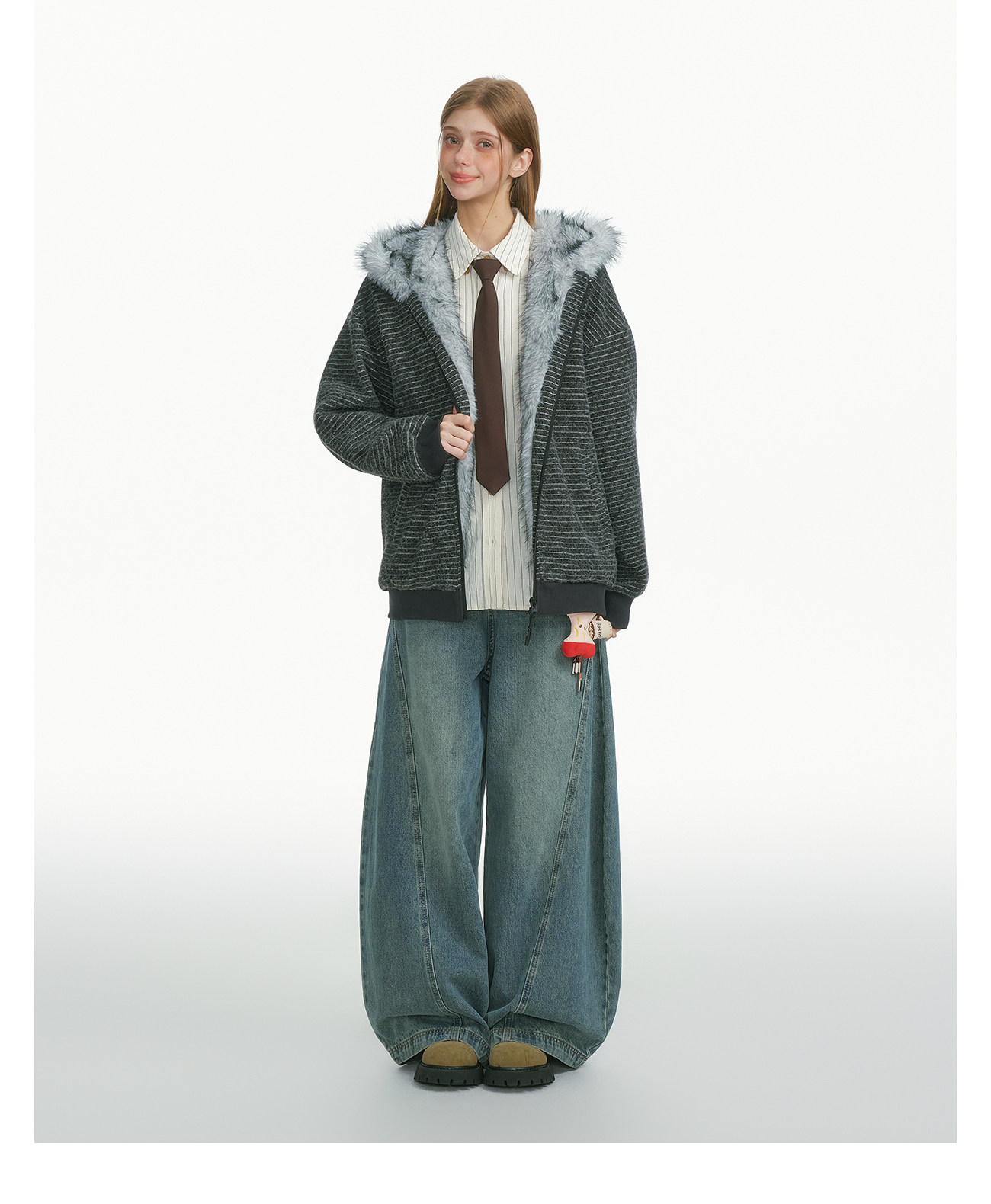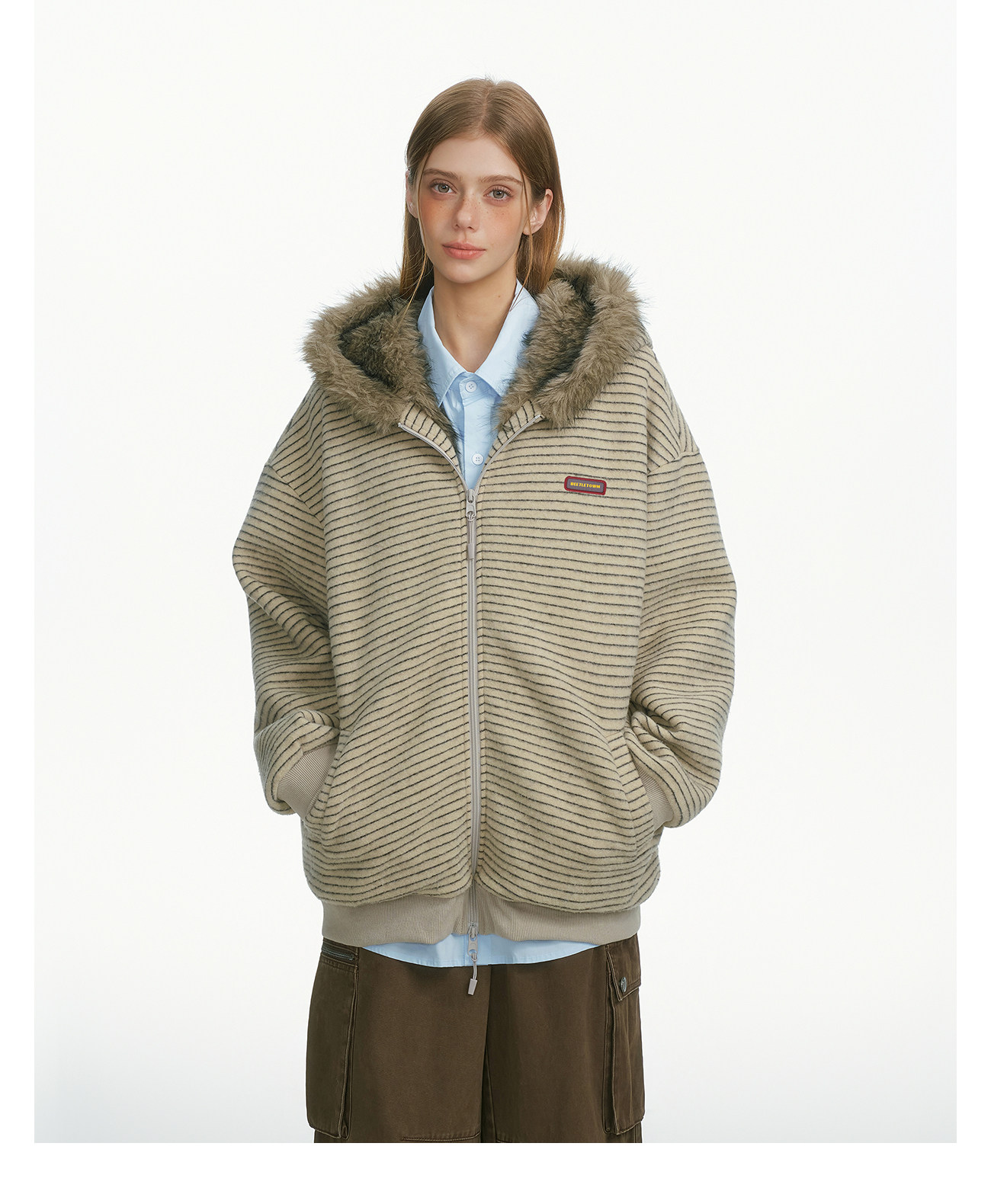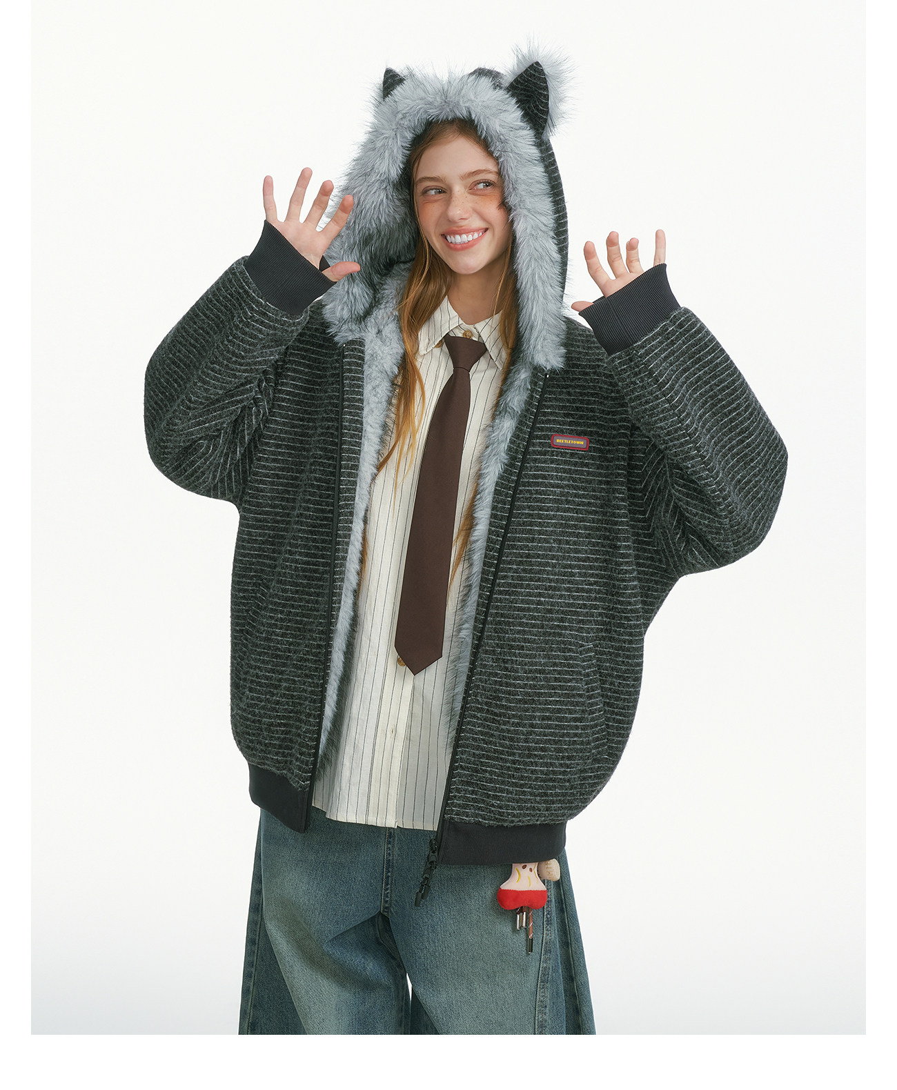 BEETLE TOWN Fun Ear Fur Collar Striped Thickened Cardigan Sweater Women's Autumn and Winter Couple Top Jacket