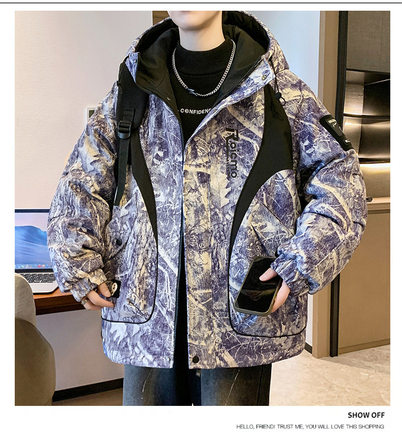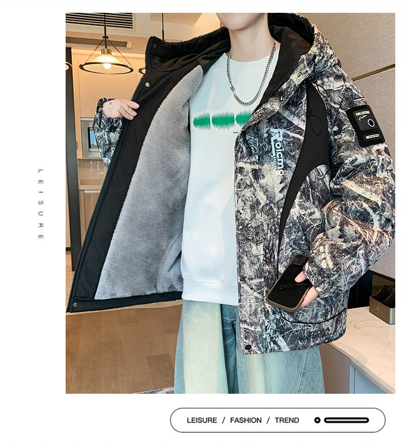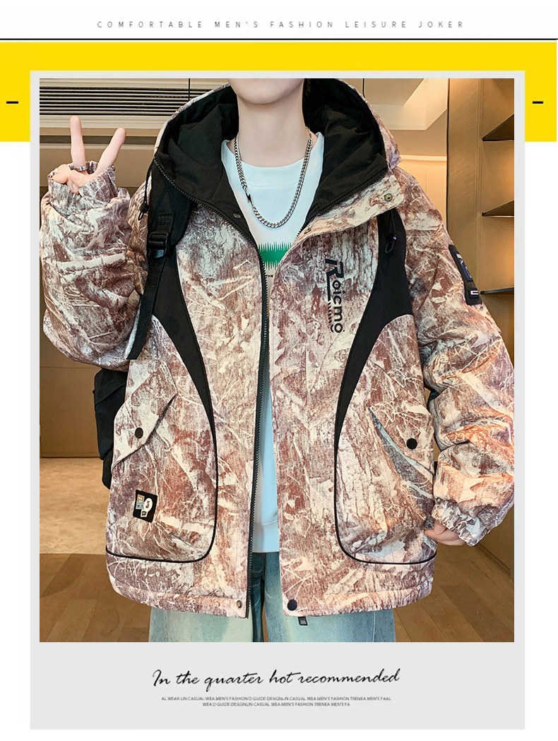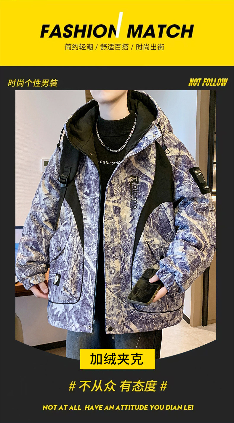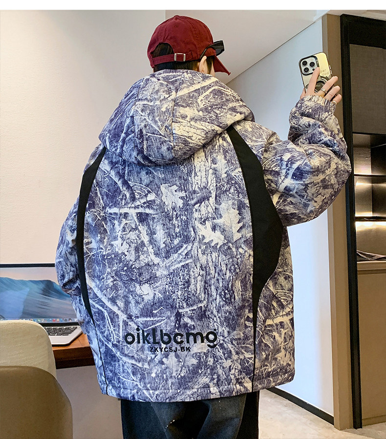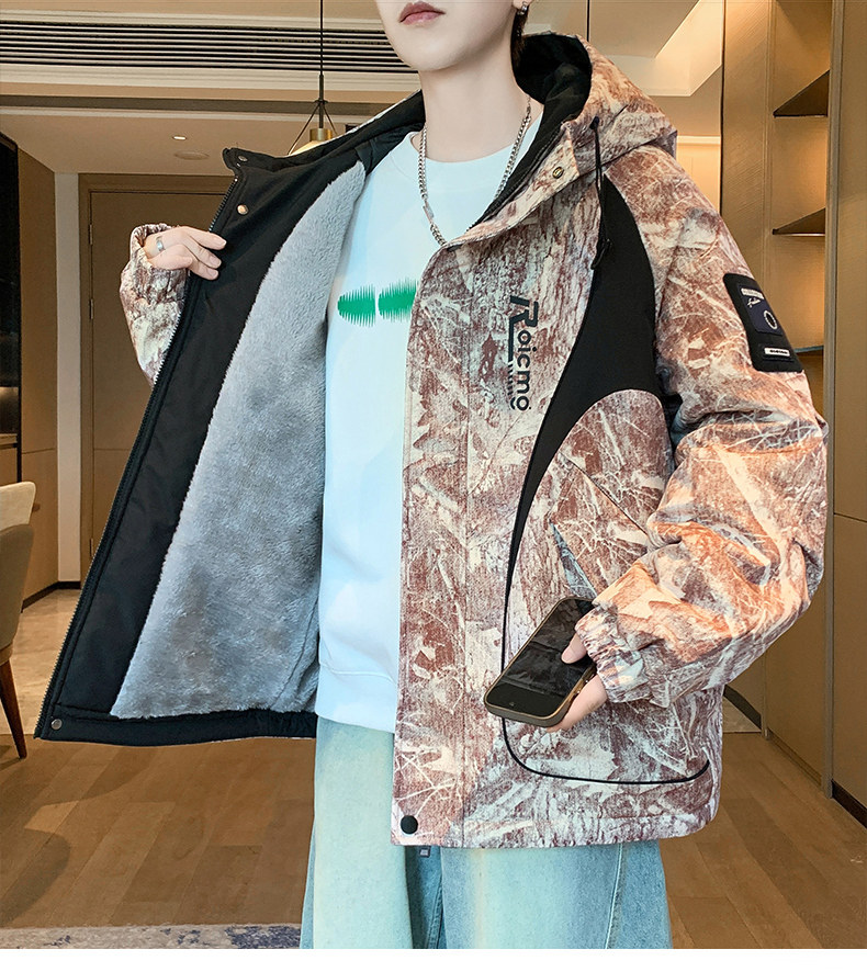 Plush jacket men's 2025 new autumn and winter thickened warm hooded cotton jacket American tie-dye style to overcome the trend