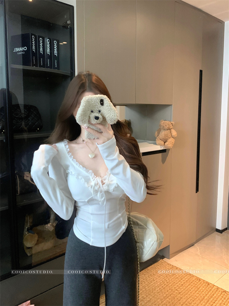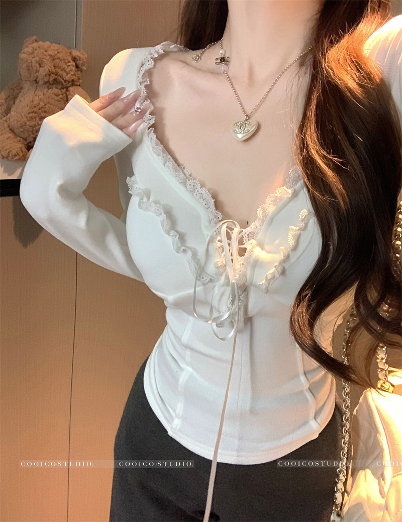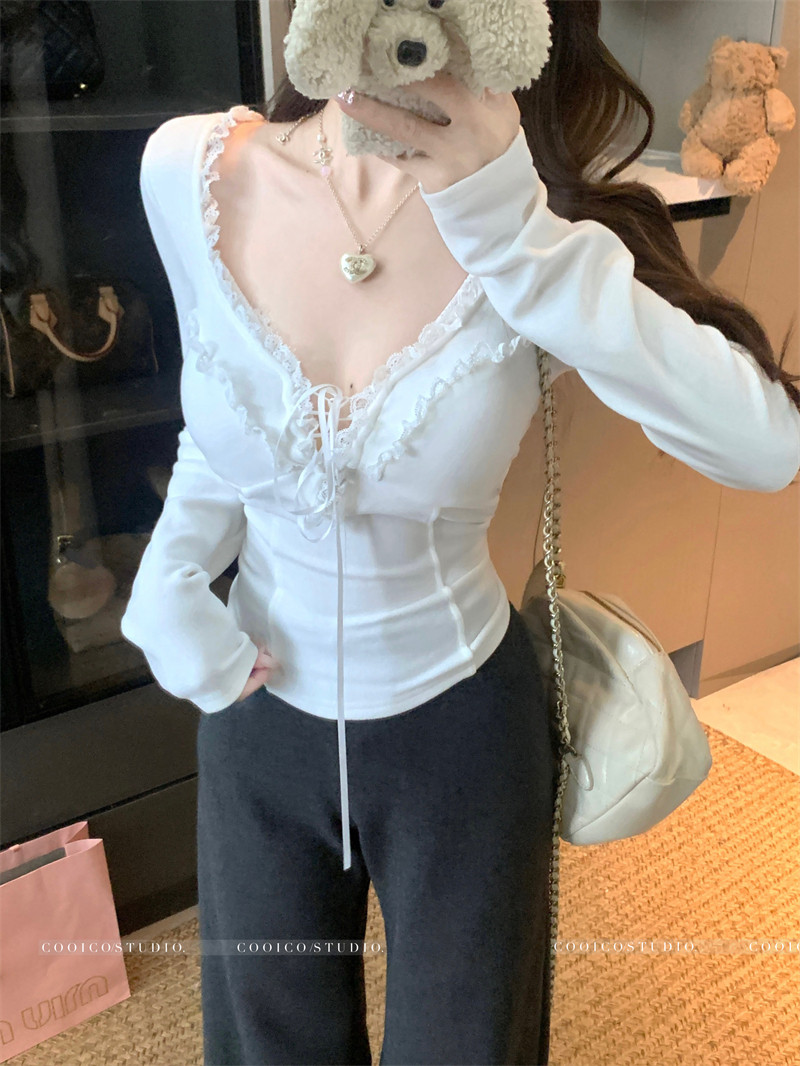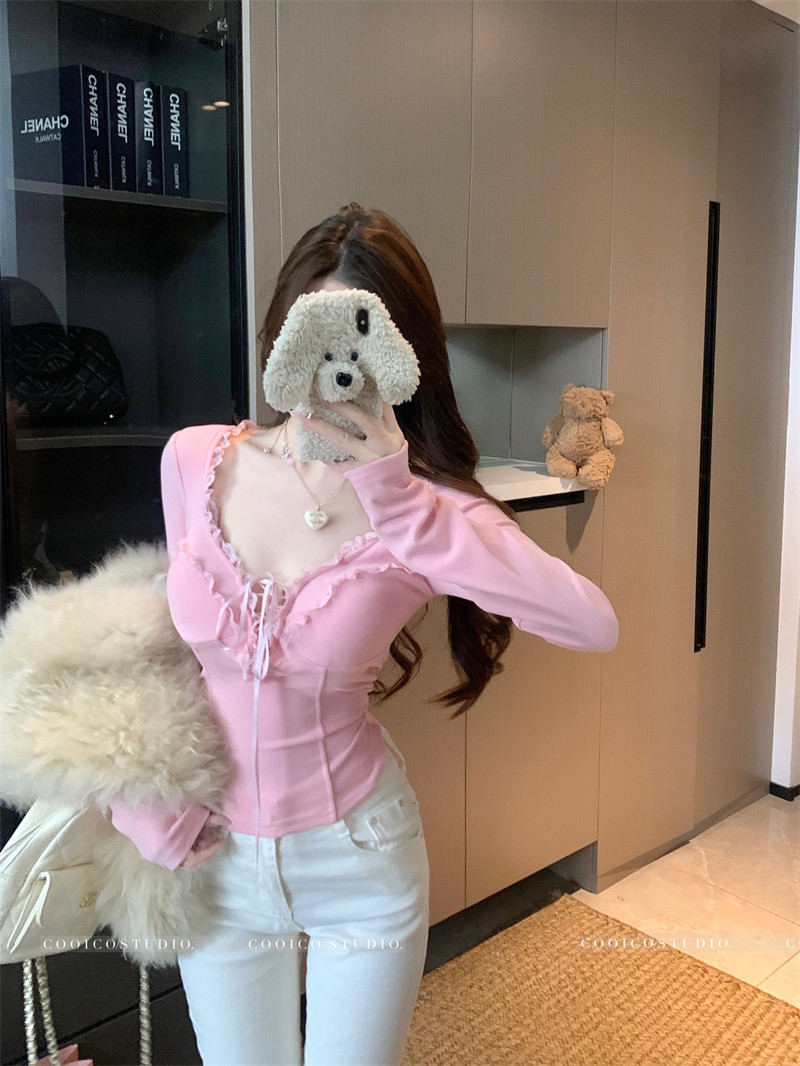 Lace-Trimmed V-Neck Tie-Up Long-Sleeve Base Shirt with Chest Pads for Women, New Winter Style, Sexy Pure Desire Style, Pink Slim-Fit T-Shirt