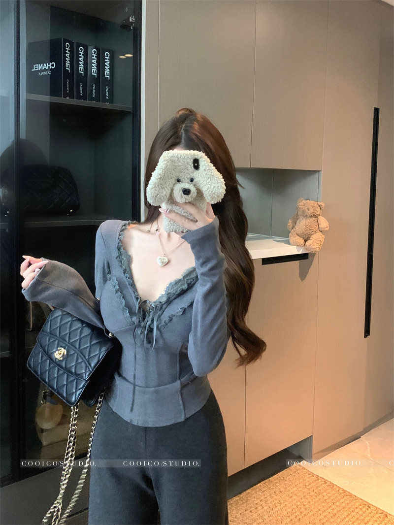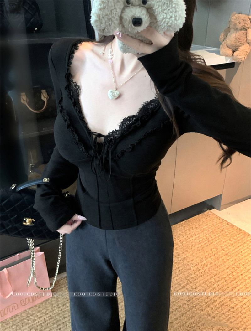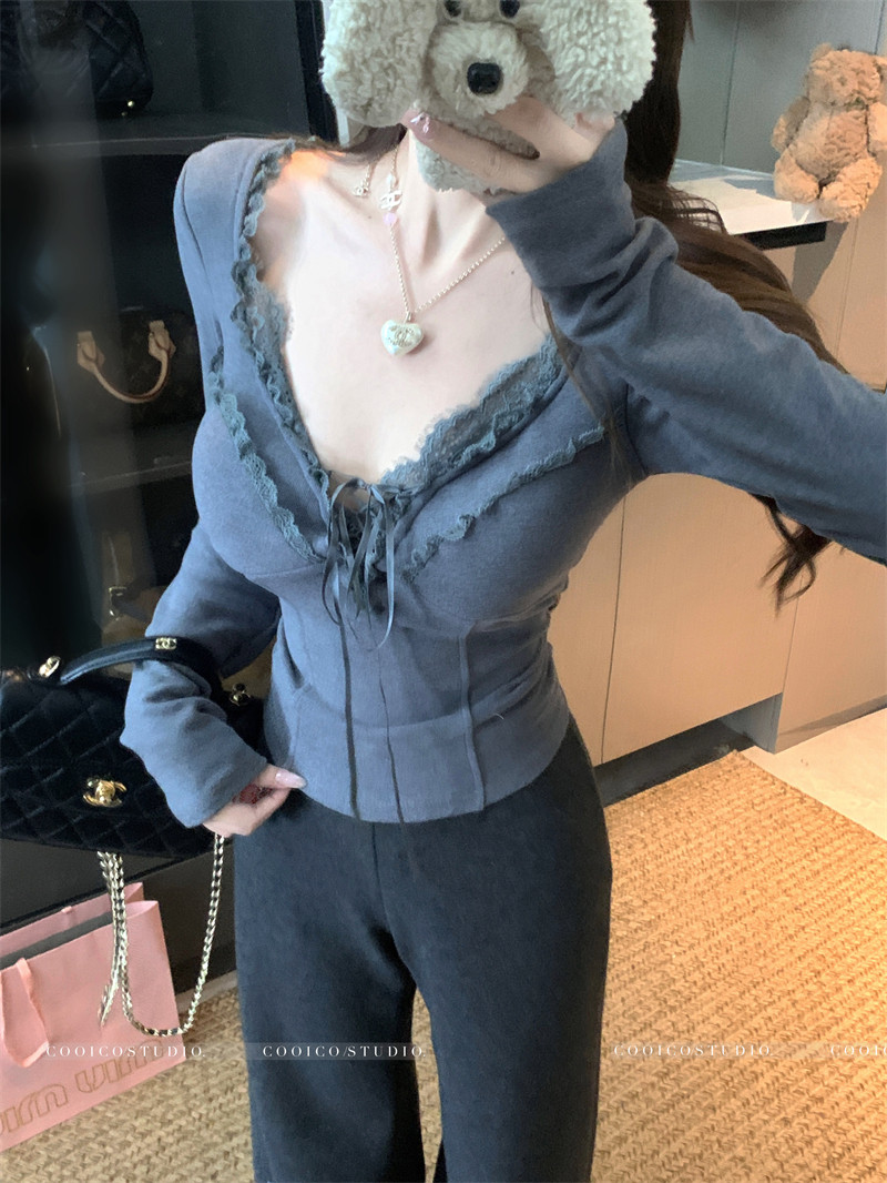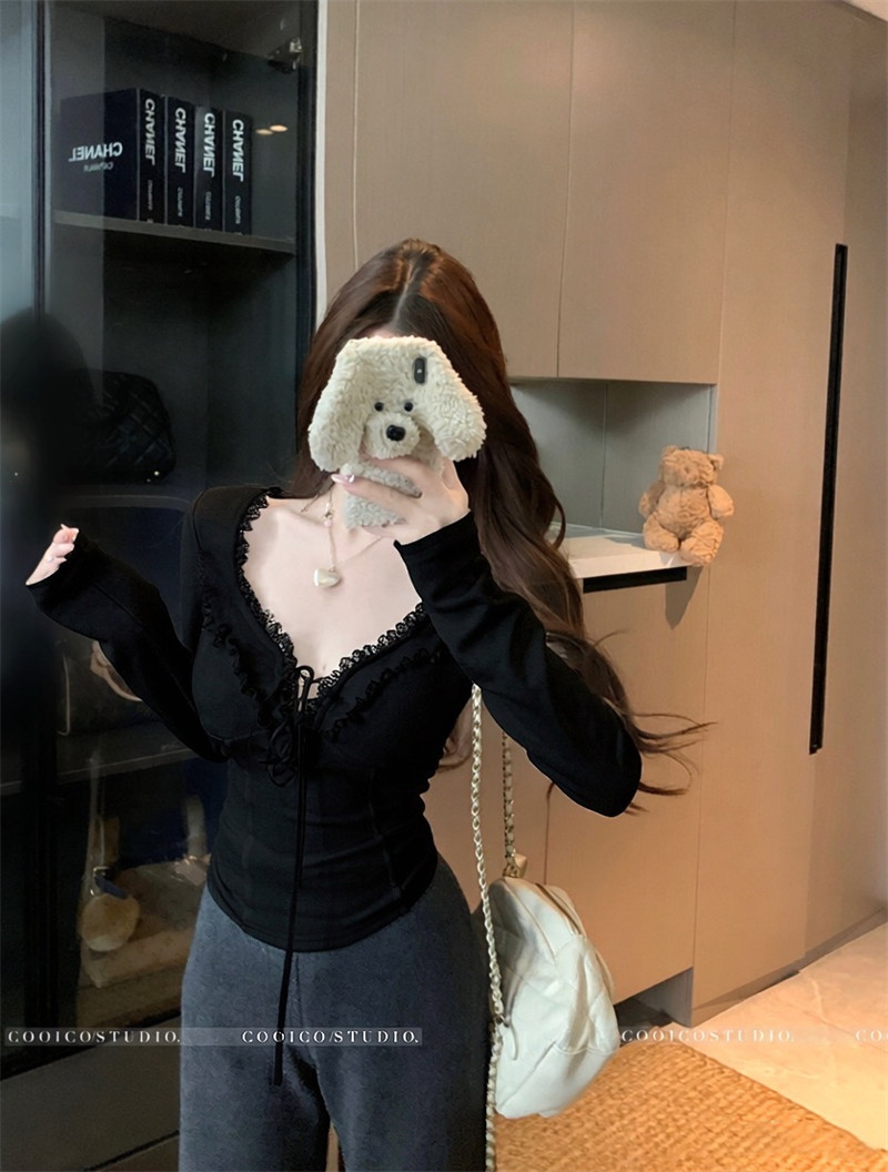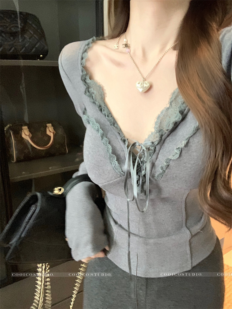 Lace-Trimmed V-Neck Tie-Up Long-Sleeve Base Shirt with Chest Pads for Women, New Winter Style, Sexy Pure Desire Style, Pink Slim-Fit T-Shirt