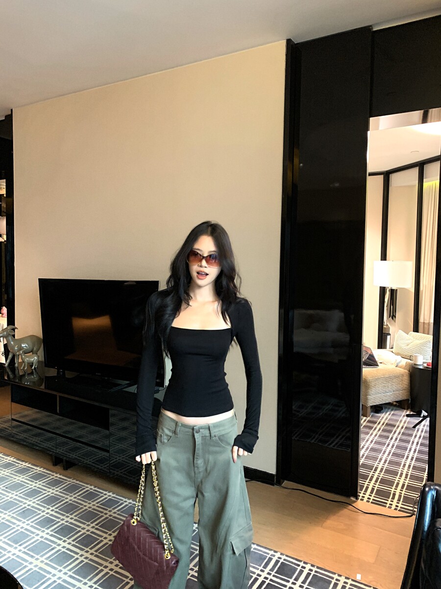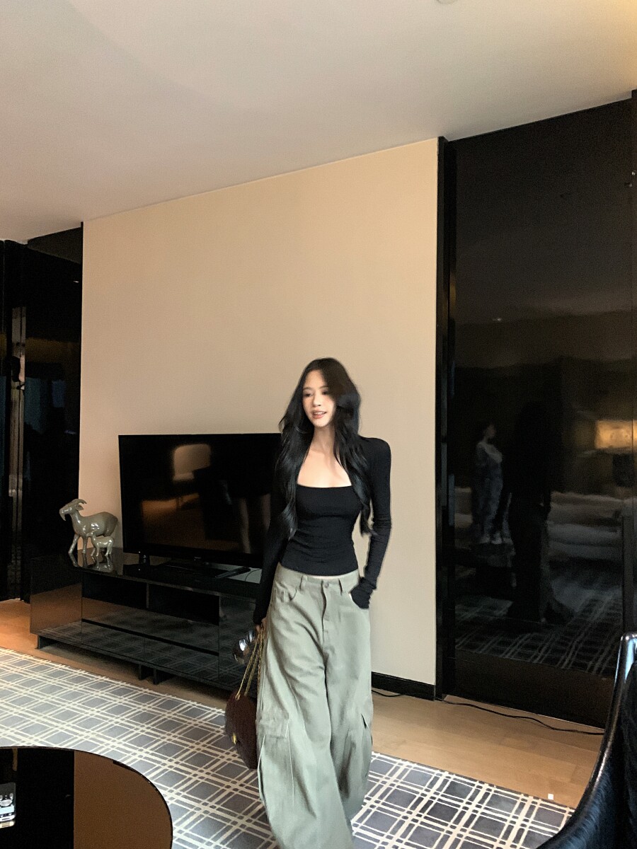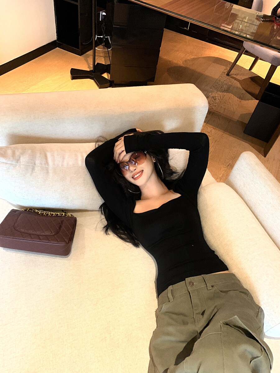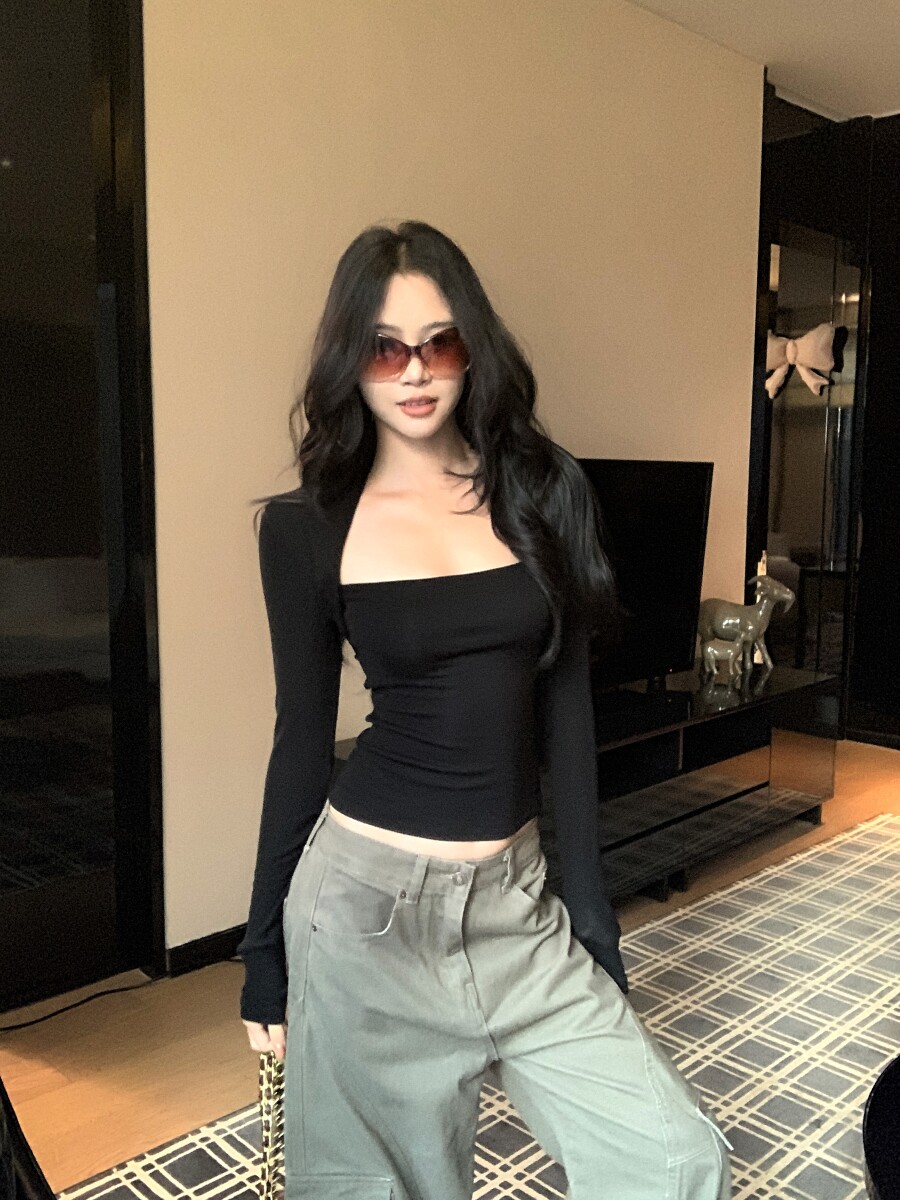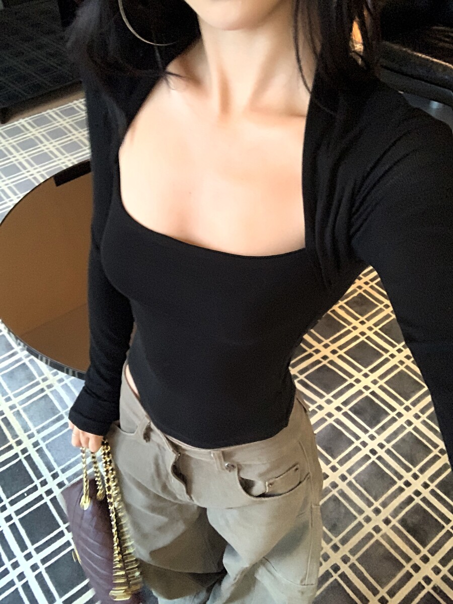 American-Style Black Square-Neck Long-Sleeve Base T-Shirt for Women, Autumn and Winter, Pure Desire Spicy Girl Slim-Fit Faux Two-Piece Low-Neck Top