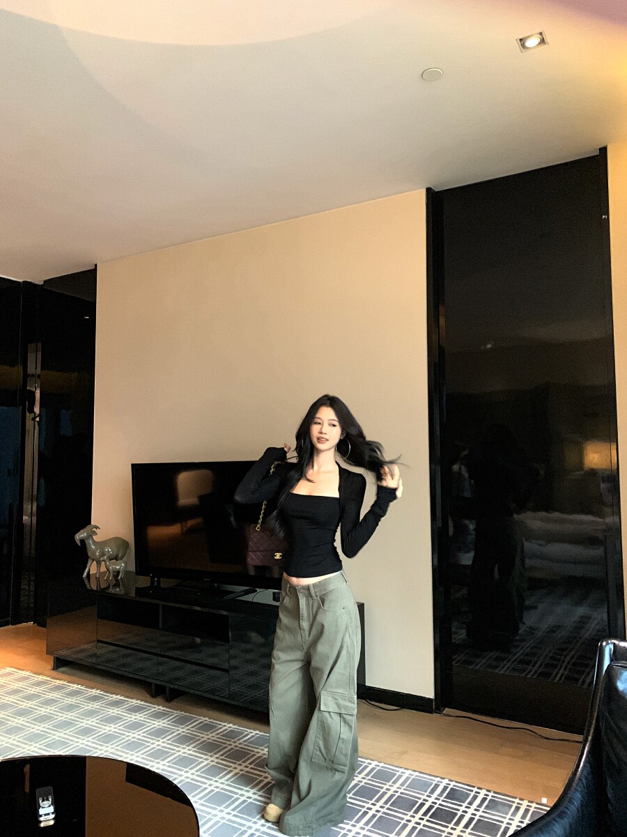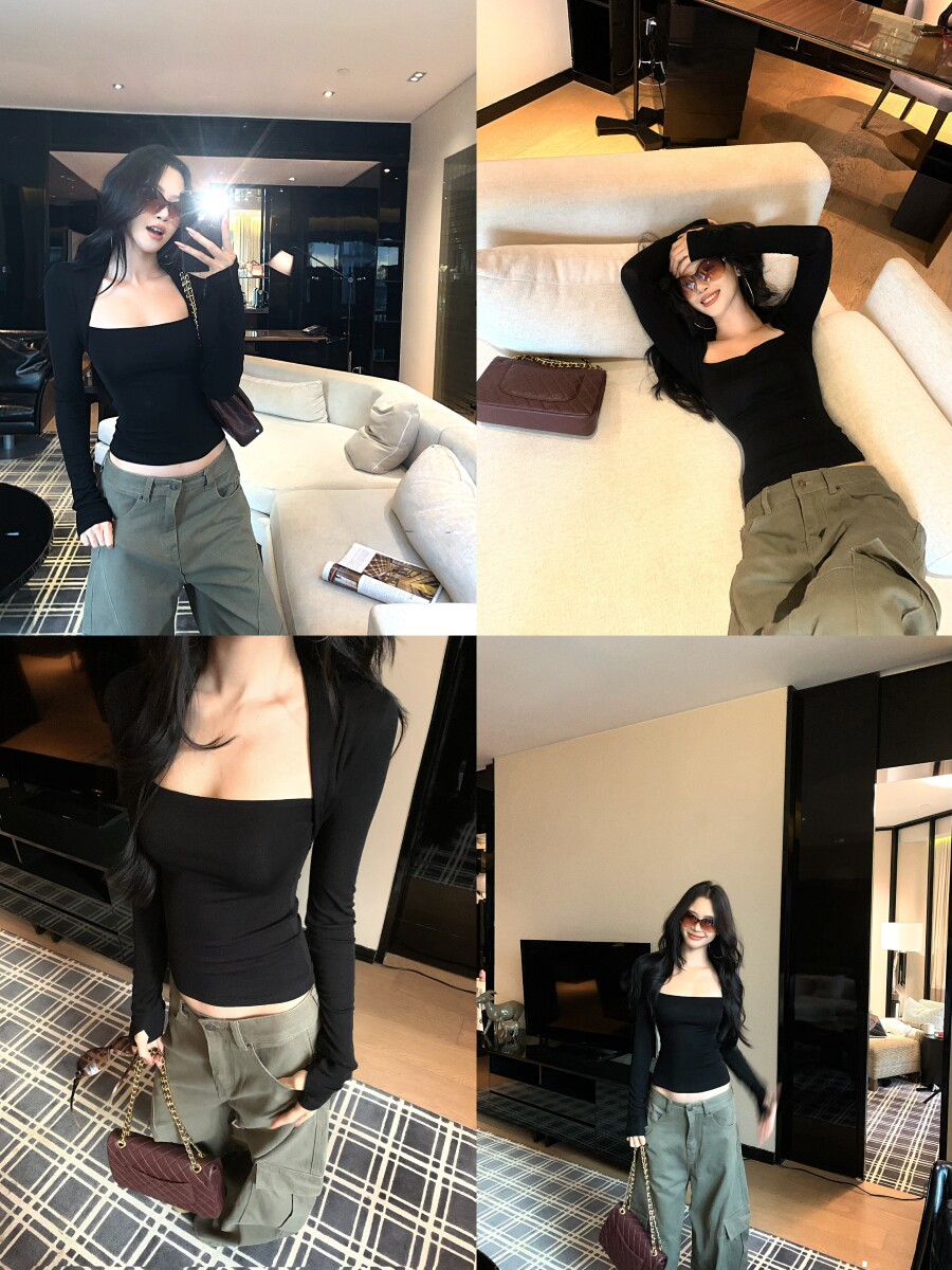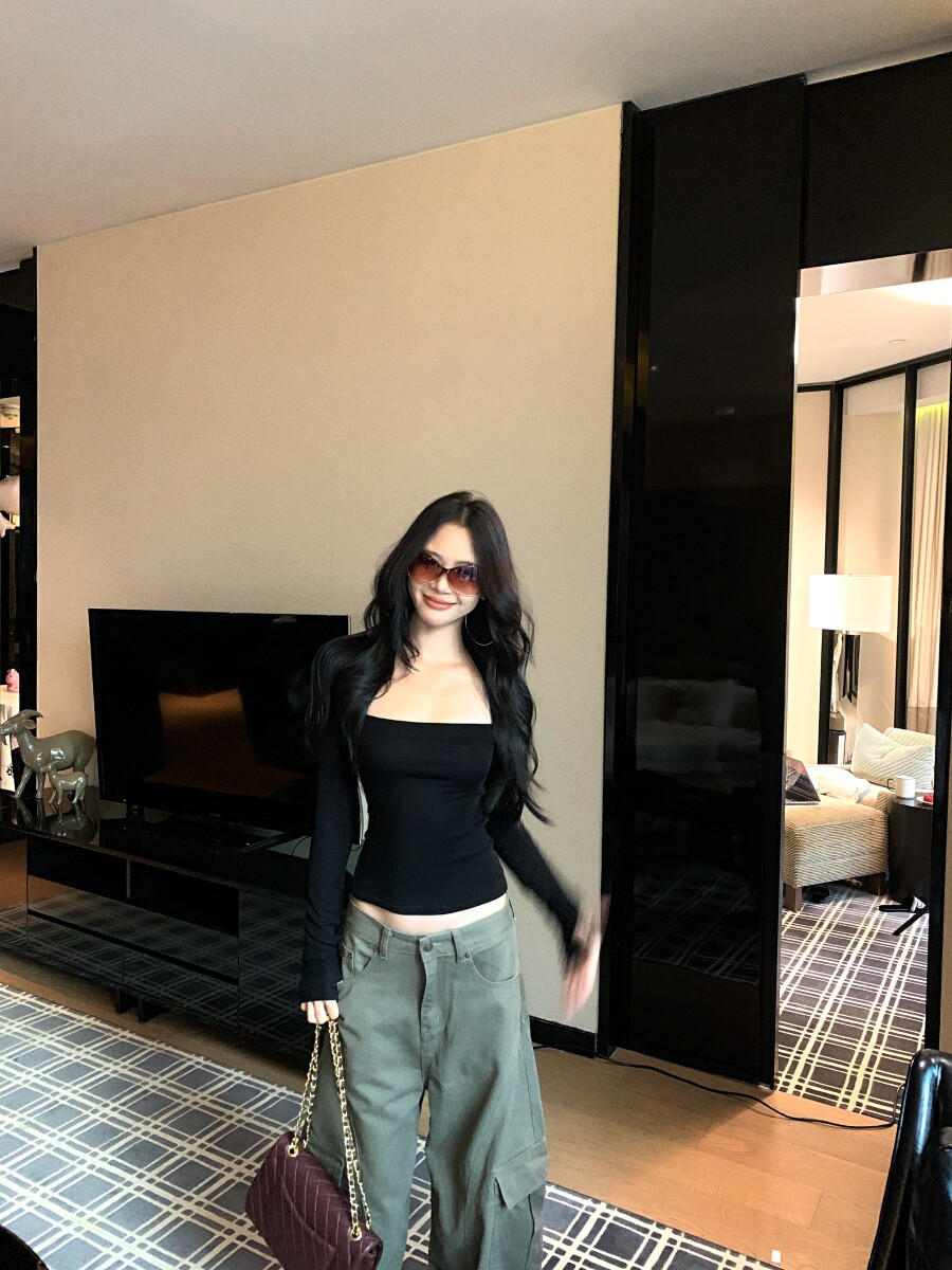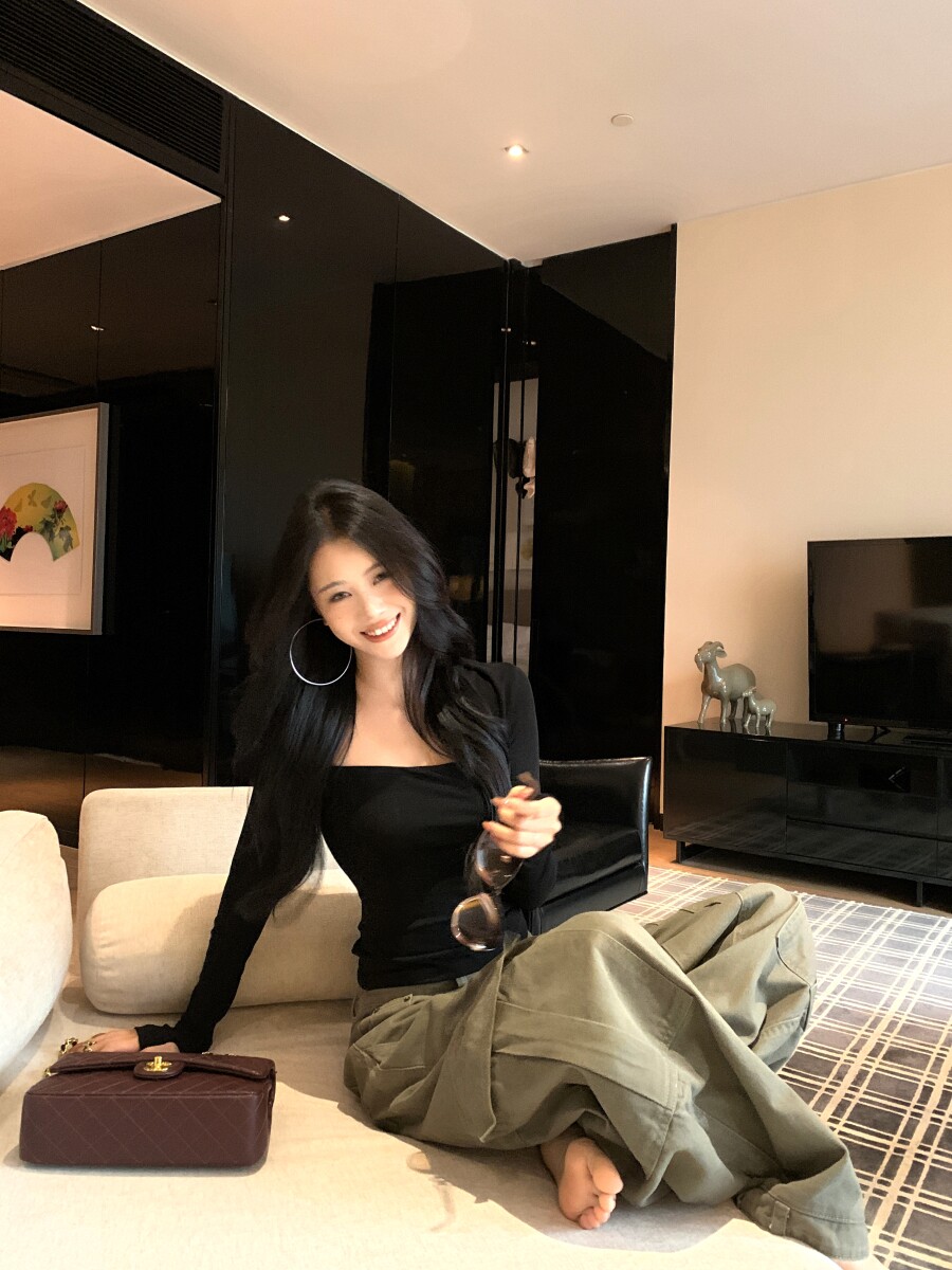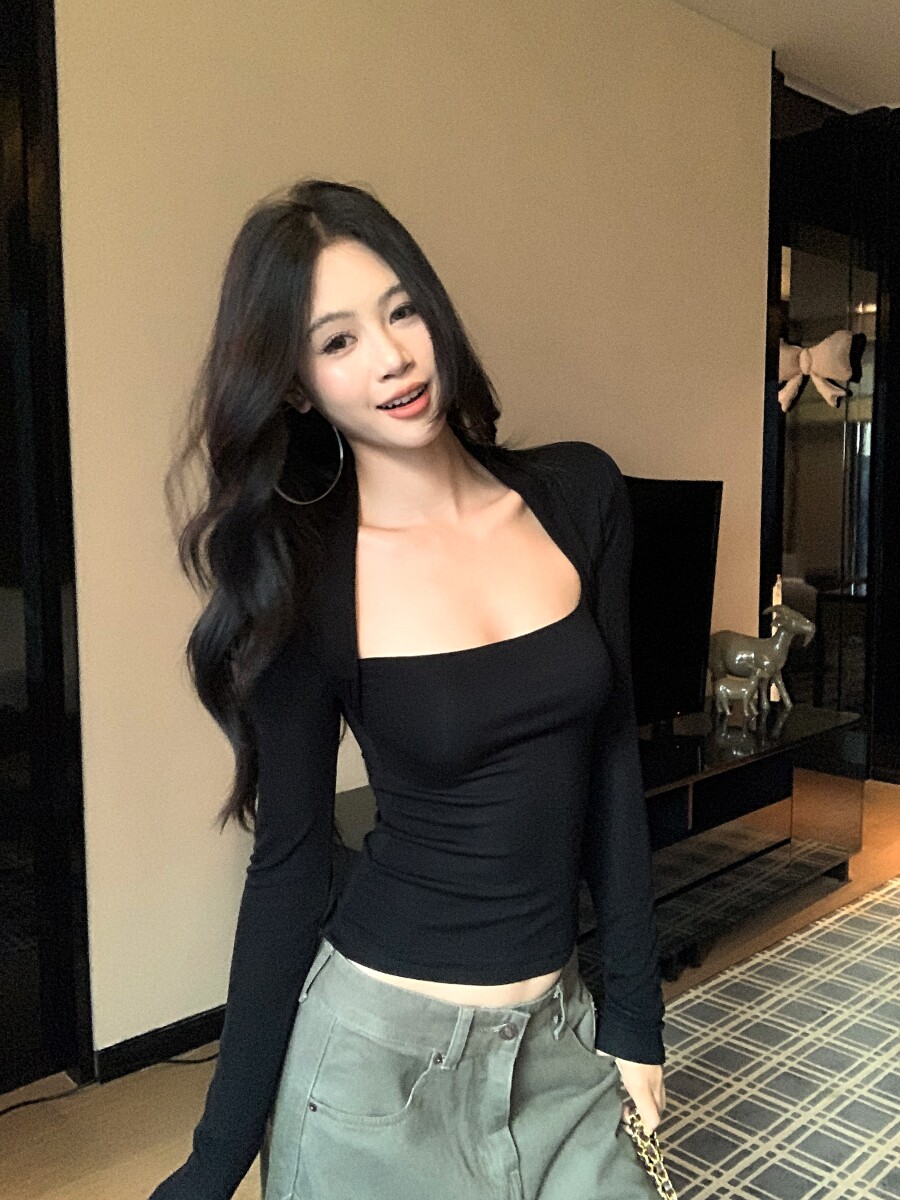 American-Style Black Square-Neck Long-Sleeve Base T-Shirt for Women, Autumn and Winter, Pure Desire Spicy Girl Slim-Fit Faux Two-Piece Low-Neck Top