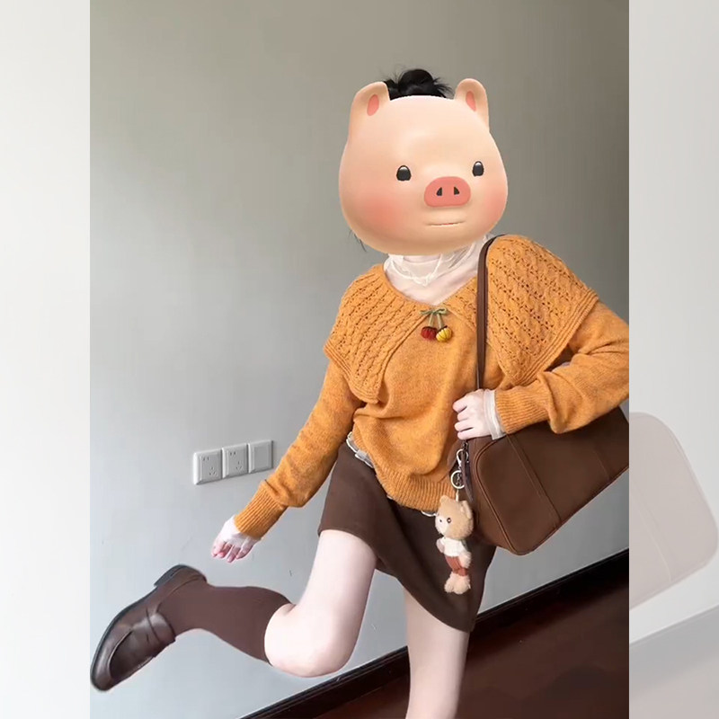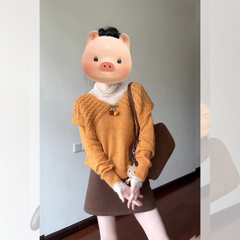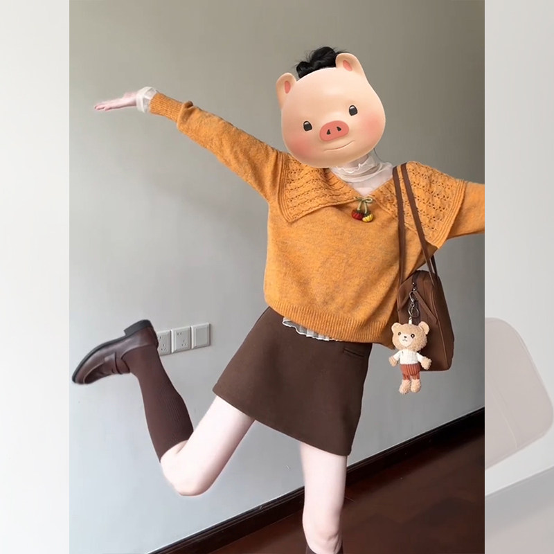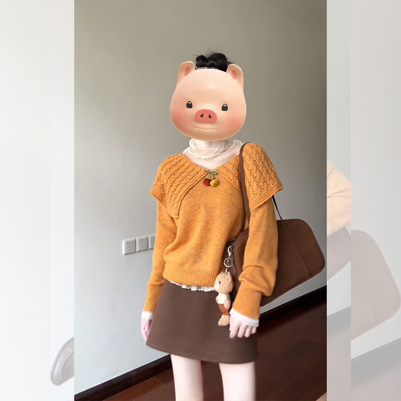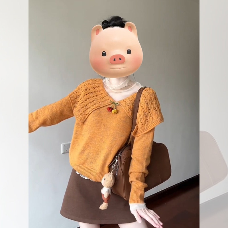 Orange Hollow-Out Crochet Large Lapel Knit Sweater for Women, Perfect for Fall and Winter, a Very Stylish Inner Layer or Base Shirt