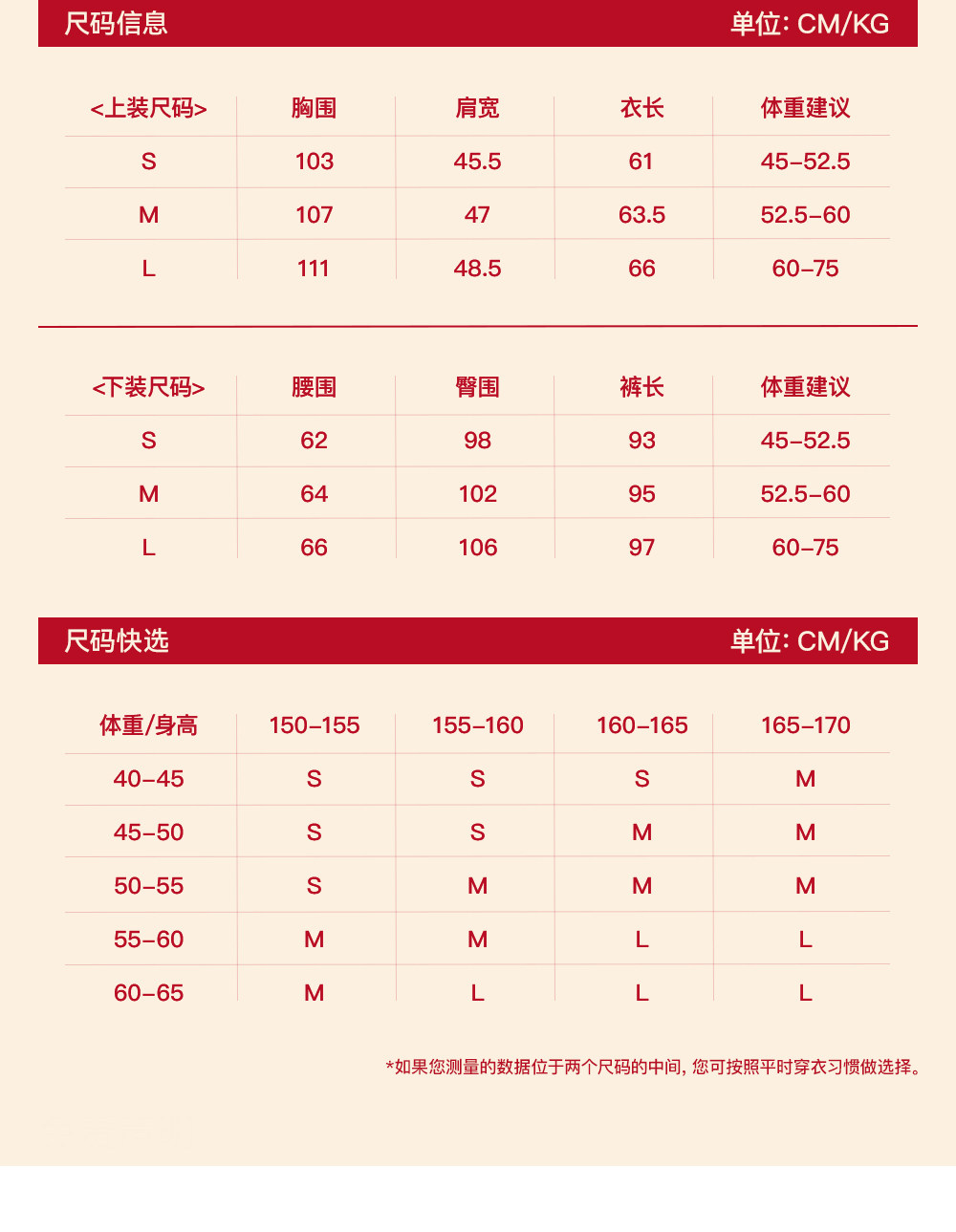 China (cm) 160-165/84-86 165-170 / 88-90 167-172 / 92-96 168-173 / 98-102 170-176 / 106-110