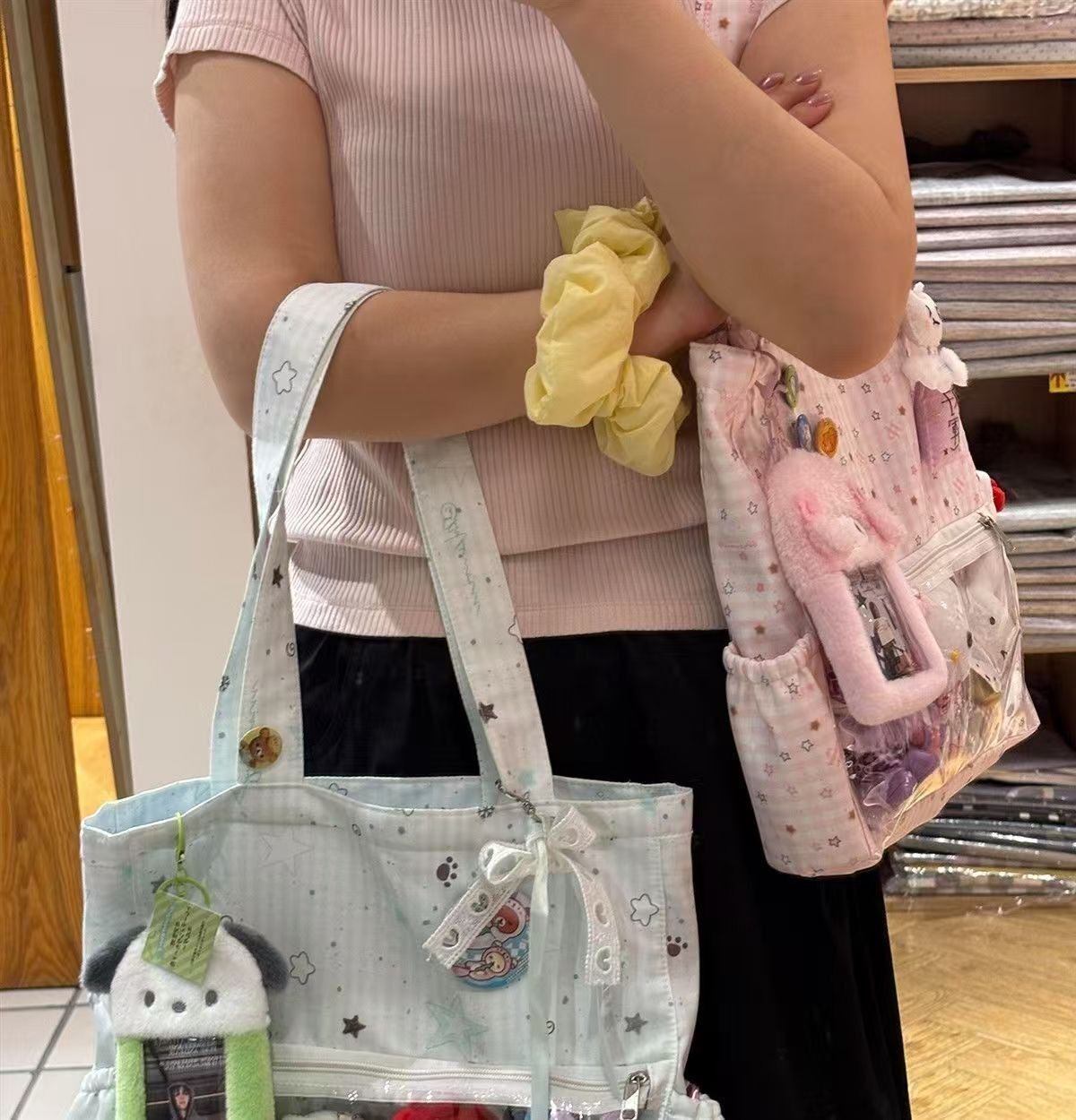 Mint Green Star-Patterned Japanese-Style School-Style Single-Shoulder Canvas Bag for Daily Commuting, Large Capacity Glove Tote Women's Bag