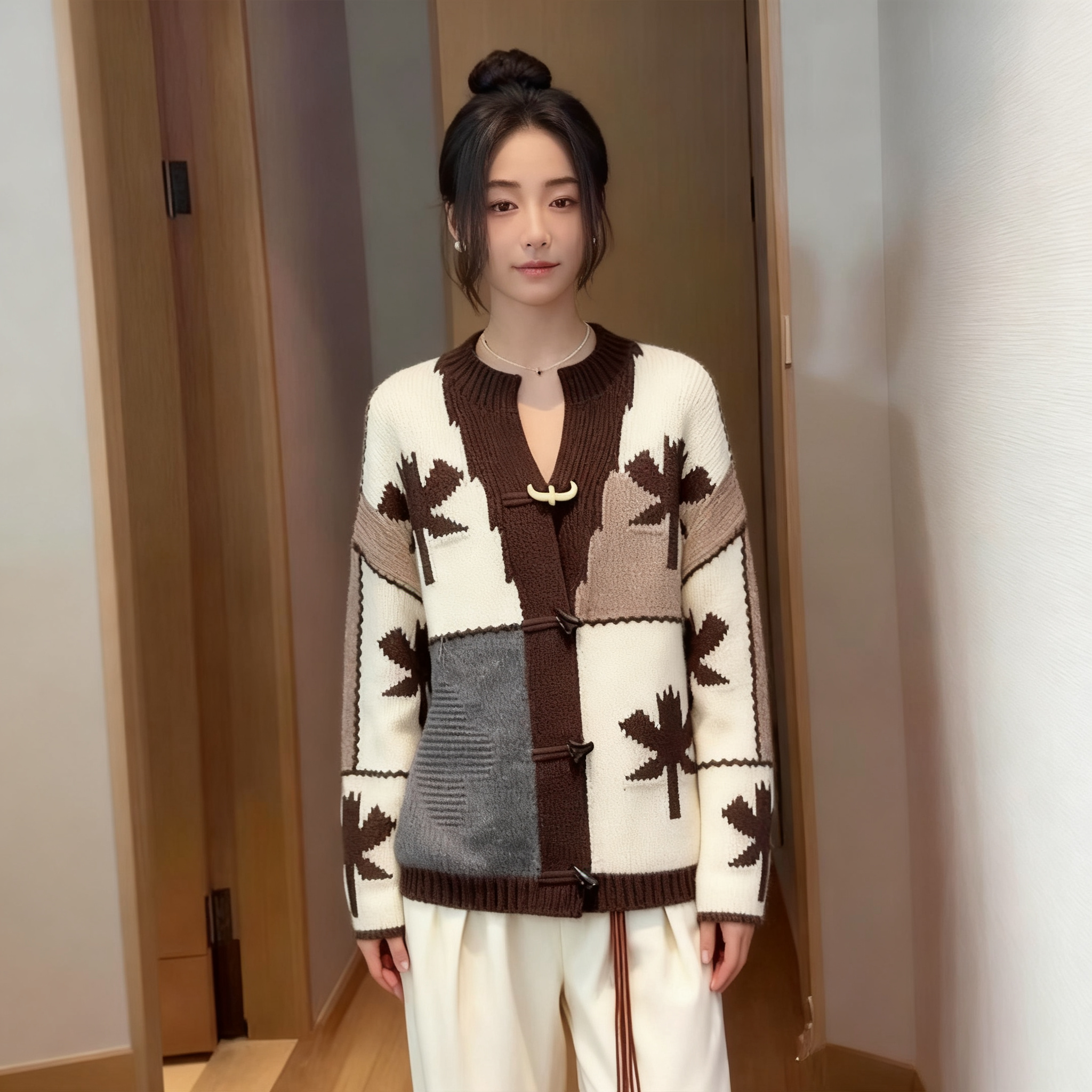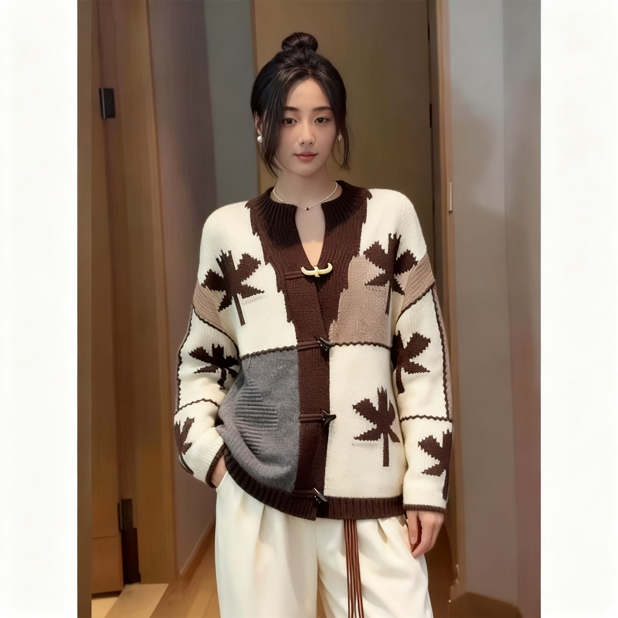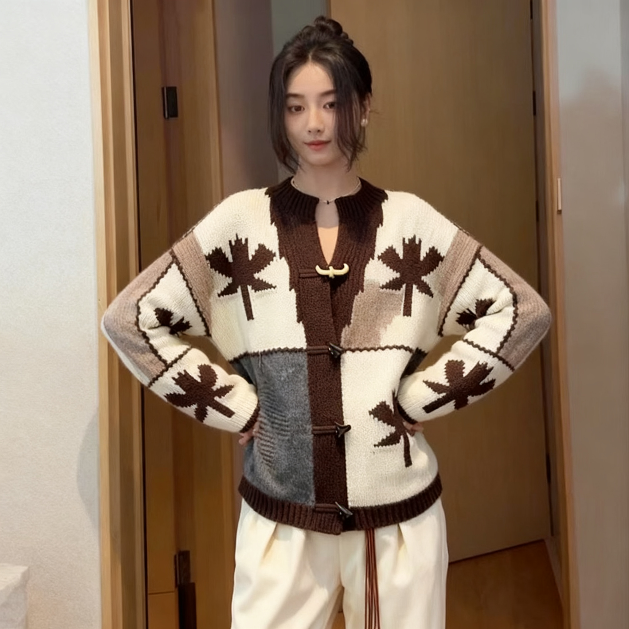 (in Stock) Women's Sweater 2025 Winter New Style Unique and Beautiful Color-Blocking Horn Button Knit Cardigan Jacket