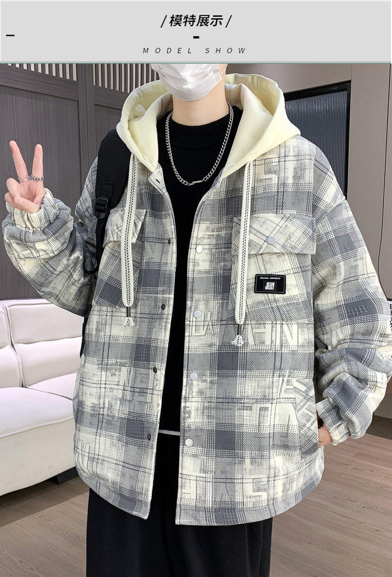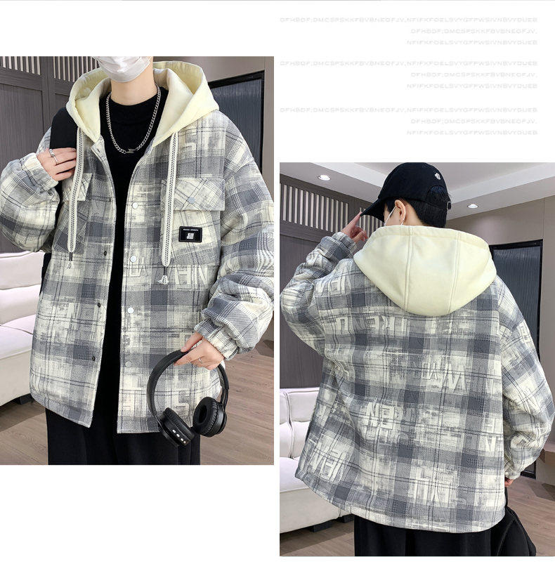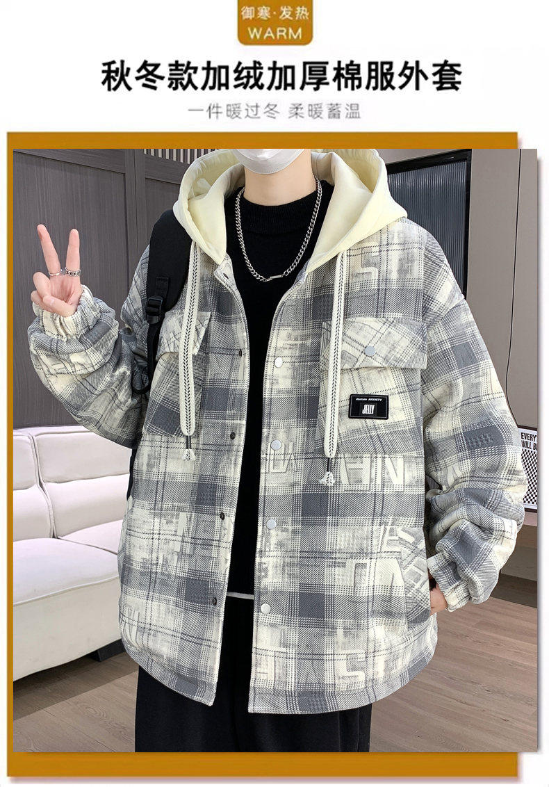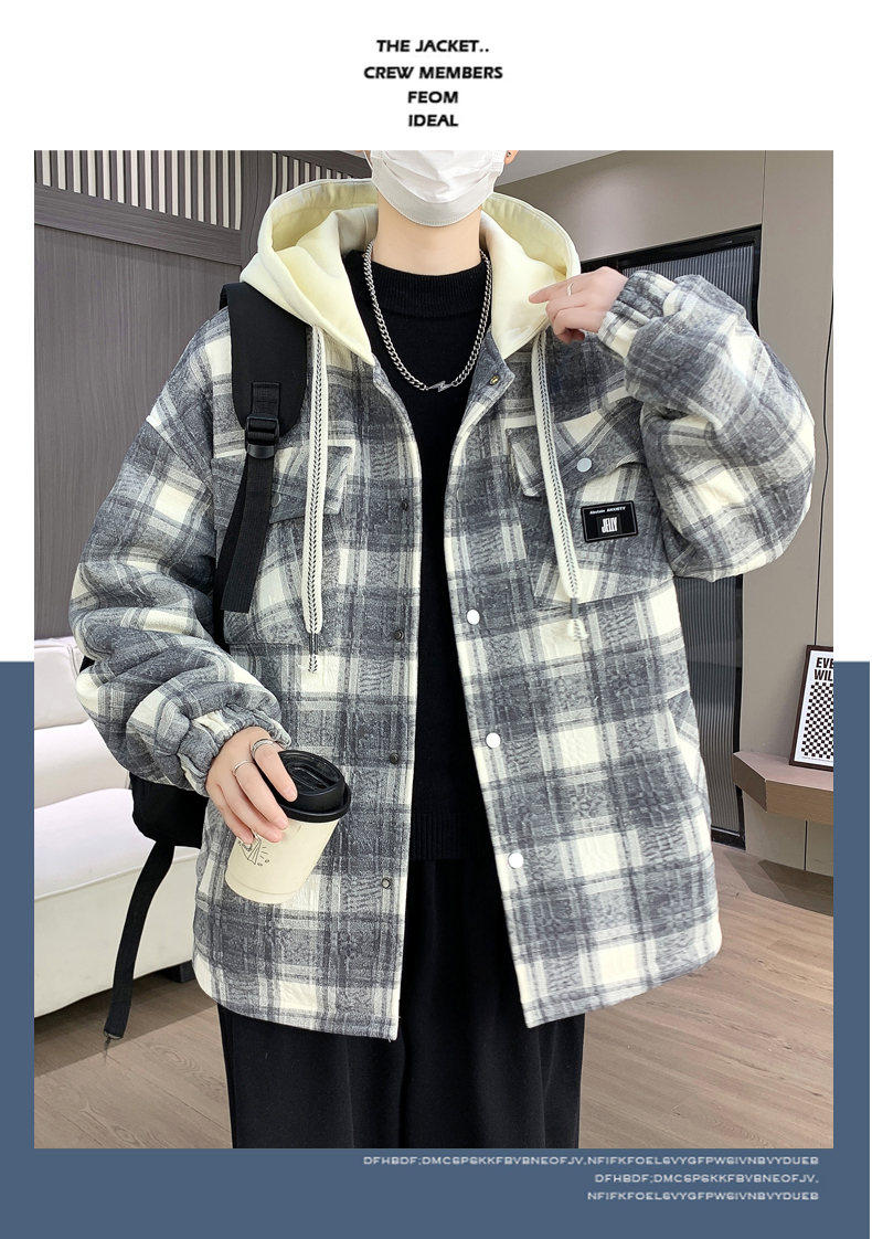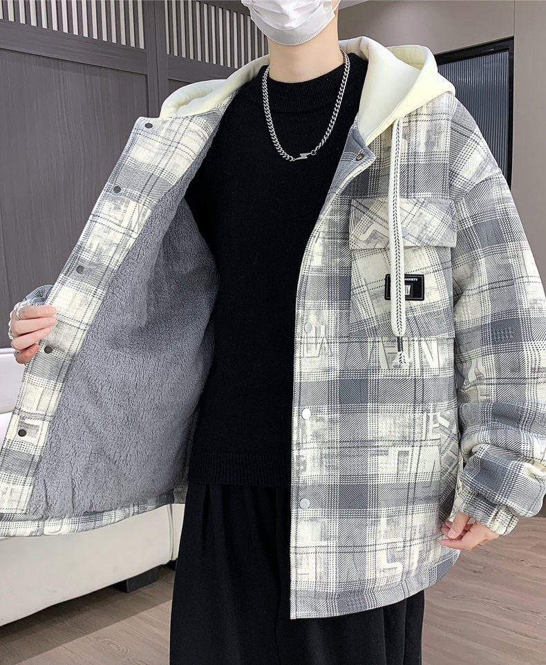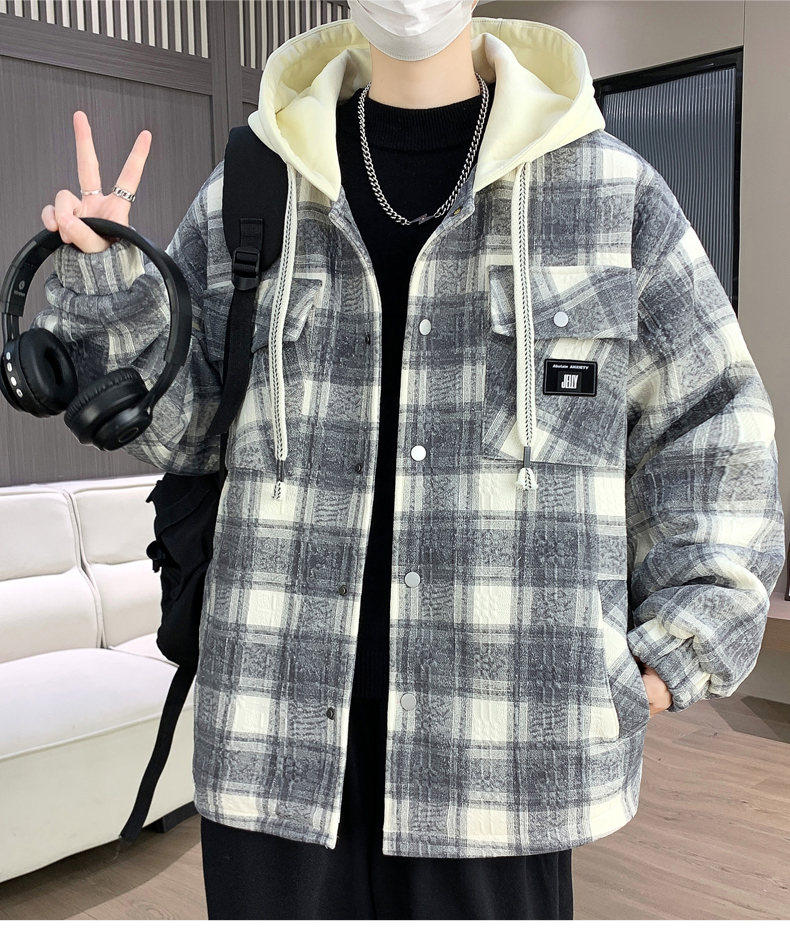 Woodpecker Design Plaid Jacket Autumn and Winter New Style Fleece-Lined Thick Stylish Jacket for Boys and Teenagers Warm Cotton Coat