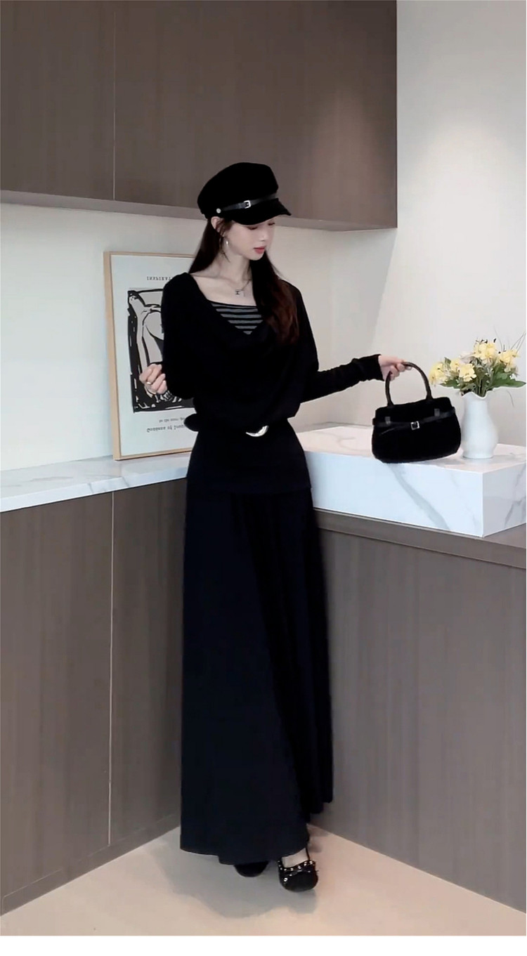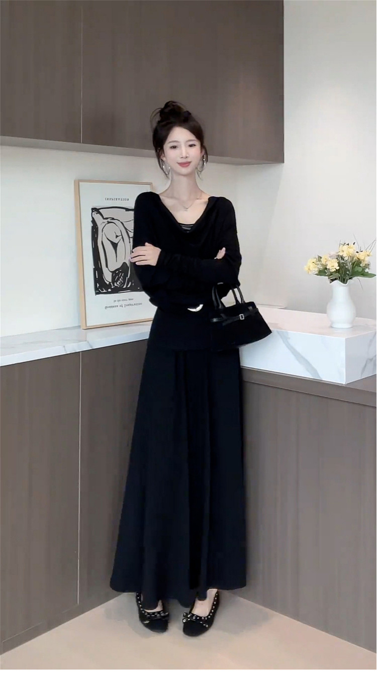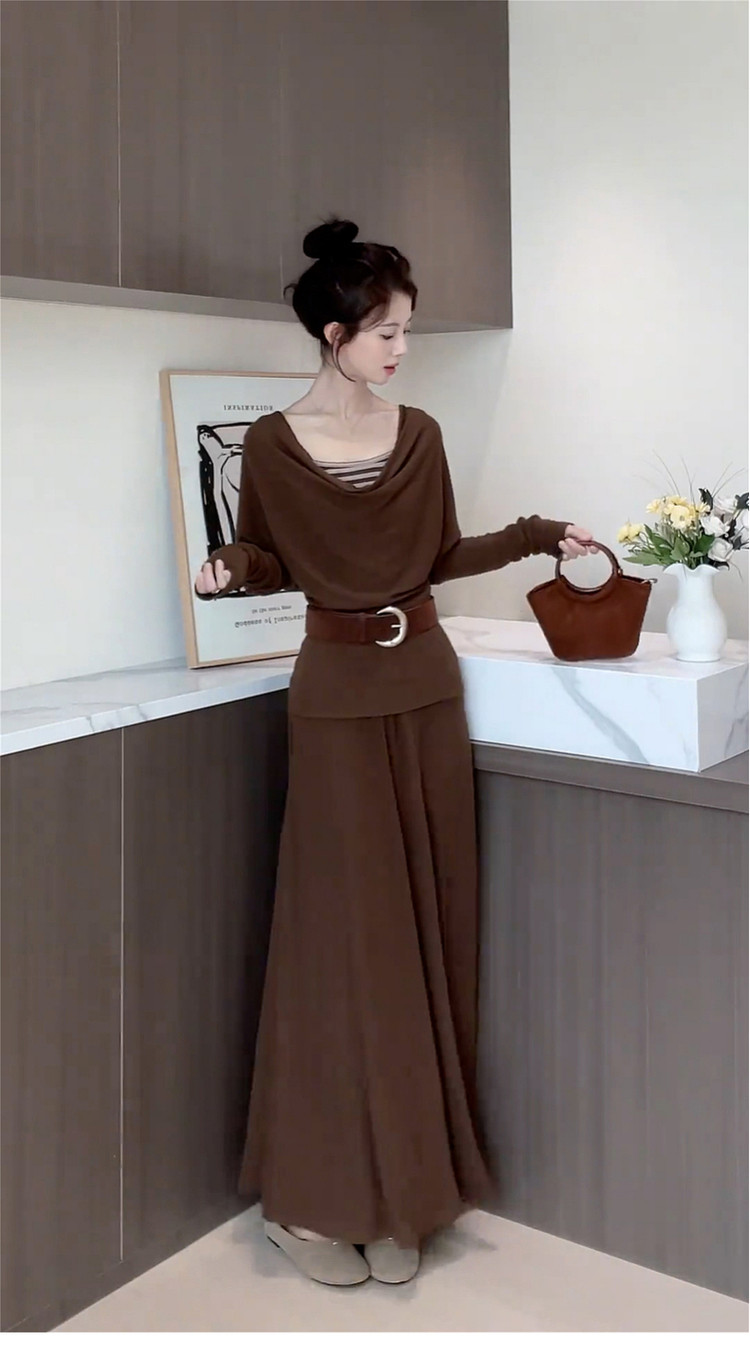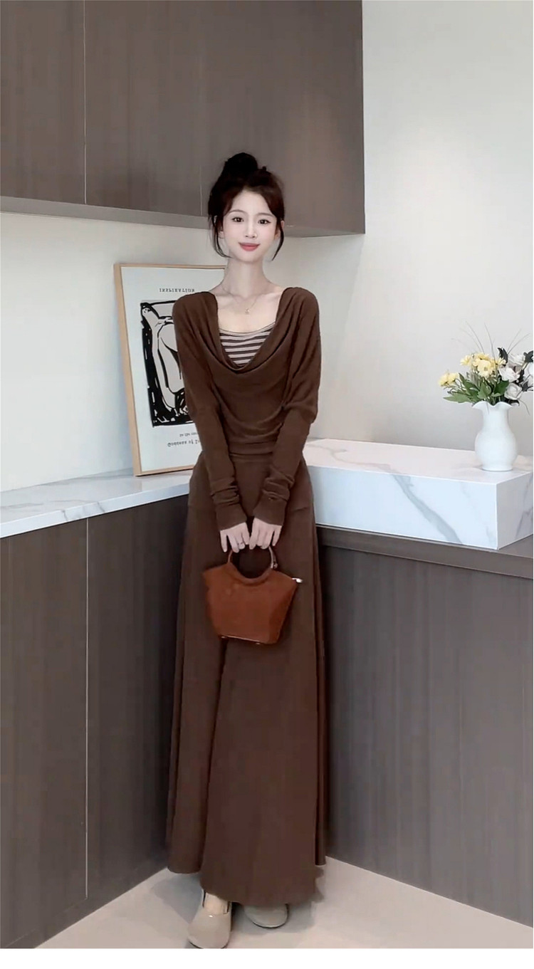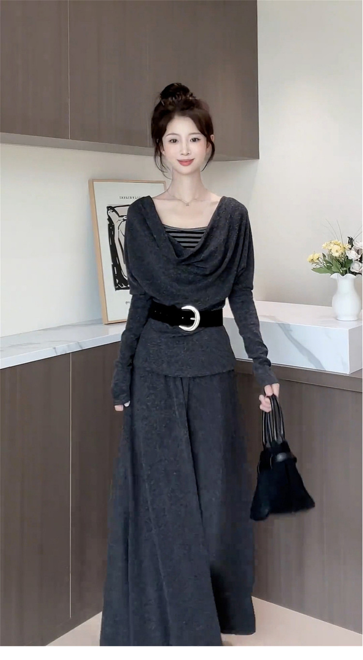 2025 New French Swing Collar Gray Knitted Suit Dress Long Skirt for Autumn and Winter Lazy and High-end Wear