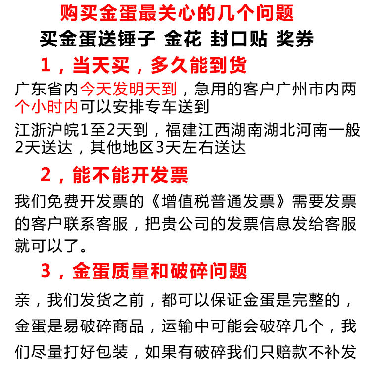 Color Classification Golden Eggs 12cm, 100 Pieces Per Box (Delivered Downstairs),Golden Eggs 12cm, 150 Pieces Per Box (Delivered Downstairs),Golden Eggs 12cm, 200 Pieces Per Box (Delivered Downstairs),Golden Eggs 15cm, 16 Pieces, 1 Hammer Included,Golden Eggs 15cm, 60 Pieces Per Box (Delivered Downstairs) Best-Selling Model,Golden Eggs 15cm, 100 Pieces Per Box (Delivered Downstairs) Best-Selling Model,Golden Eggs 18cm, 60 Pieces Per Box (Delivered Downstairs),Golden Eggs 20cm, 24 Pieces Per Box (Delivered Downstairs),Golden Eggs 20cm, 45 Pieces Per Box (Delivered Downstairs) Best-Selling Model,Golden Eggs 25cm, 30 Pieces Per Box (Delivered Downstairs),Golden Eggs 15cm, 30 Pieces Per Box (Delivered Downstairs),Red Cloth 2m *Width 1.6,Gold Cloth Length 2m * Width 1.6,3-Layer New Upgraded Poster Display Stand,3-Layer Shelf Comes with Red Cloth,Fireworks 60cm, 50 Pieces Per Box, Delivered Downstairs,Fireworks 80cm, 50 Pieces Per Box, Delivered Downstairs,100cm Salute (50 Pieces) Per Box,1 Hammer, 3 Packs of Gold Flowers, 200 Sealing Stickers, 200 Lottery Tickets