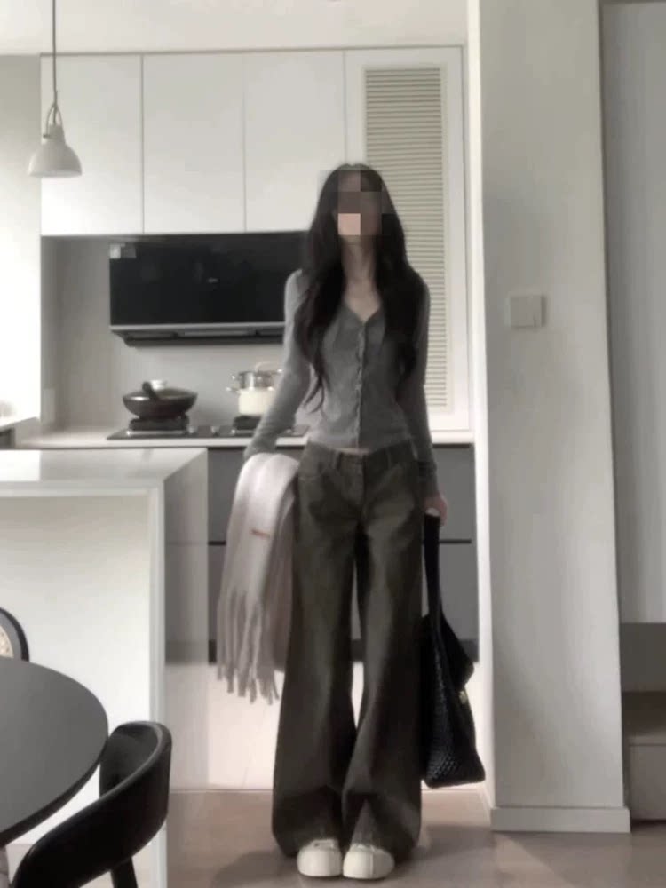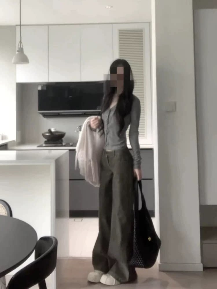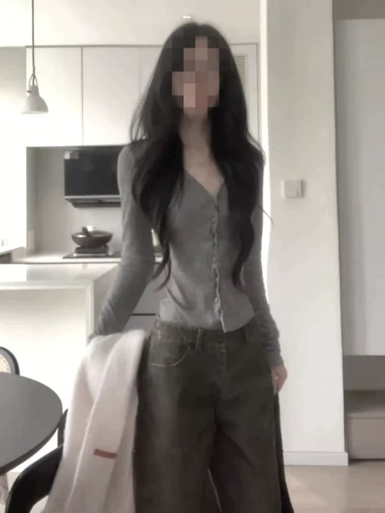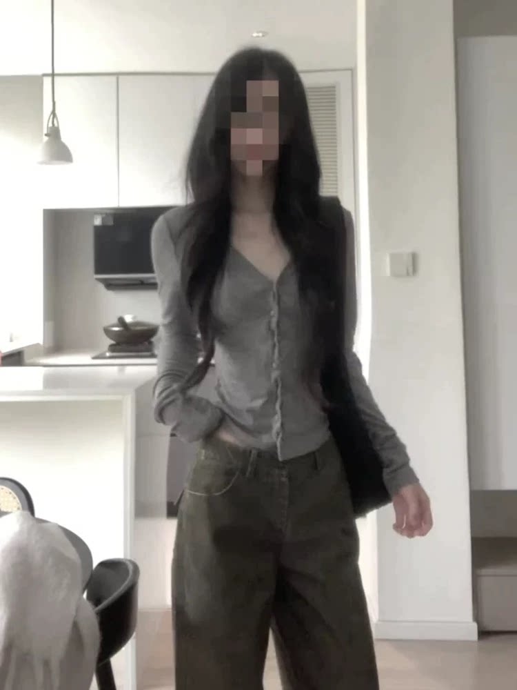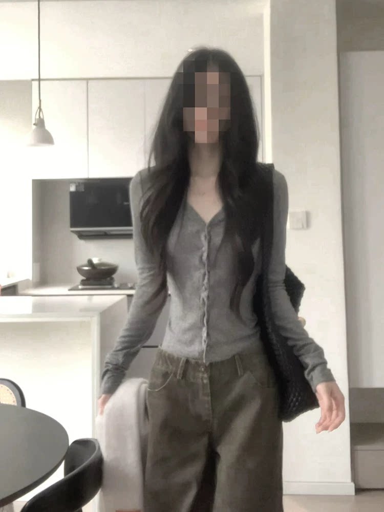 Korean-Style Elegant Design Button V-Neck Long-Sleeve T-Shirt for Women, Gray Slim-Fit Slimming Top, Versatile Outerwear Base Shirt