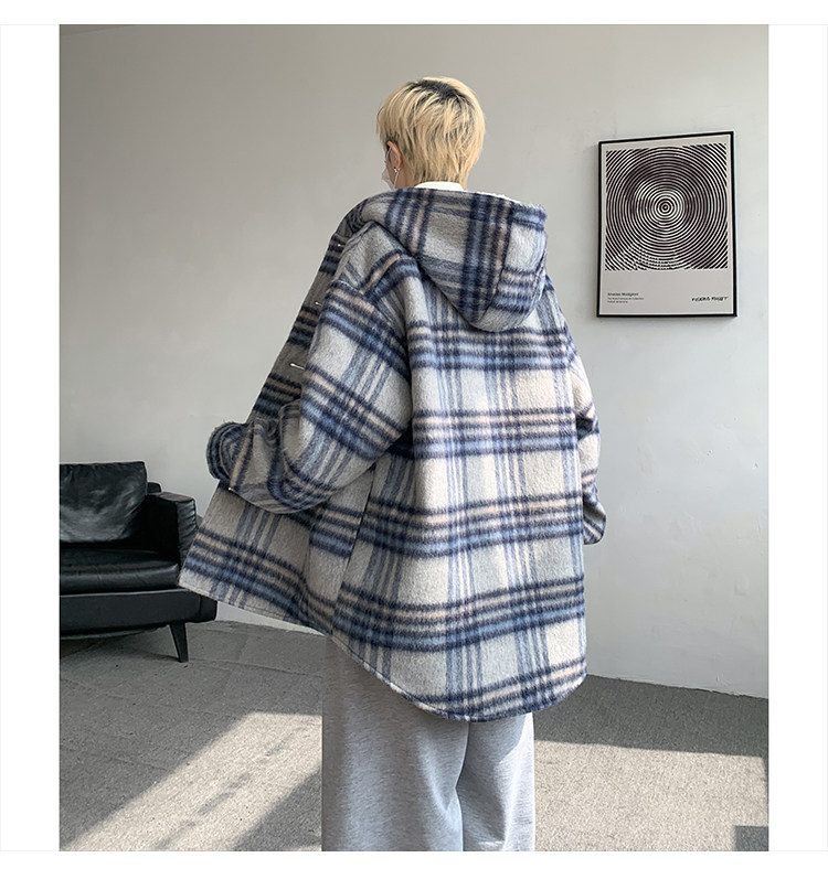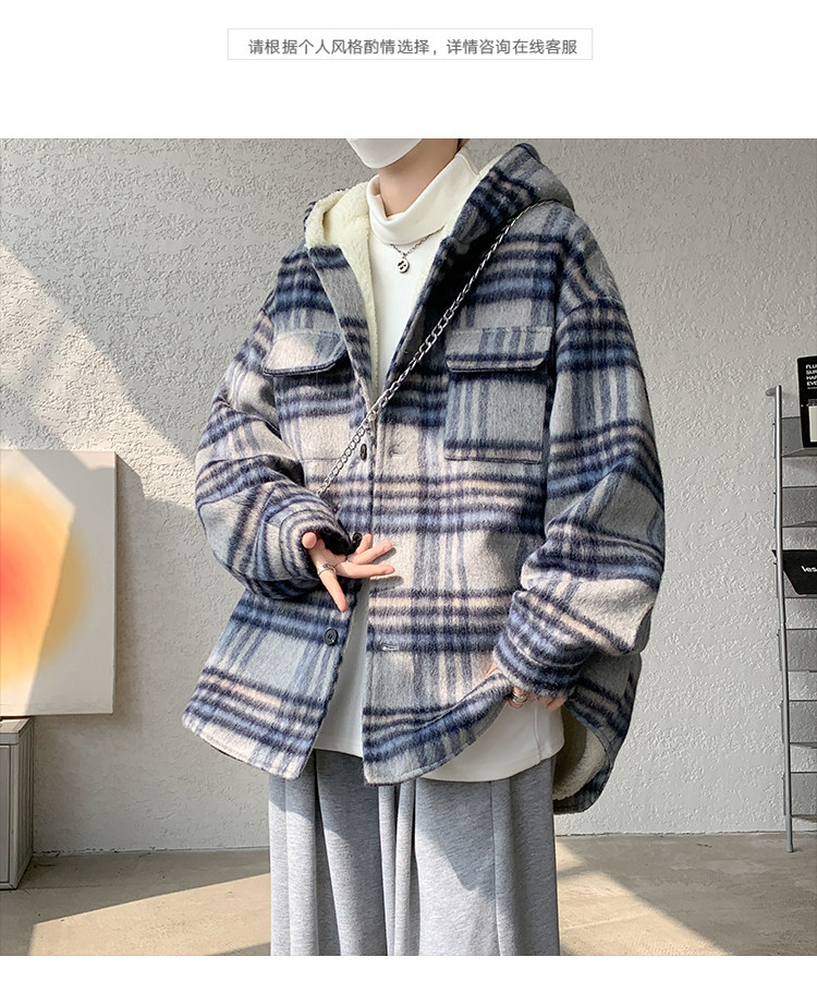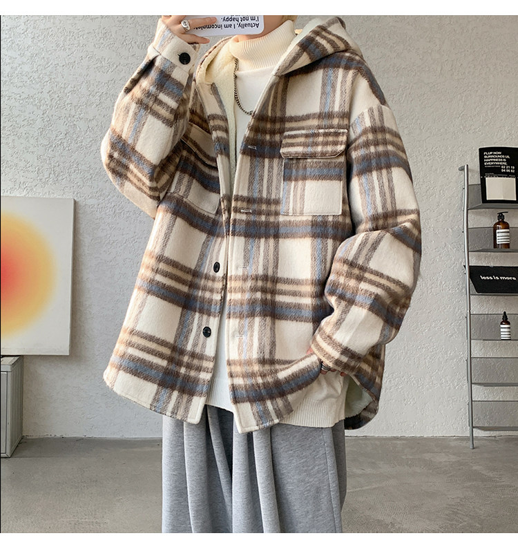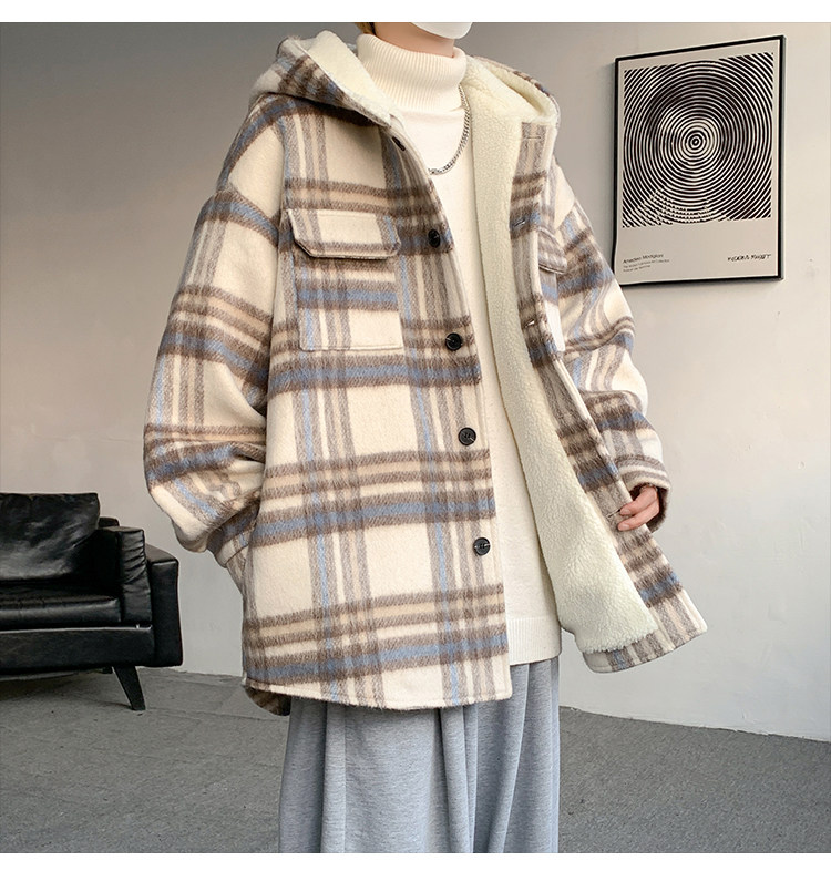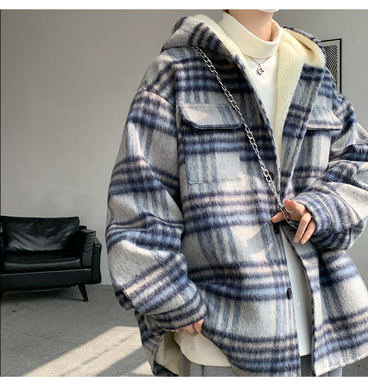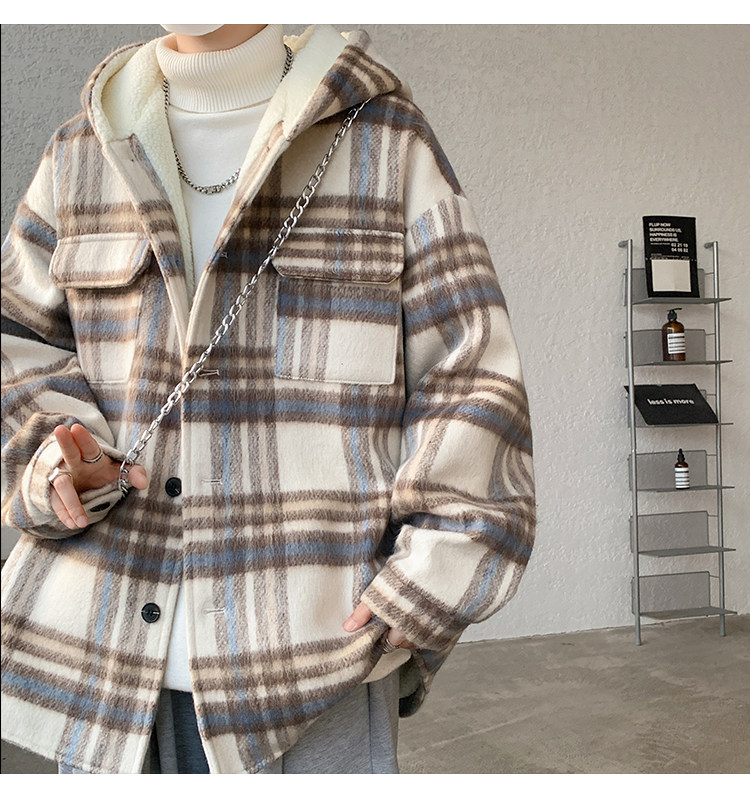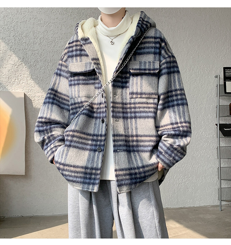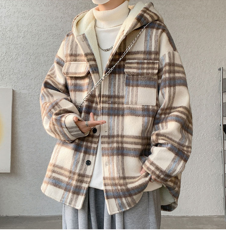Plaid Woolen Jacket for Men, Autumn and Winter, Fleece-Lined and Thickened, Hooded Lamb Wool Jacket, Men's Casual Cotton Coat in a Chanel Style