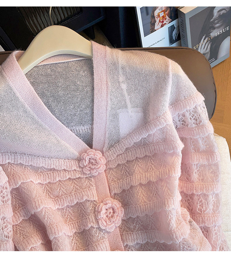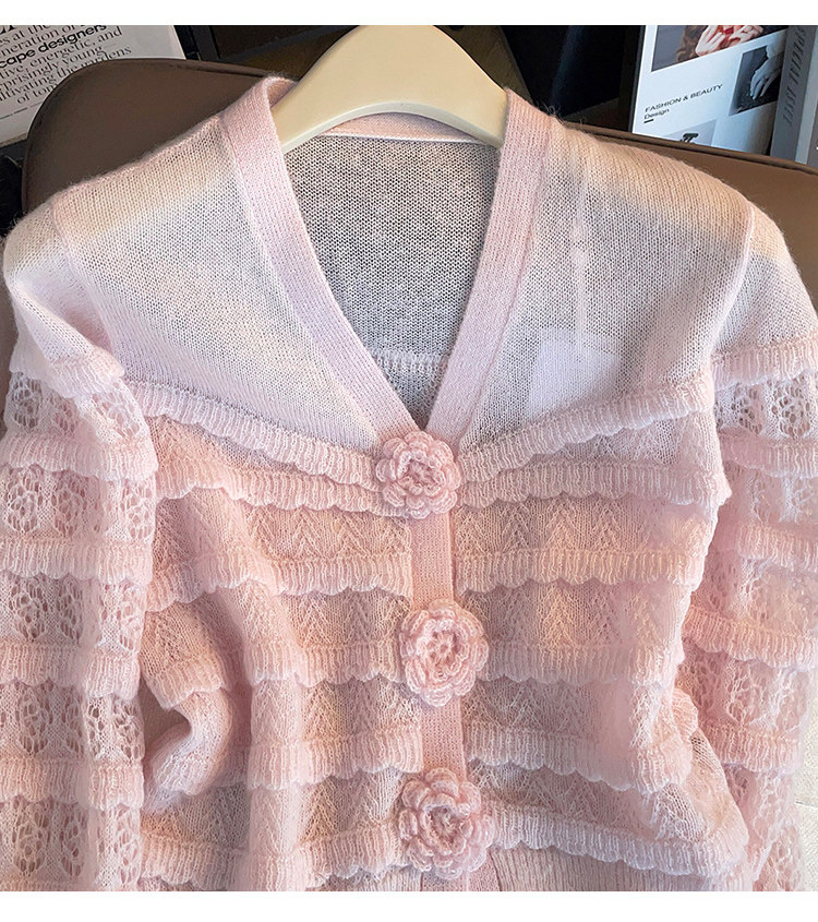 2025 Super Stylish Pink V-Neck Knitted Cardigan with Exquisite 3D Floral Design, Unique and Beautiful Long-Sleeve Top