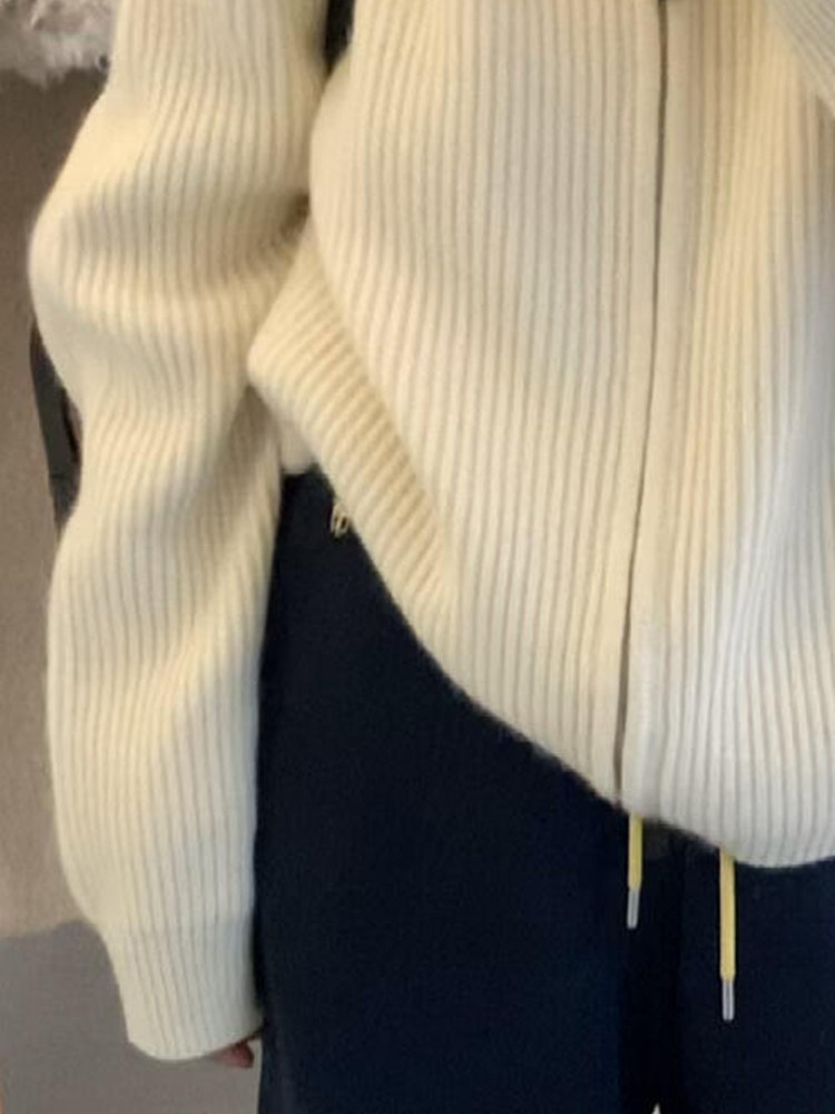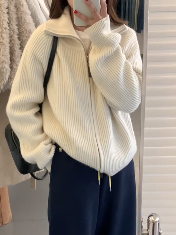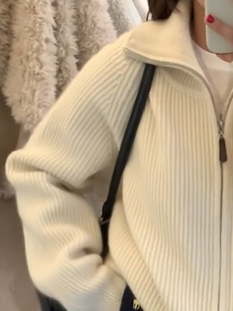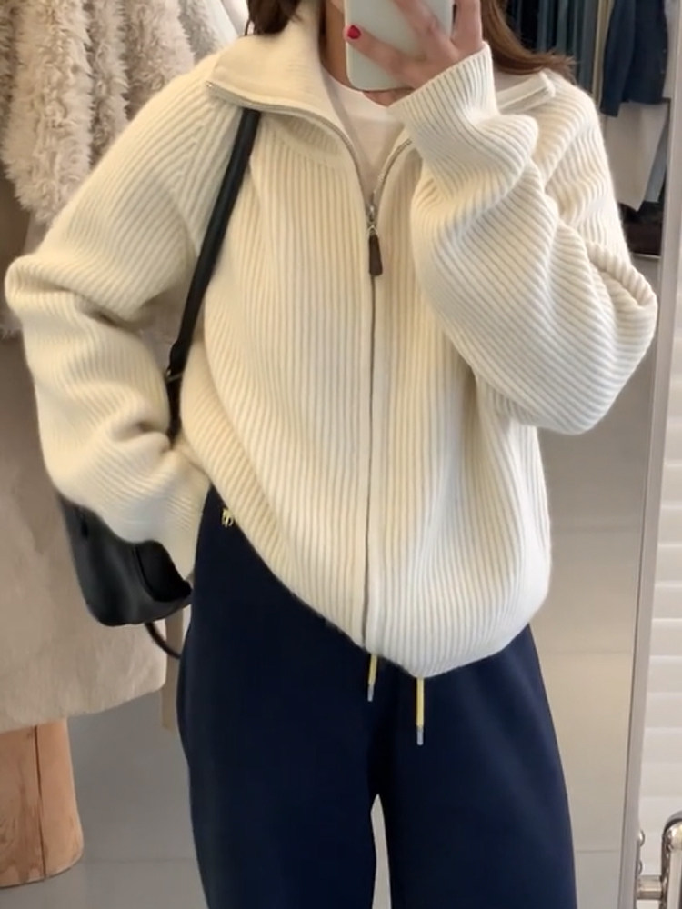 Thickened Atmosphere-Style Double-Zipper Lapel Sweater Coat for Women, Autumn and Winter Loose High-Neck Warm Knitted Cardigan Top