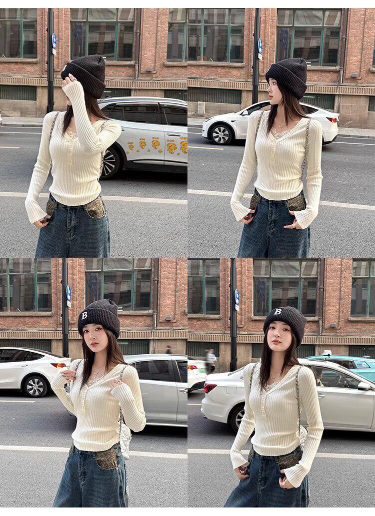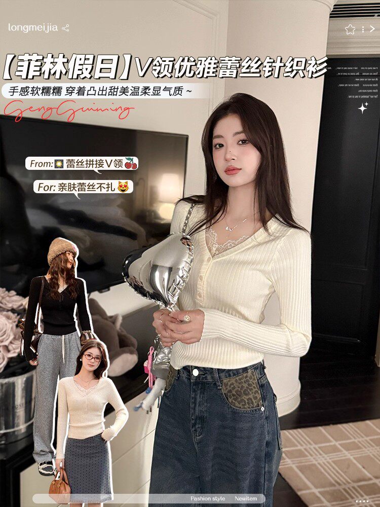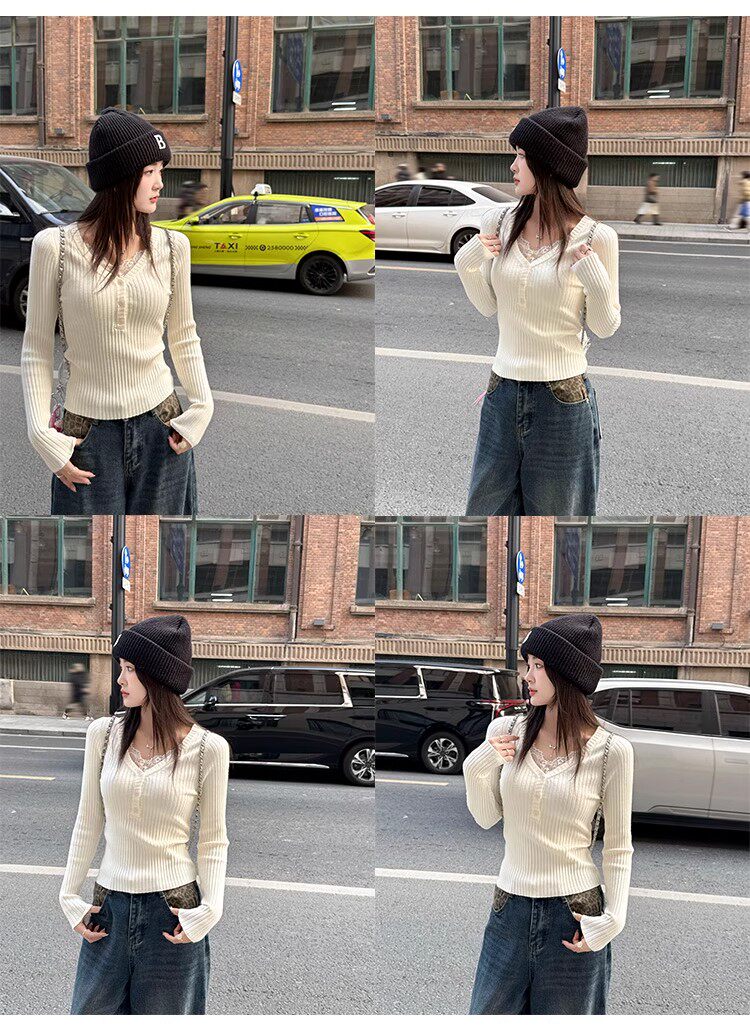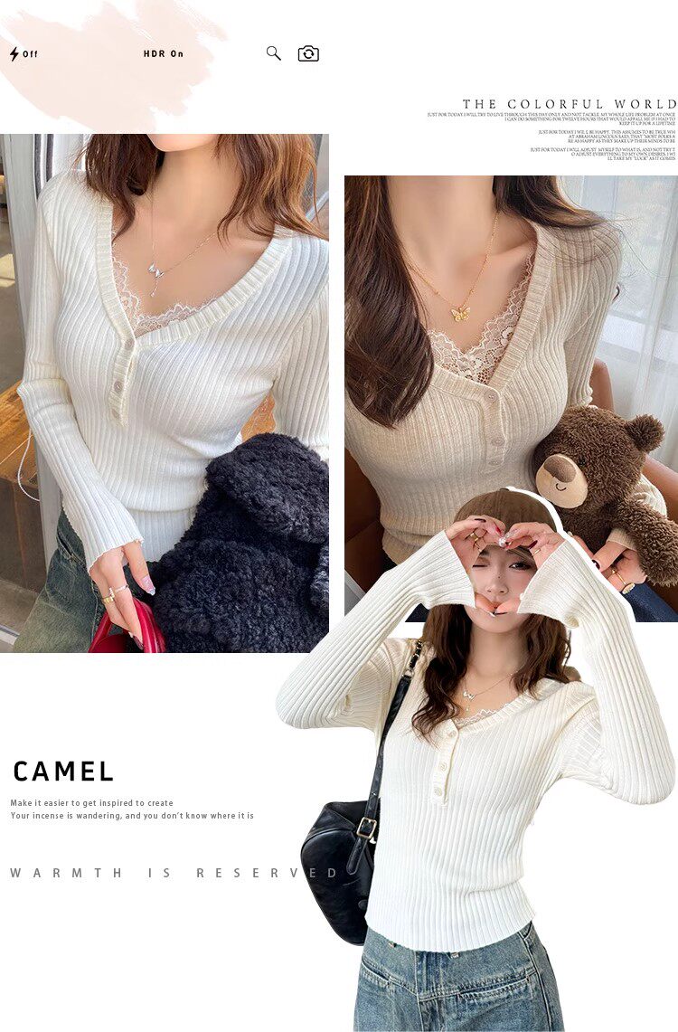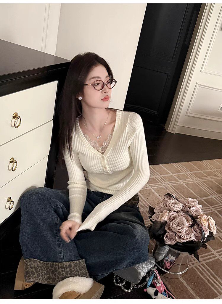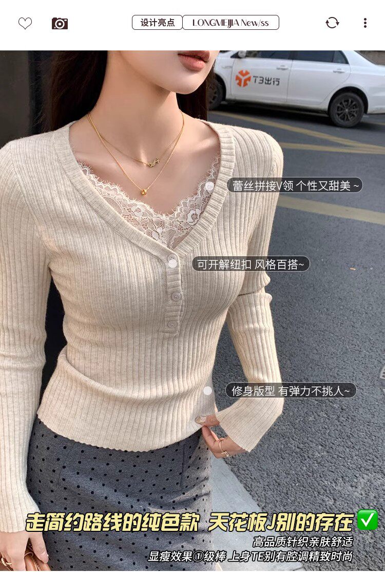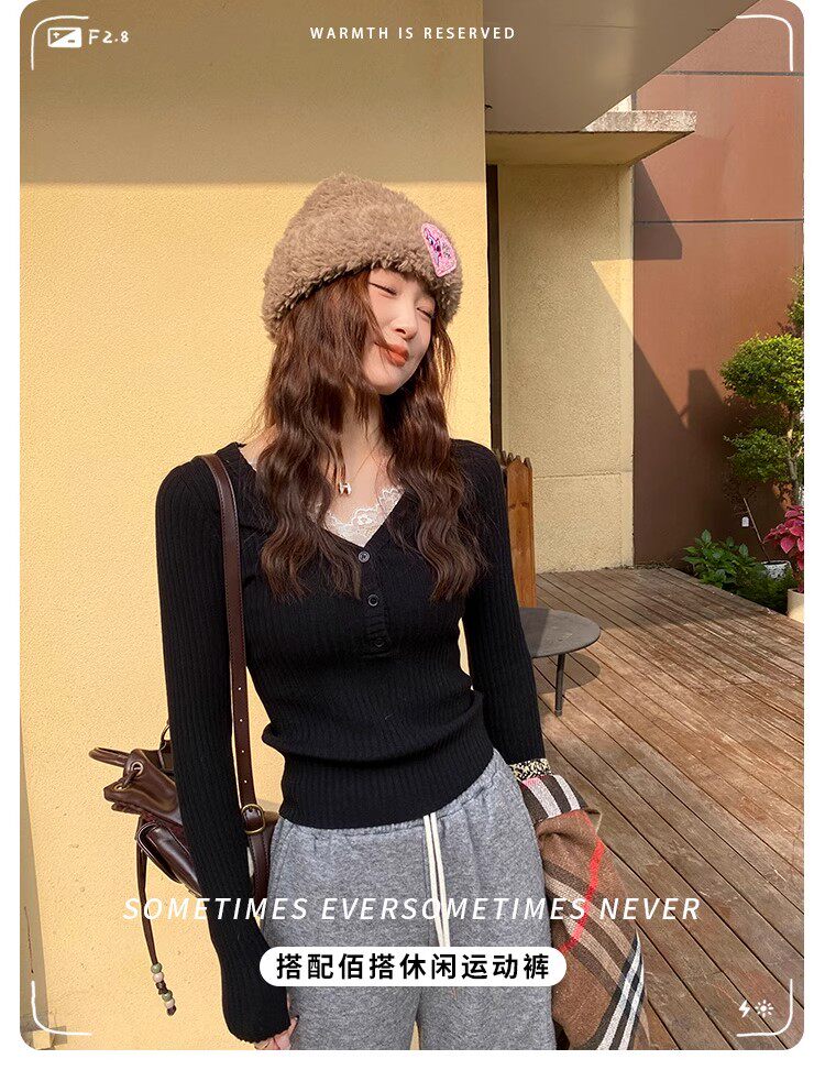 Fake Two-Piece Lace Trim Patchwork Knit Top for Women, Autumn and Winter Pure Desire Style, Spicy Girl V-Neck Long-Sleeve Inner Wear