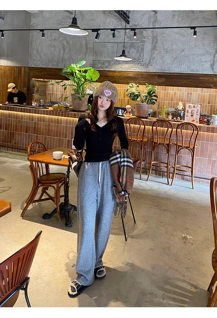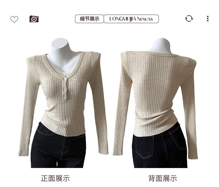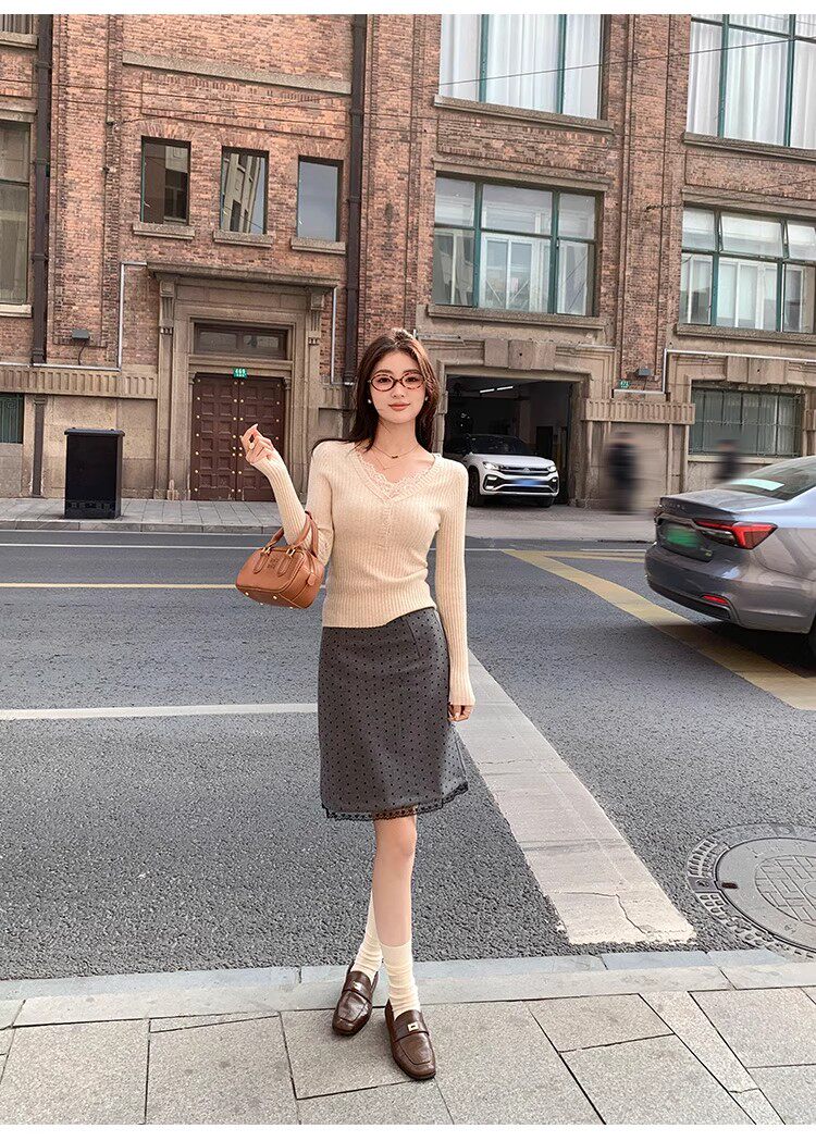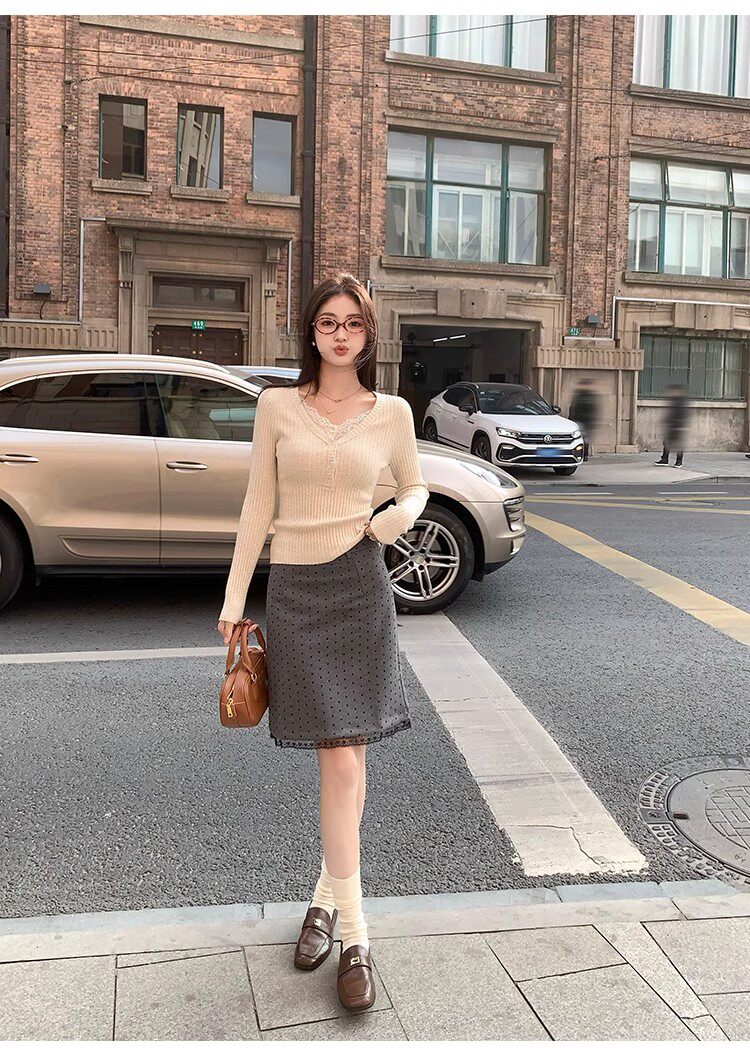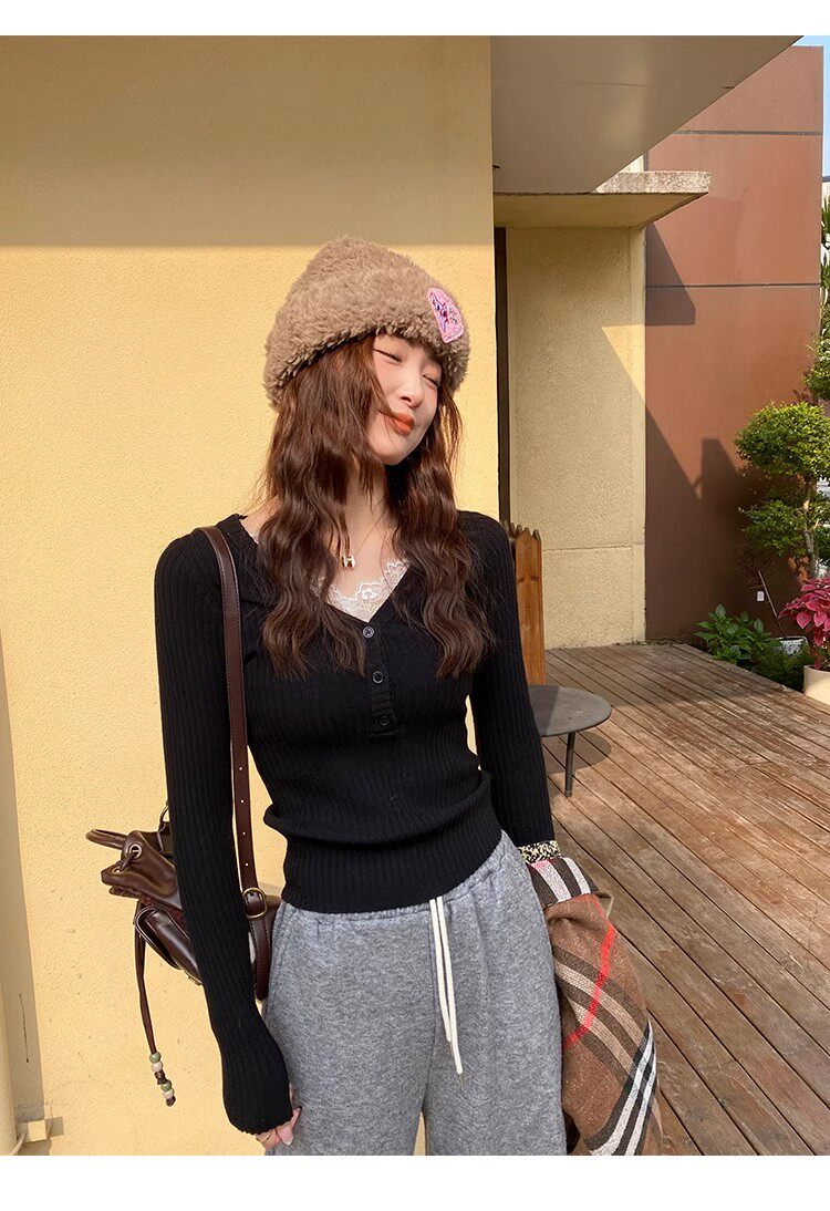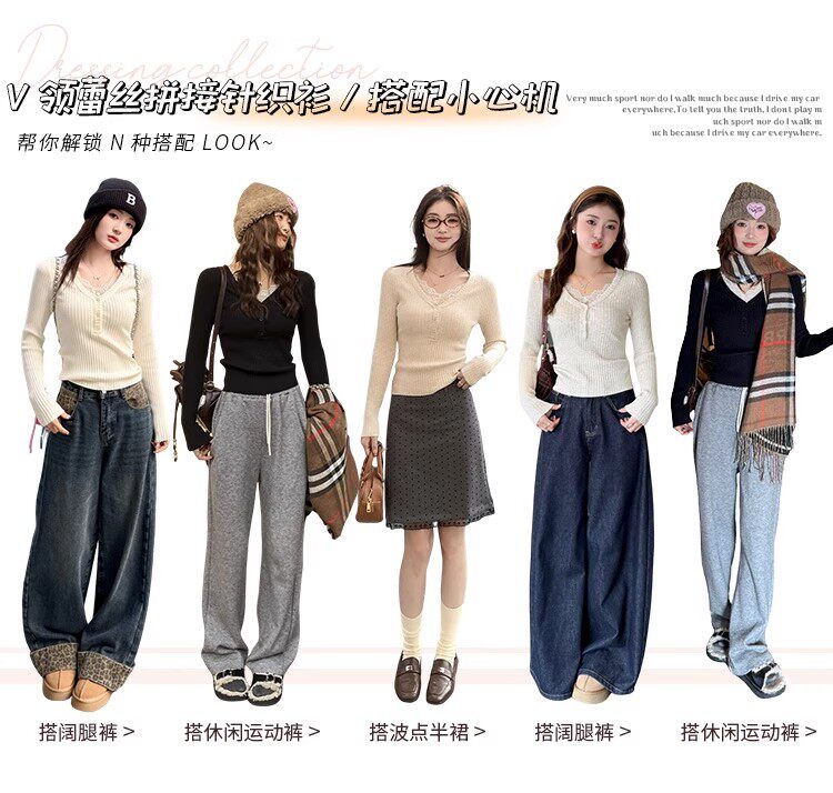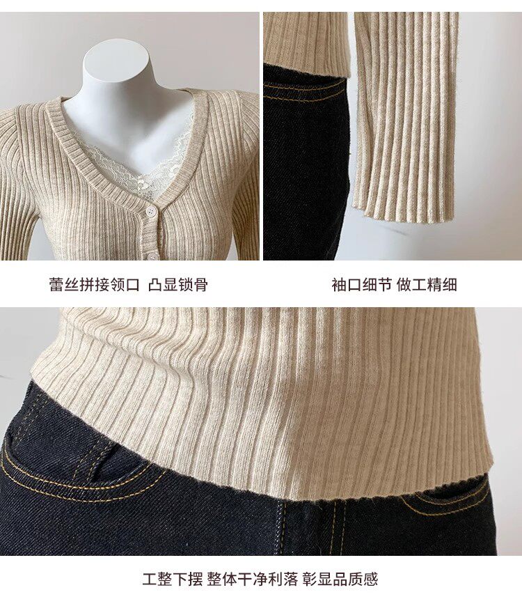 Fake Two-Piece Lace Trim Patchwork Knit Top for Women, Autumn and Winter Pure Desire Style, Spicy Girl V-Neck Long-Sleeve Inner Wear